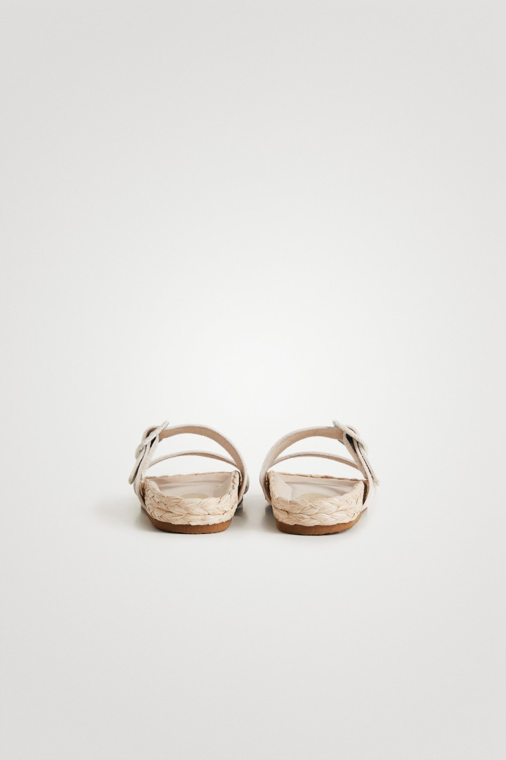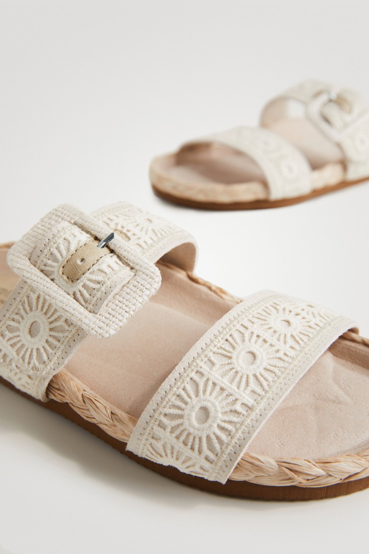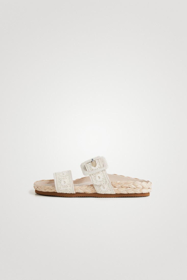 Natural fibers and crochet details give this flat sandal a summer touch. With two wide, very comfortable straps and buckle closure. Padded microfiber sole and braided jute details.