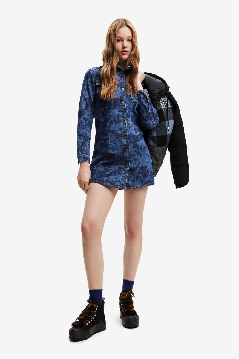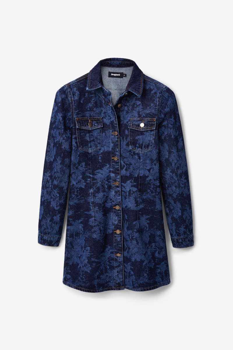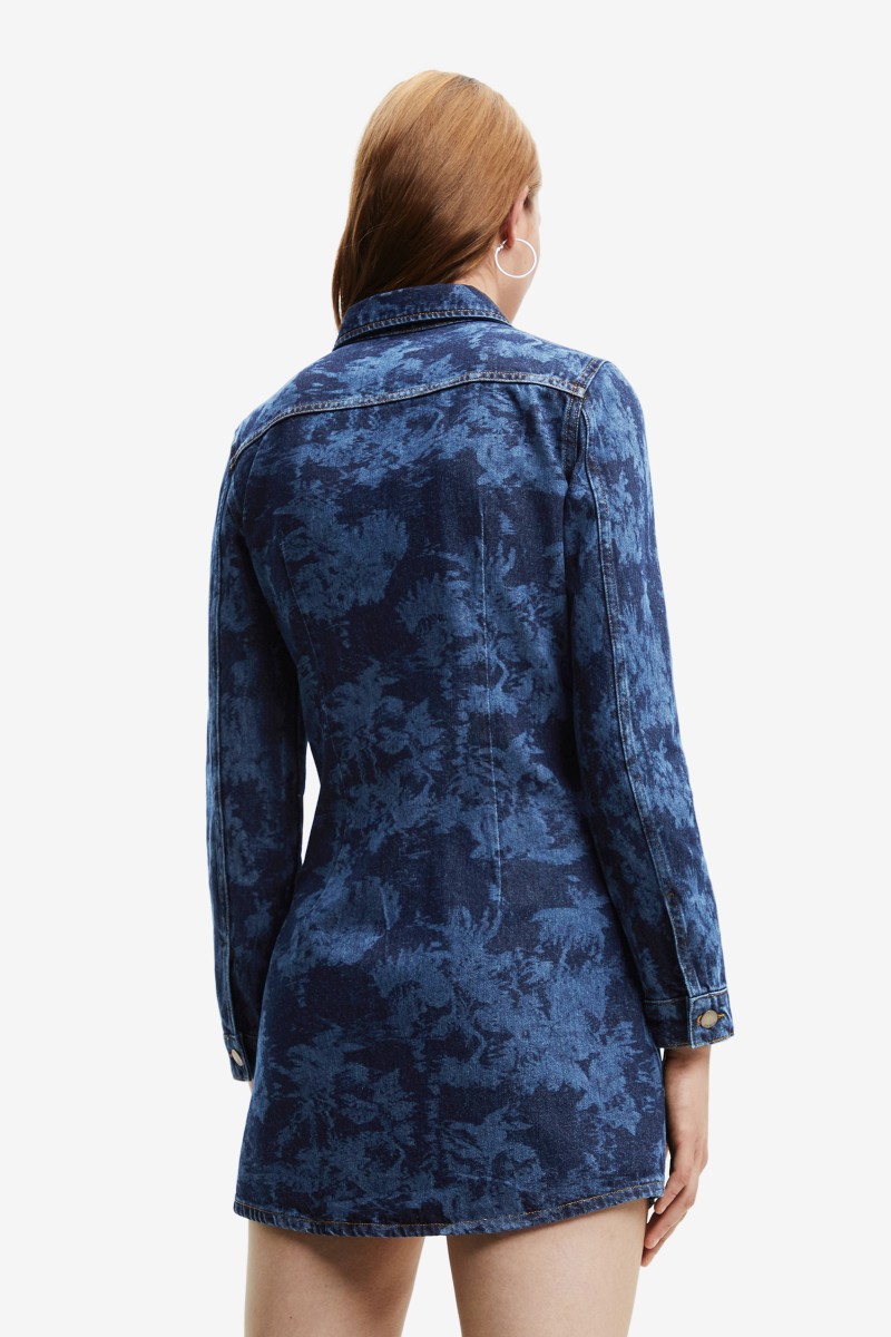 Tyto džínové košilové šaty úzkého střihu s mini délkou sukně a tropickým laserovým potiskem jsou vyrobeny z bavlny a zapínají se vpředu na knoflíky.