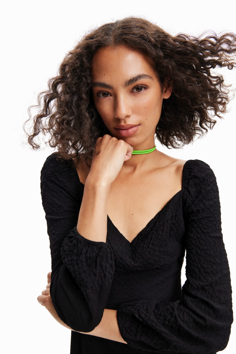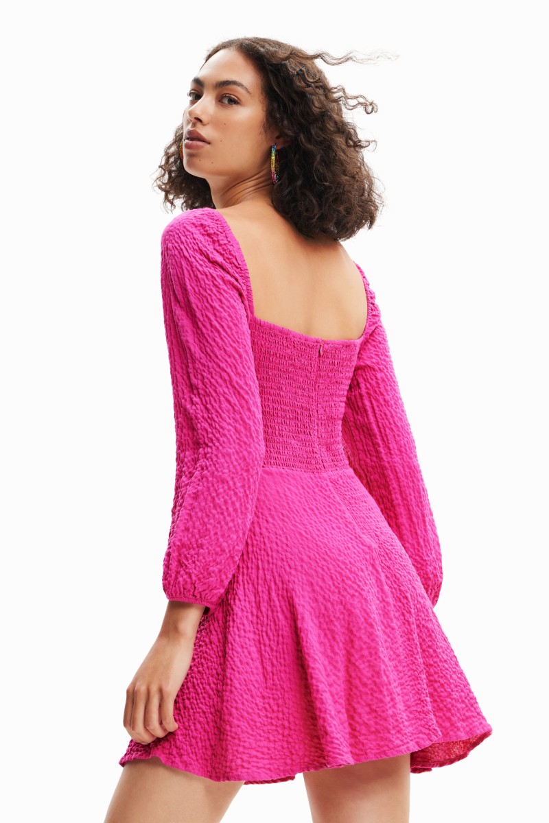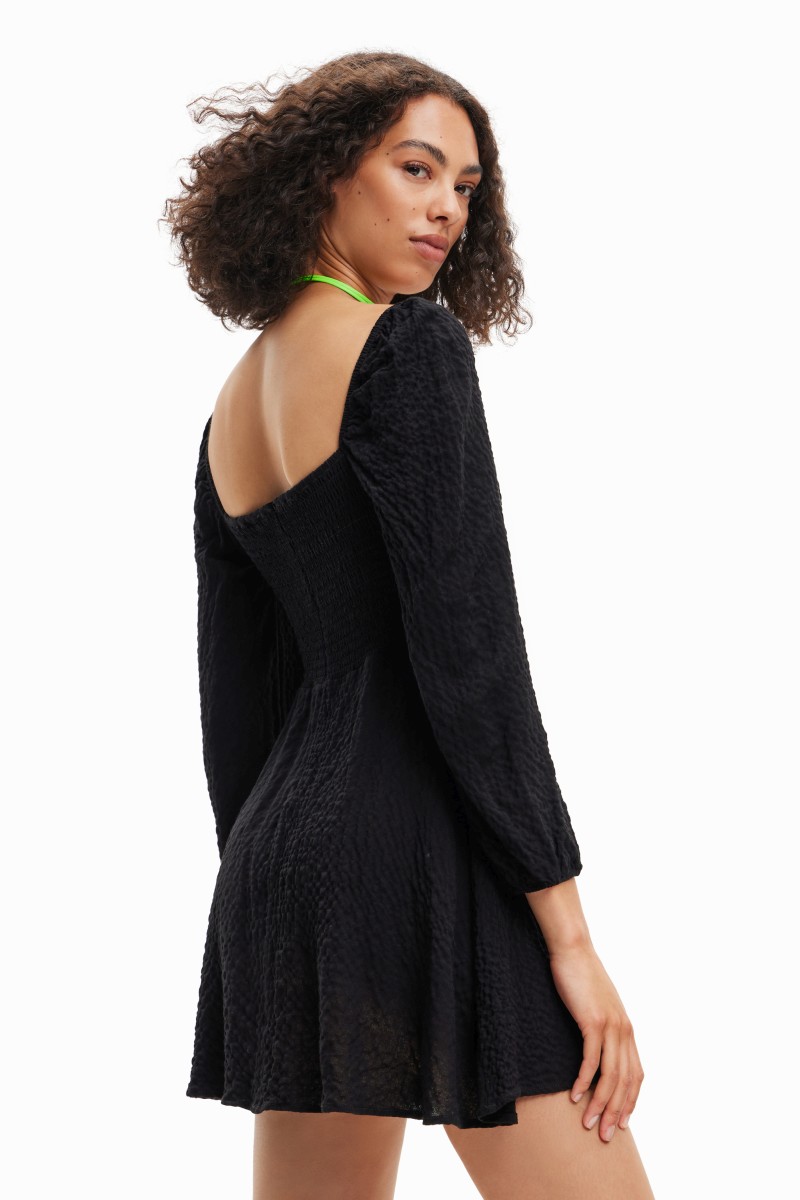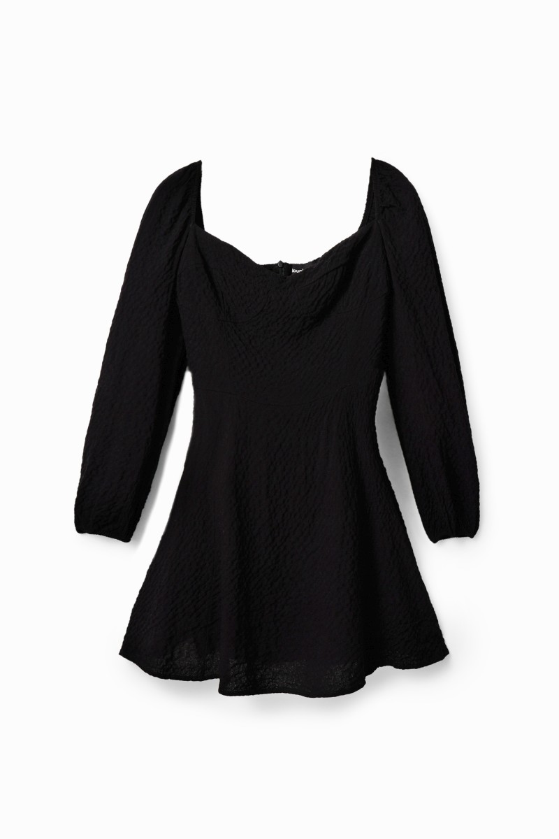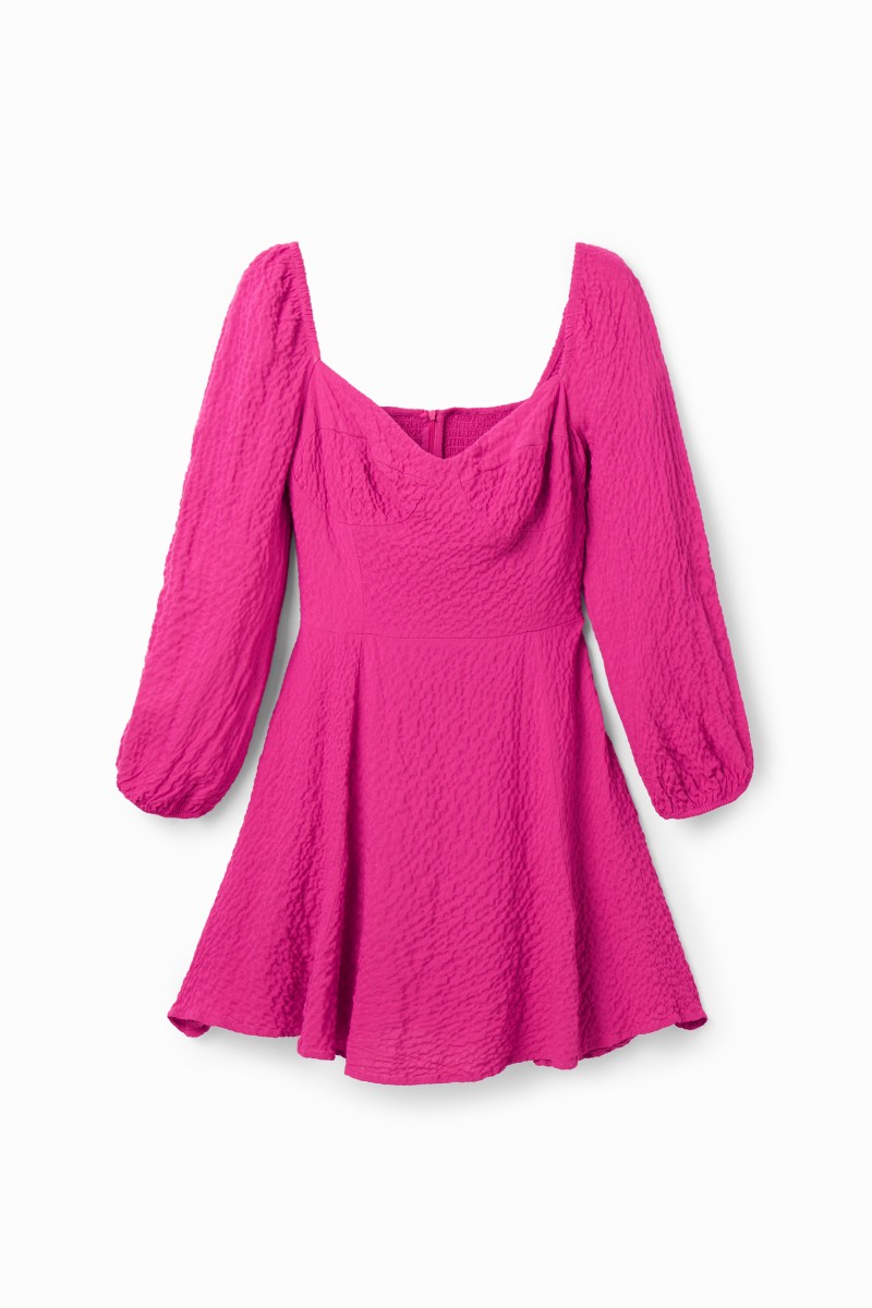 Krátké šaty s dlouhými nabíranými rukávy, vypasovaným vrchem s košíčky a áčkovou sukní. Ze strukturované látky s mačkaným efektem.