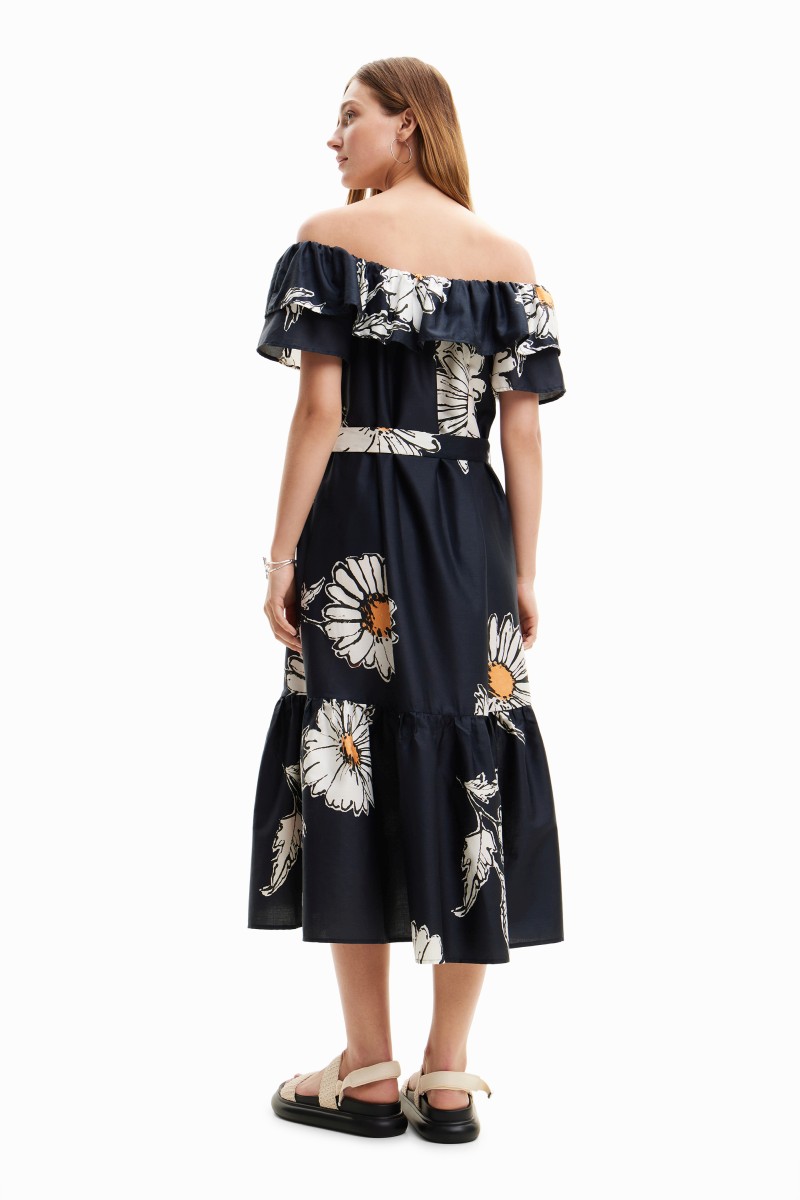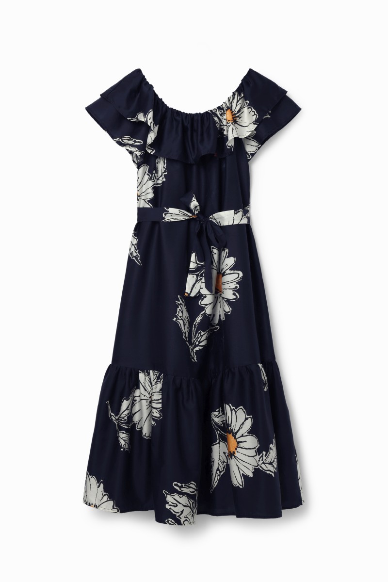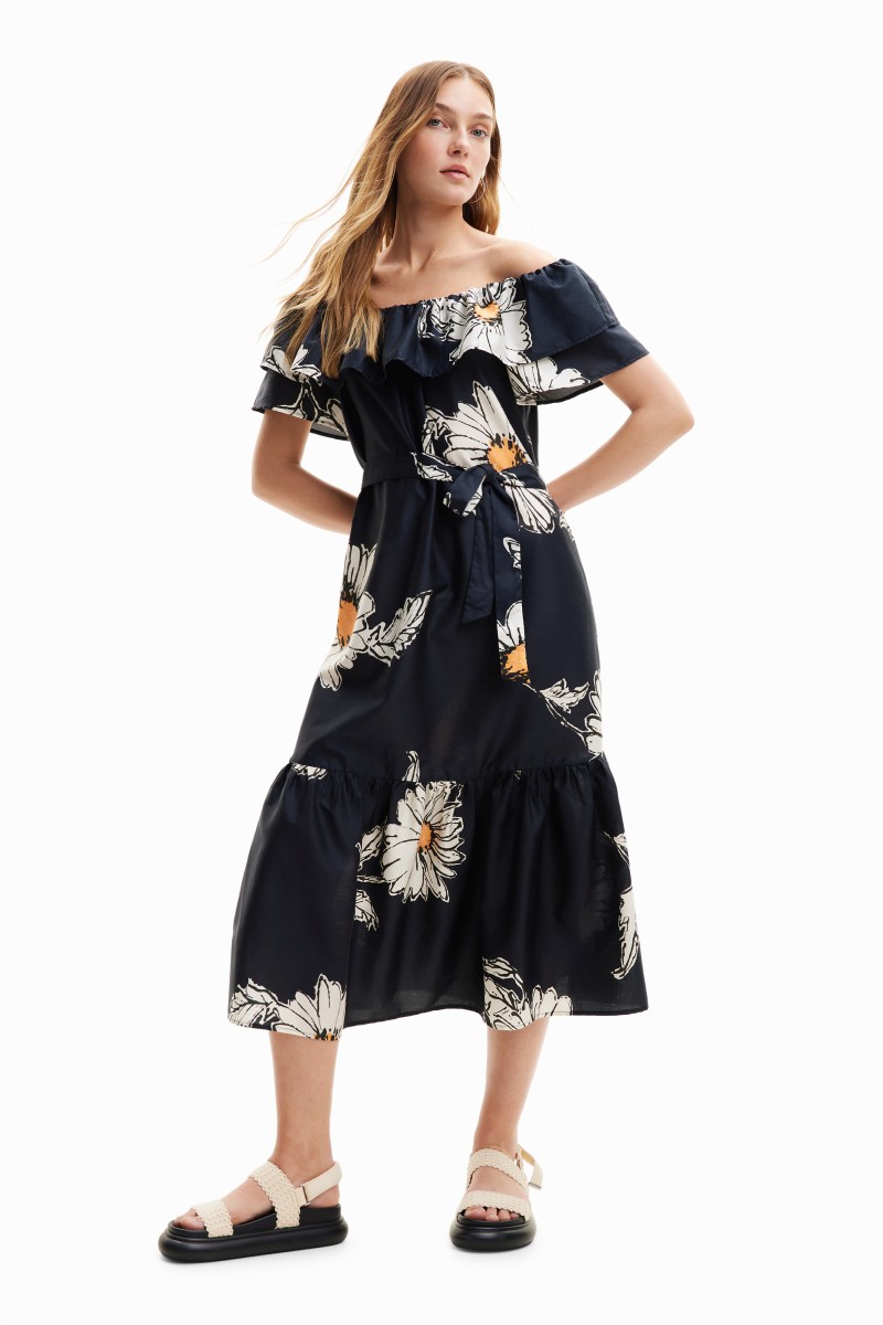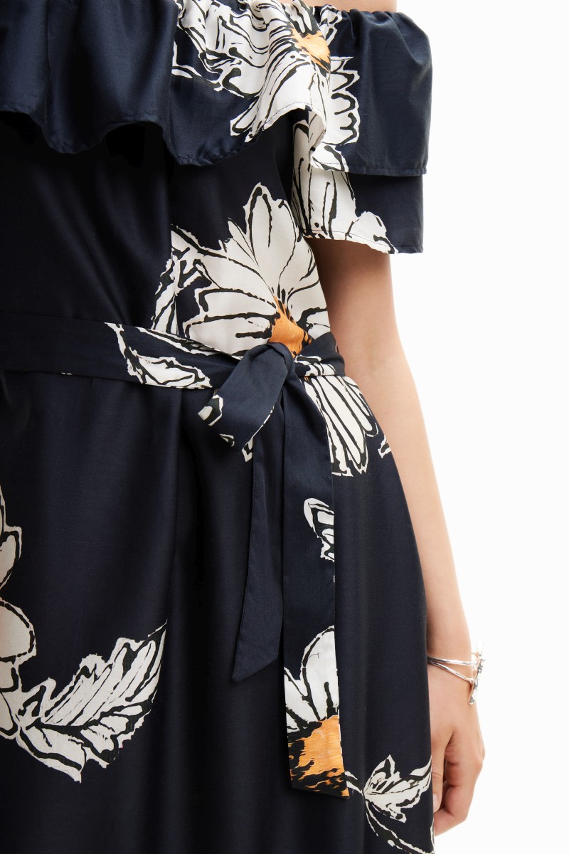 MIDI dress with short sleeves with ruffle above, cold shoulders, belt and print.