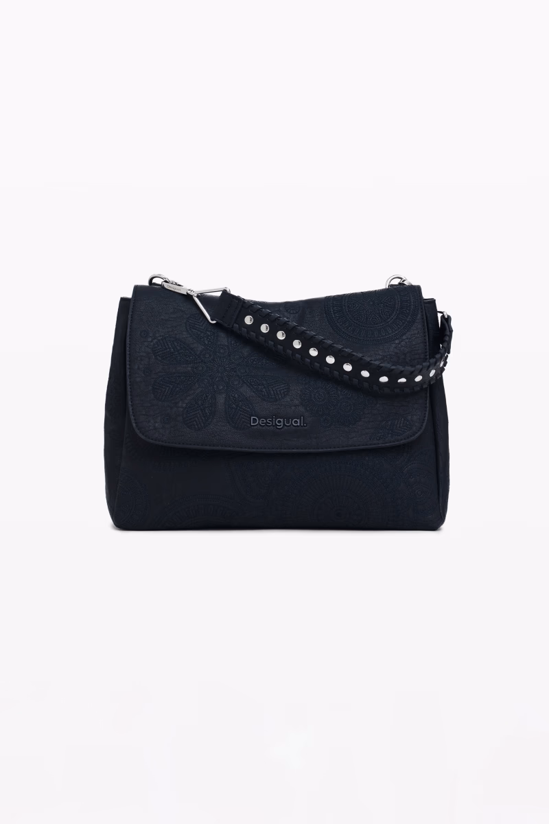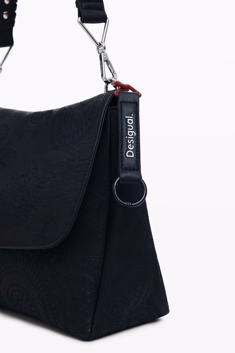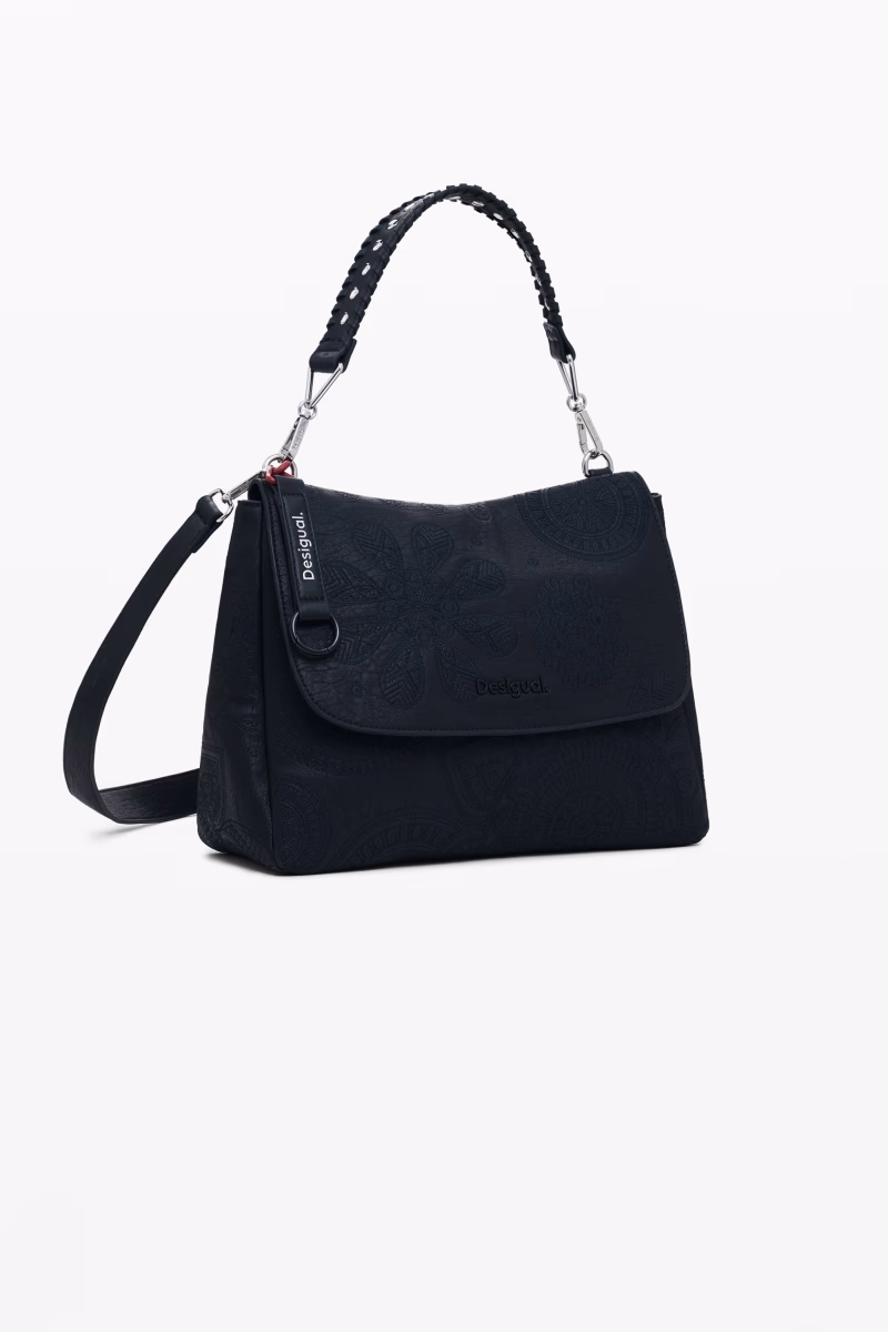 Handbag with leather effect, which can be converted into a backpack, with flap fastening, rear outer pocket and removable key pendant in monochrome with embroidered motifs.