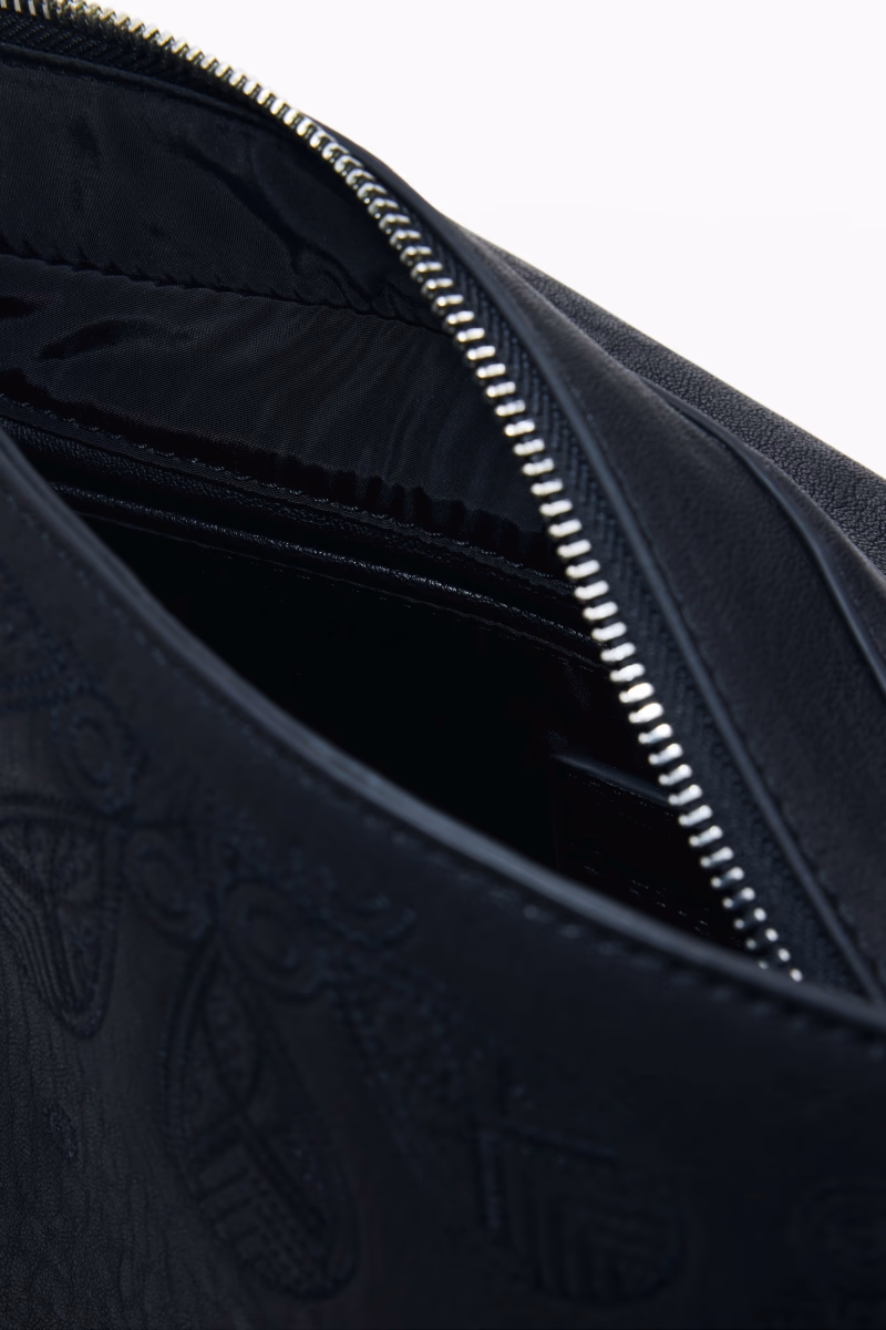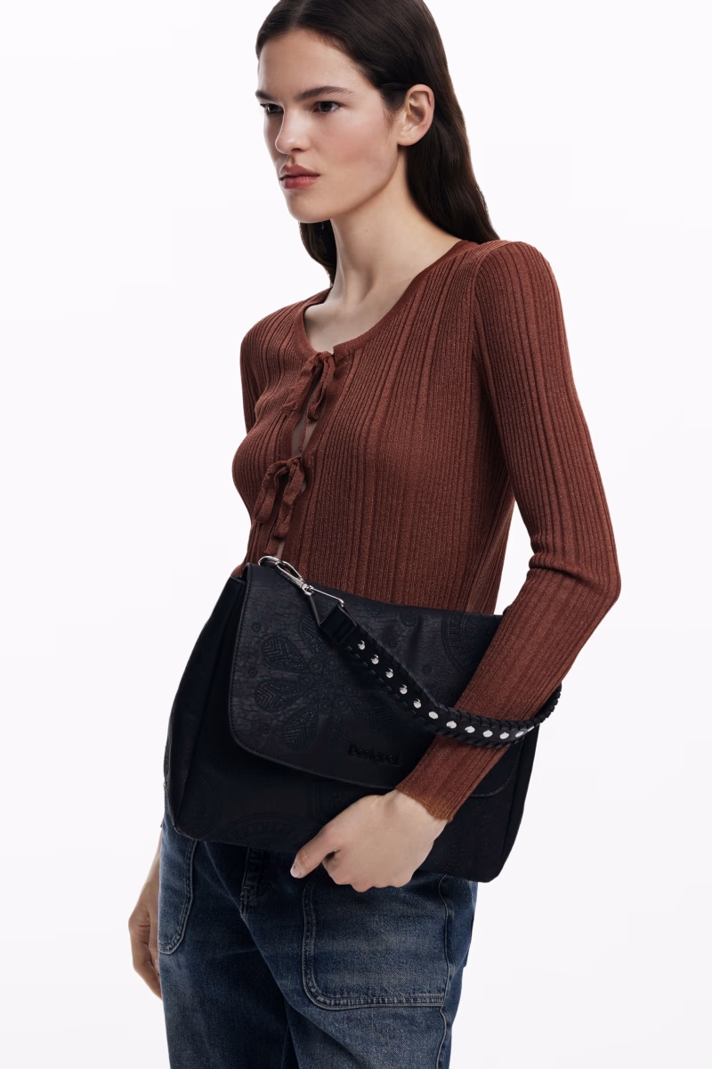 Kabelka s efektem kůže, kterou lze přeměnit na batoh, s klopovým zapínáním, zadní vnější kapsou a odnímatelným přívěskem na klíče v jednobarevném provedení s vyšívanými motivy.