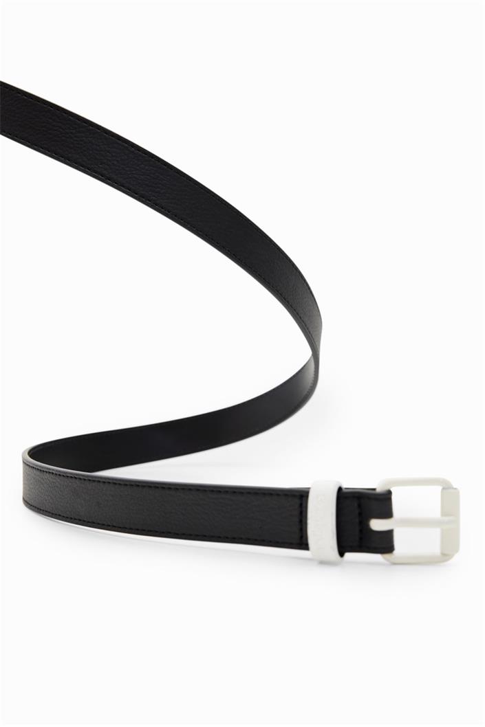 Smooth leather effect belt with texture and contrasting metal buckle.