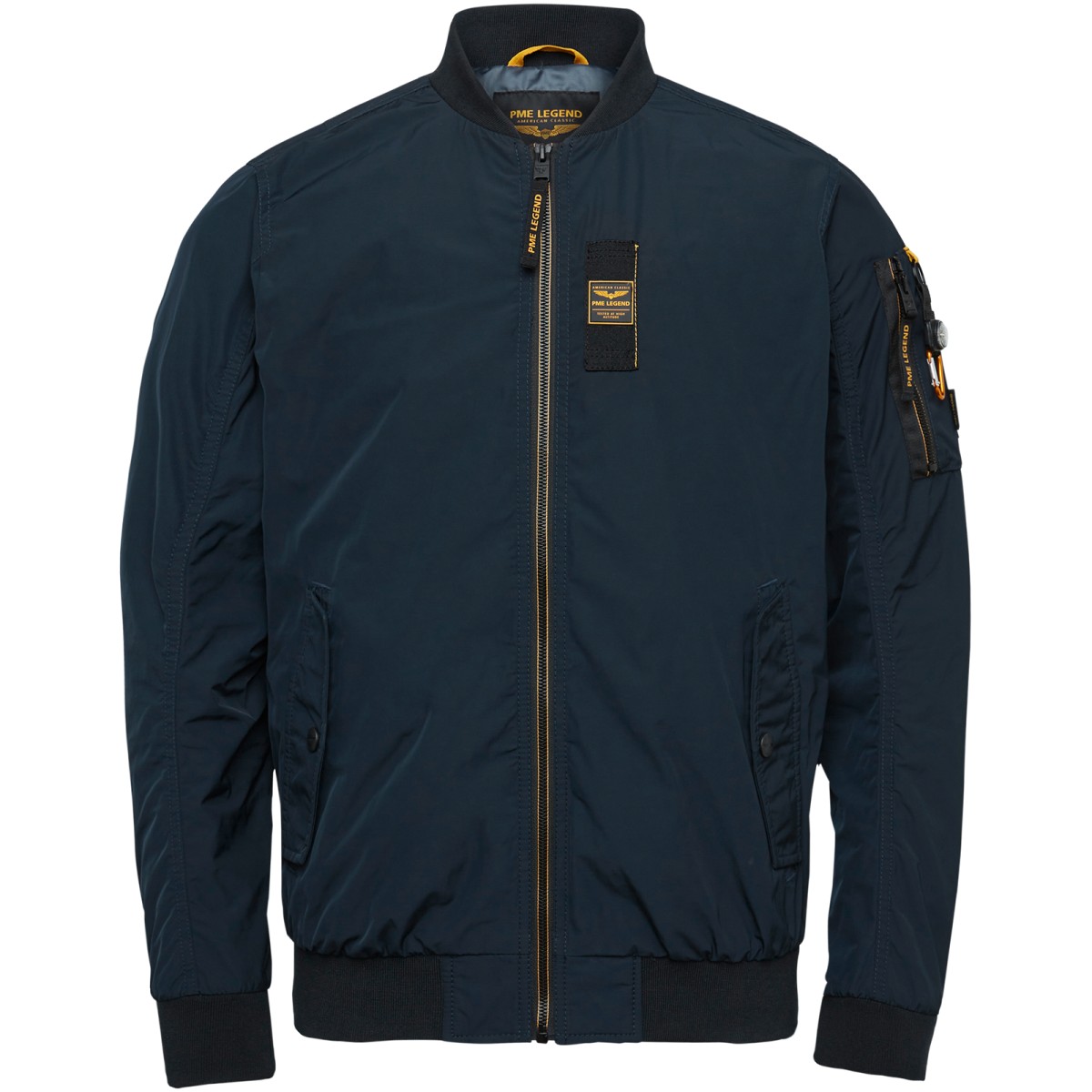 The PME Legend Glazer is a crossover between an authentic MA-1 Navy flight jacket and a cargo flight-inspired jacket. The jacket is made of an authentic memory twill polyester. The twill structure is extra strong and durable and has a water-repellent finish. Authentic flight jacket details, such as a pencil pocket on the left sleeve, engineered sleeves and a detachable keychain, add the finishing touches.