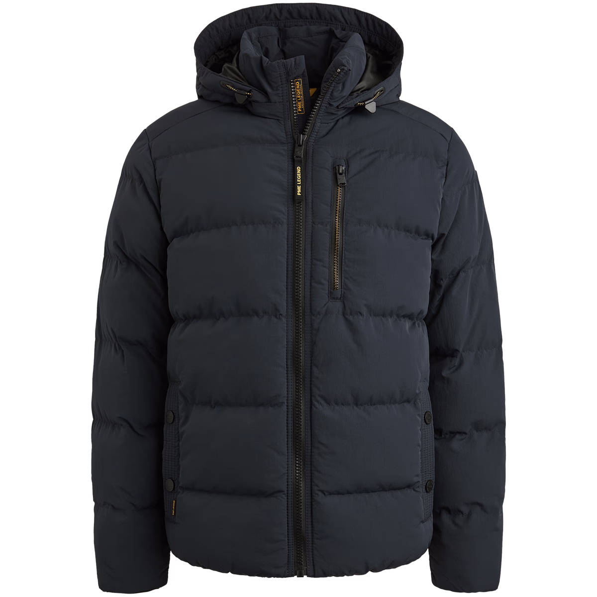 PME Legend Brewster is a durable quilted jacket made of water -repellent nylon. The Tech Down filling fills with heat and comfort. The removable, adjustable hood offers flexibility and protection in any weather, while the elastic waist protects from the cold. The jacket has a zipper pocket and a detachable keychain, two side pockets with a fleece lining and an inner zippered pocket. The characteristic details of PME legends complete the appearance of the jacket.
