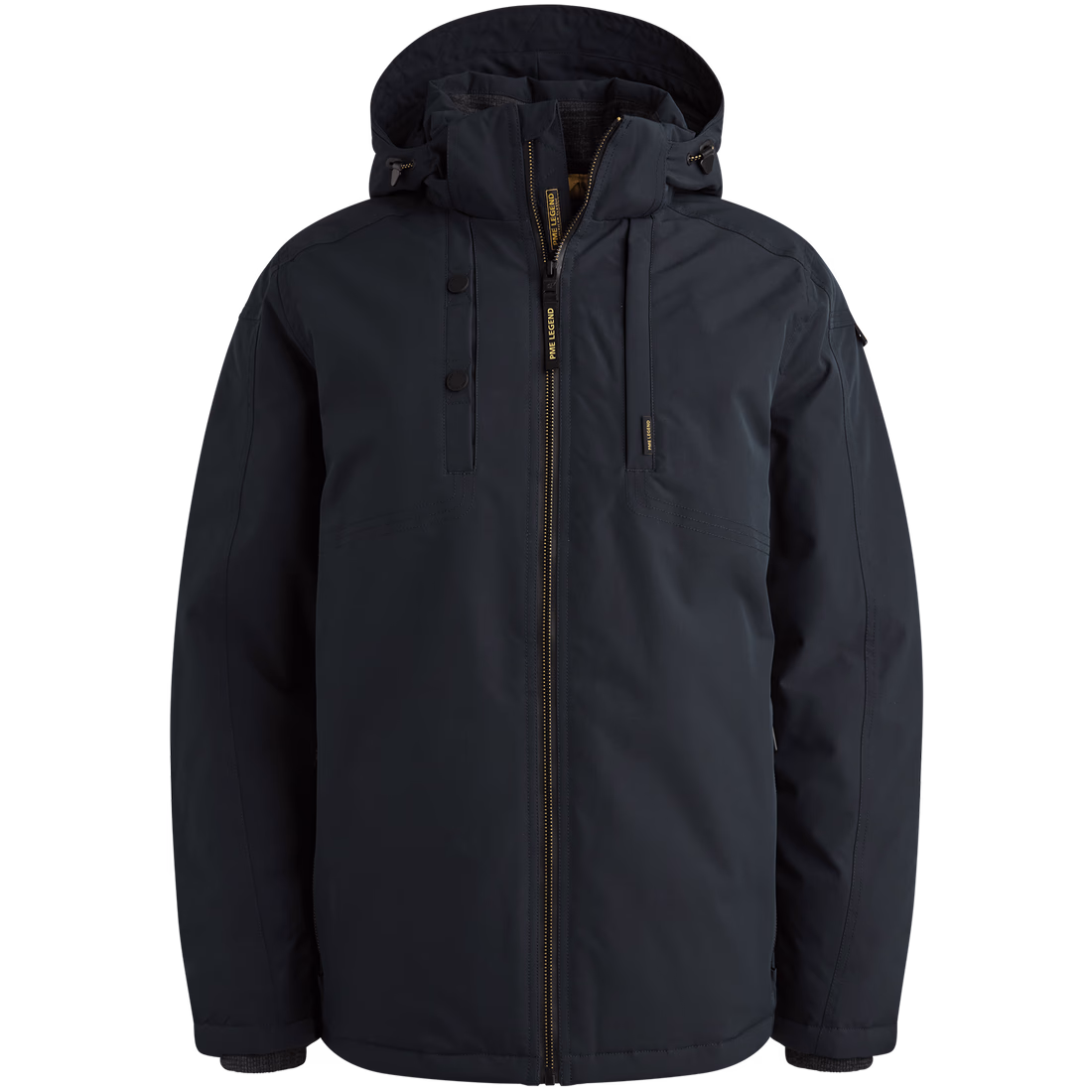 The PME Legend Stearpacker jacket is inspired by an authentic field jacket from 1965. With Tech Down insulation and a removable, adjustable hood, this waterproof jacket is ideal for a variety of weather conditions. Ribbed cuffs and a wind flap with chin guard provide extra warmth and comfort. The jacket has two zippered side pockets with fleece lining, one zippered chest pocket, and two zippered inside pockets. Characteristic PME Legend details, such as the removable sleeve tape, give the jacket its final look.