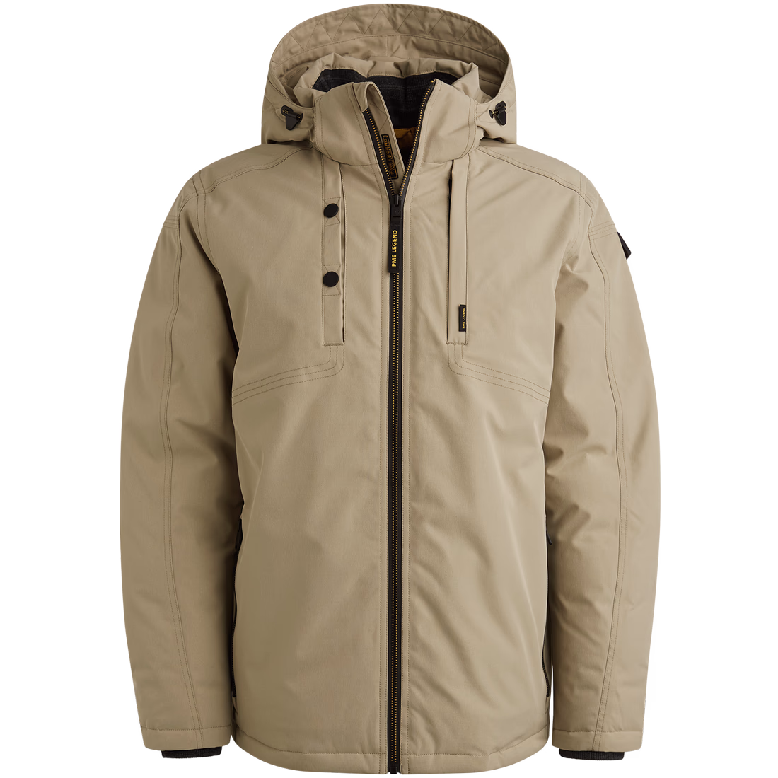 The PME Legend Stearpacker jacket is inspired by an authentic field jacket from 1965. With Tech Down insulation and a removable, adjustable hood, this waterproof jacket is ideal for a variety of weather conditions. Ribbed cuffs and a wind flap with chin guard provide extra warmth and comfort. The jacket has two zippered side pockets with fleece lining, one zippered chest pocket, and two zippered inside pockets. Characteristic PME Legend details, such as the removable sleeve tape, give the jacket its final look.