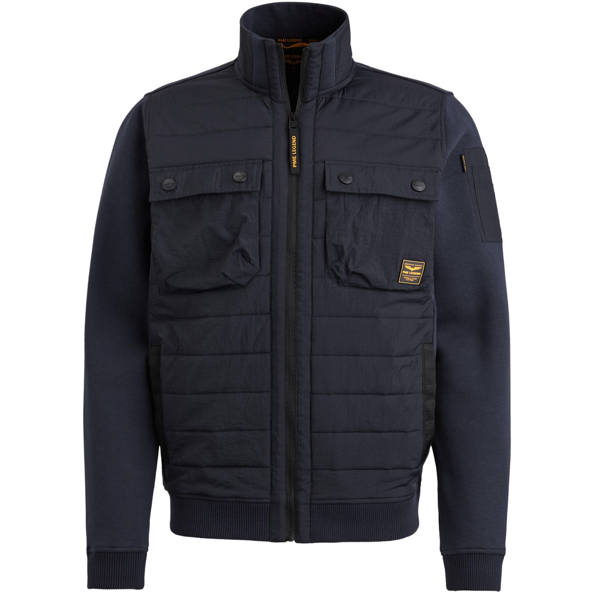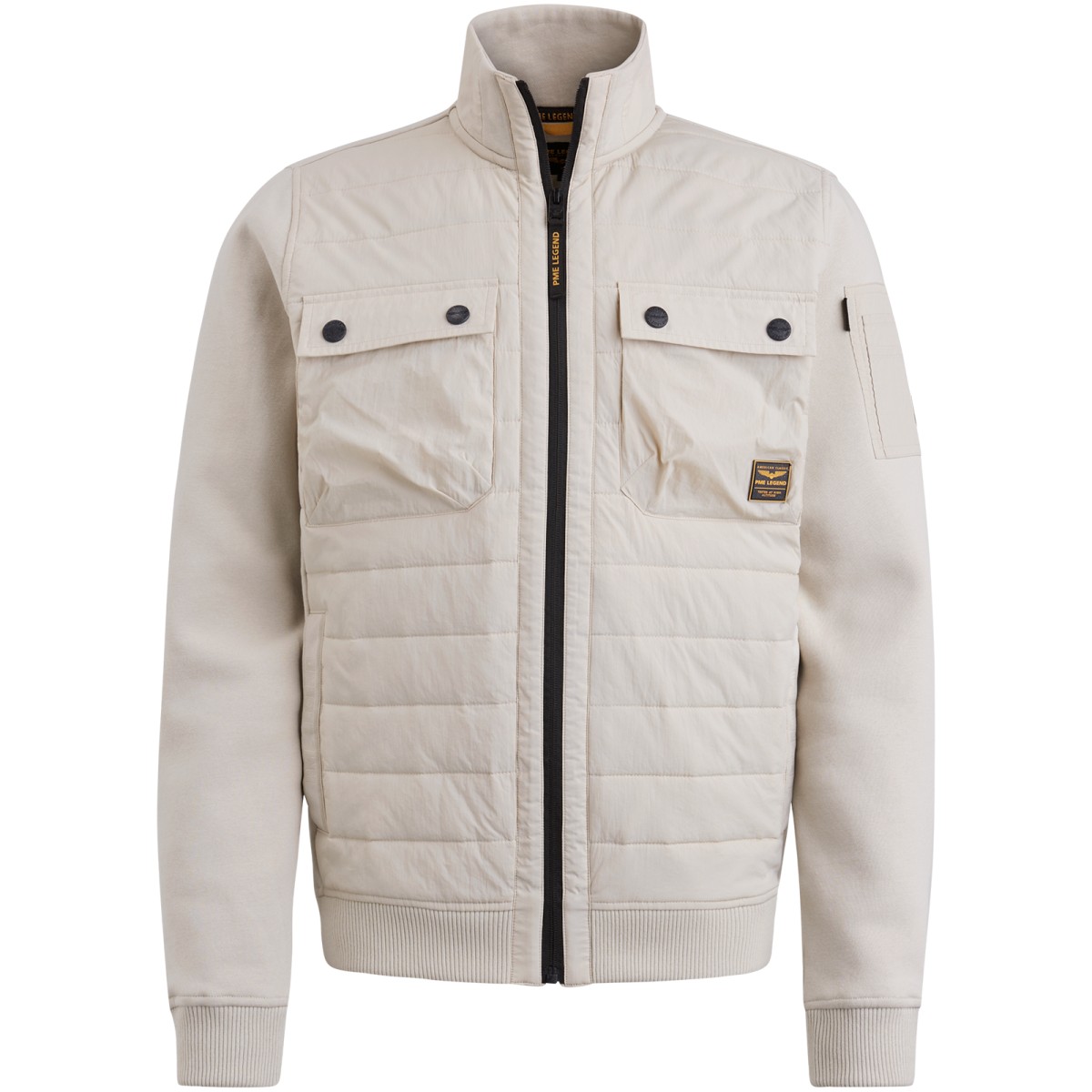 This hybrid jacket PME Legend is an ideal piece of layering. The mixture provides a cool look: the front is made of quilted nylon and the rest is a comfortable sweat fabric. It has zip fastening, functional breast pockets with press studs and flight pocket on the sleeve. The characteristic details of PME legends give the final adjustments.