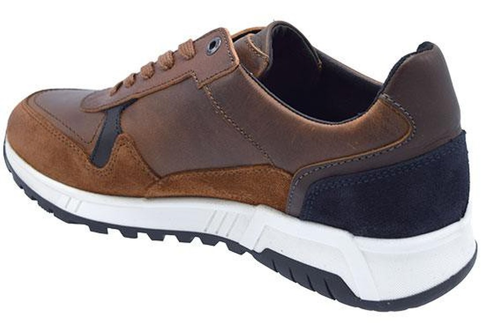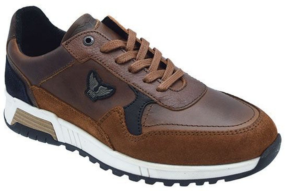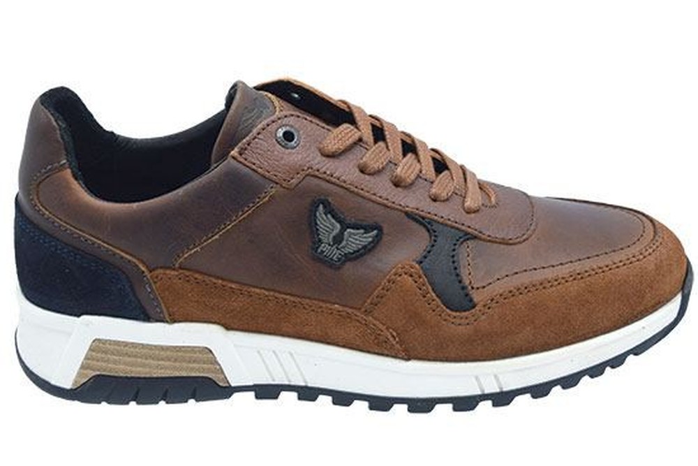Sportovní tenisky značky PME Legend v hnědé/koňakové barvě s černými a tmavě modrými akcenty. Šněrovací bota má svršek z kůže a vnitřní podšívku z textilu. Podrážka je vyrobena z plastu. Bota má šněrování a odnímatelnou stélku.