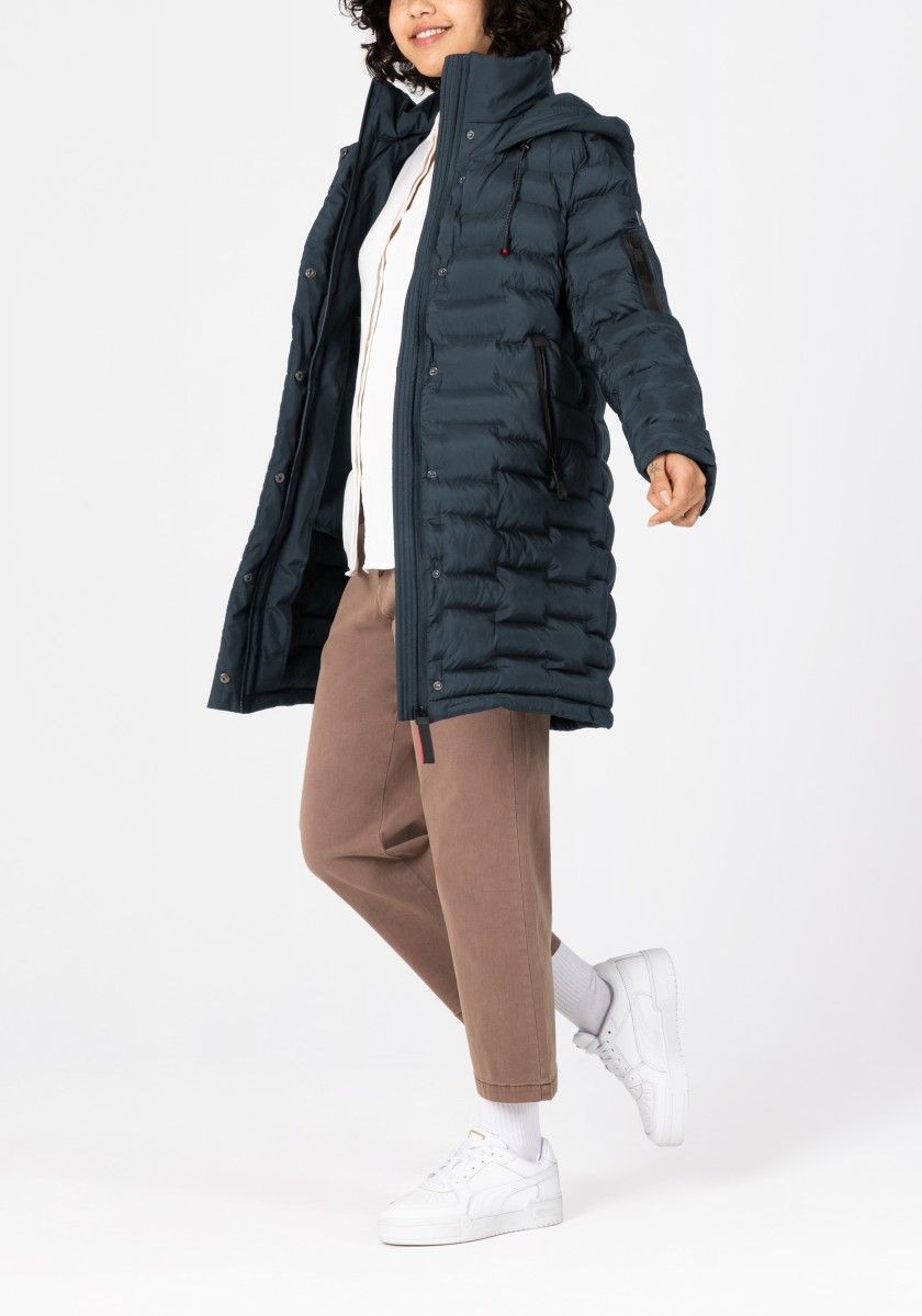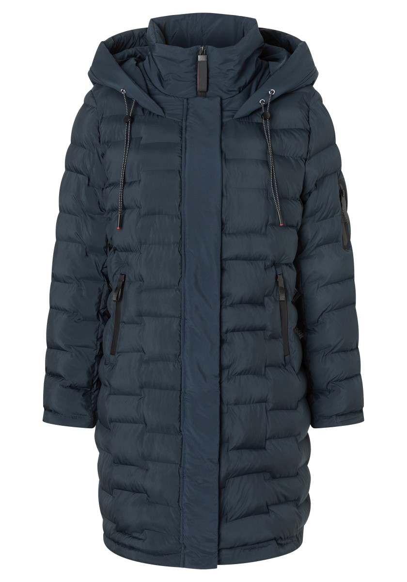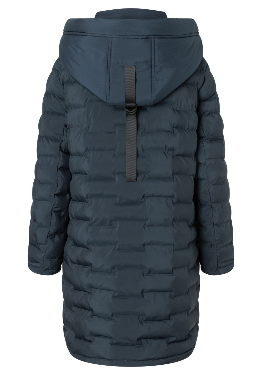 The puffer hooded coat with a double collar solution has a water-repellent surface and new, sophisticated chambers in a staggered look. Model with a large, fixed hood with a drawstring at the edge, a high collar and a concealed two-way waterproof front zipper that does not allow wind or weather to pass through. With two practical zip pockets on the side and one on the arm. Sustainable: The recycled padding is breathable, has a high heat retention capacity and is super light.