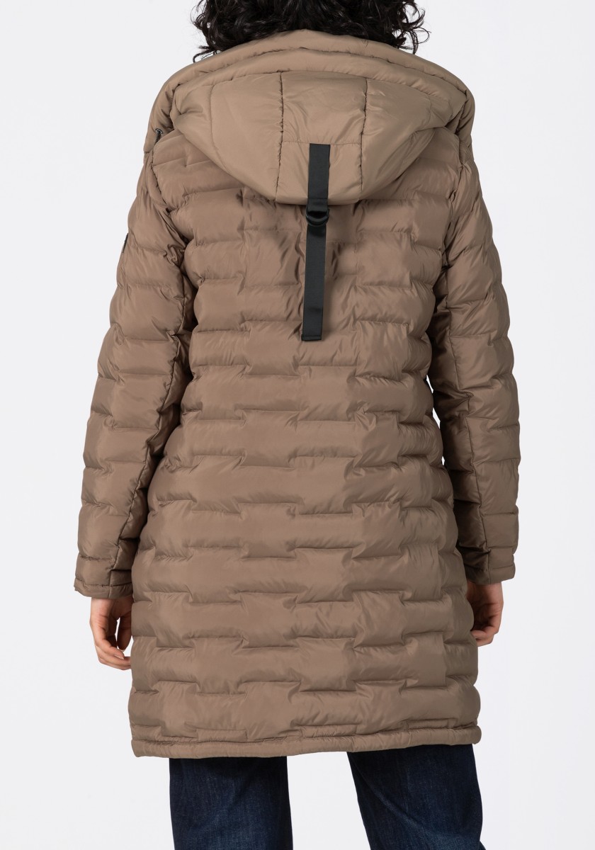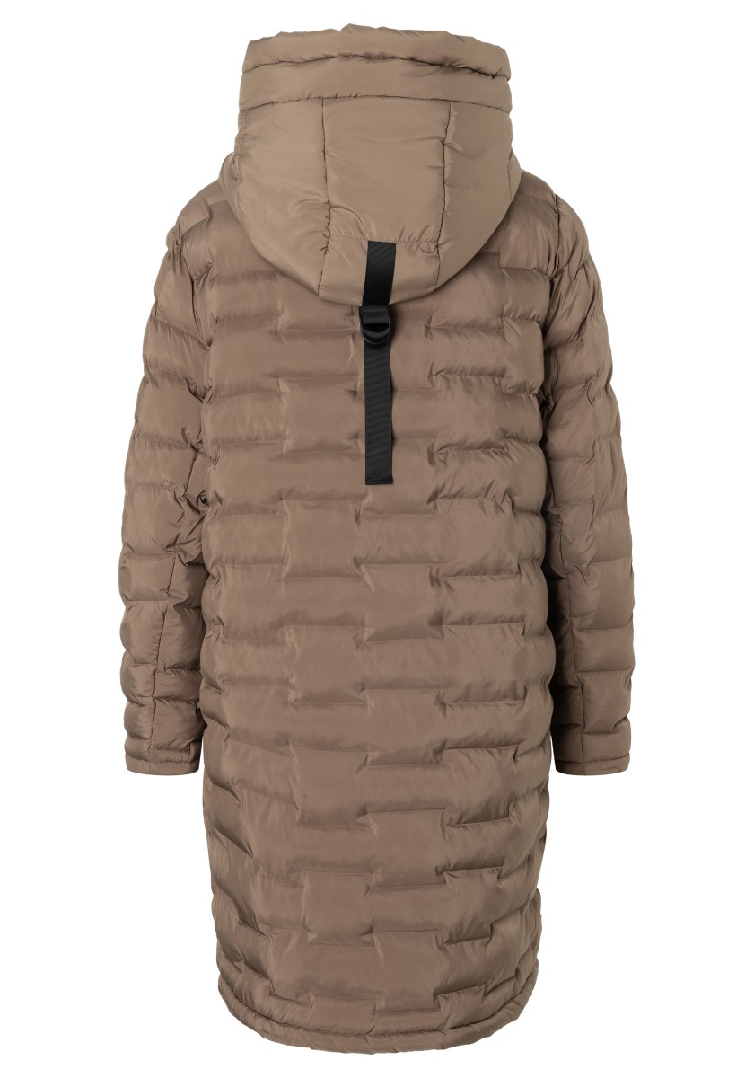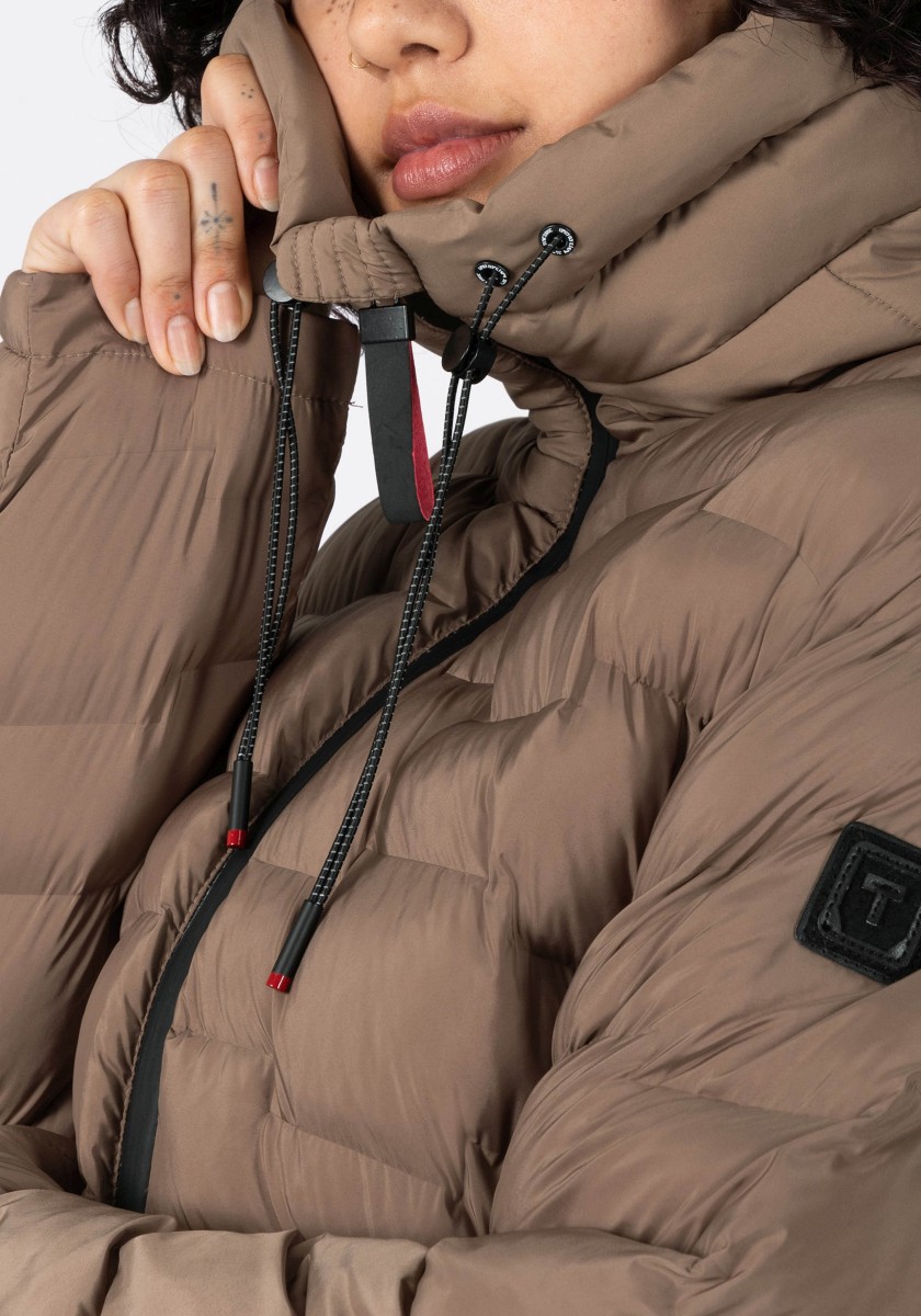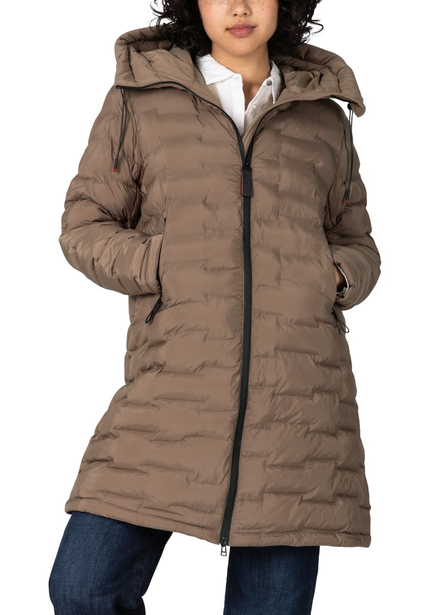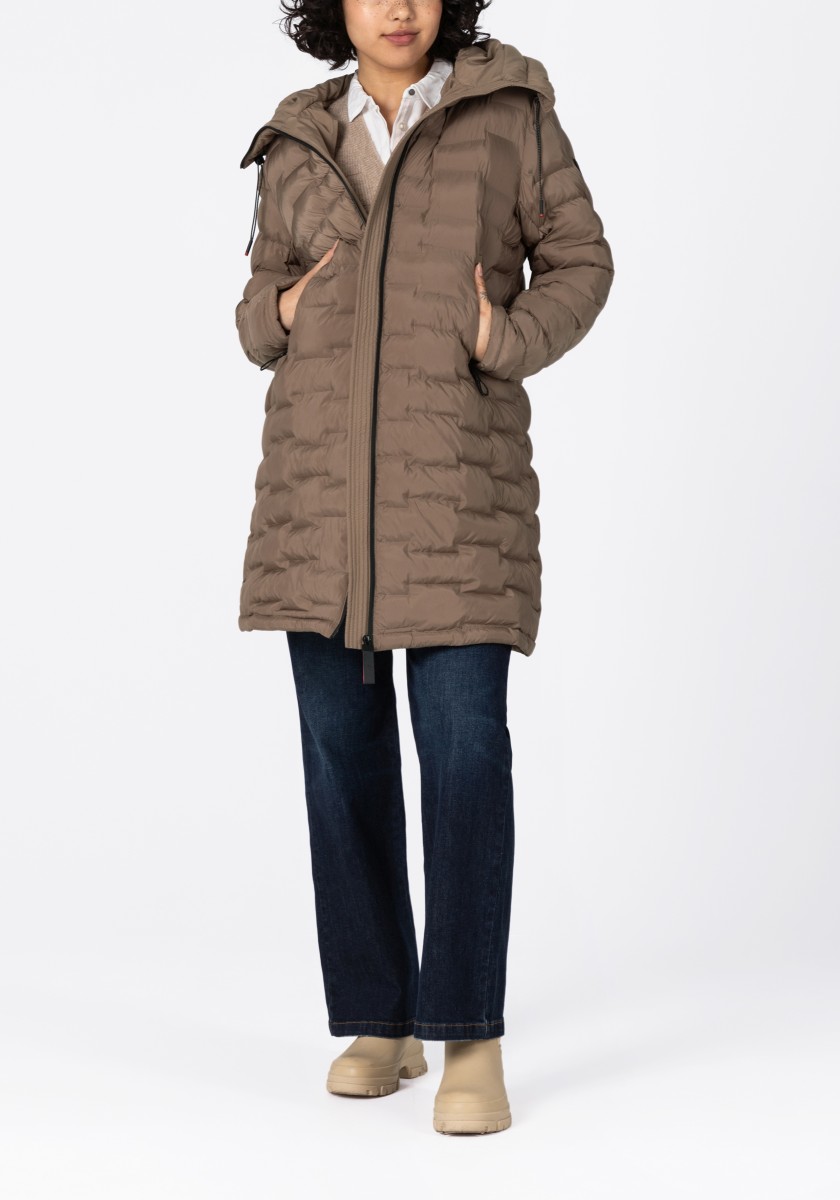The puffer hooded coat with a double collar solution has a water-repellent surface and new, sophisticated chambers in a staggered look. Model with a large, fixed hood with a drawstring at the edge, a high collar and a concealed two-way waterproof front zipper that does not allow wind or weather to pass through. With two practical zip pockets on the side and one on the arm. Sustainable: The recycled padding is breathable, has a high heat retention capacity and is super light.