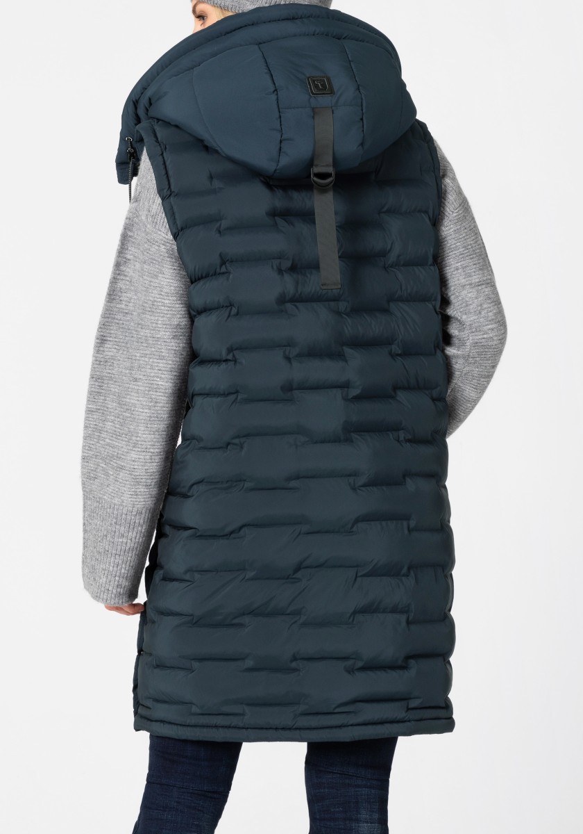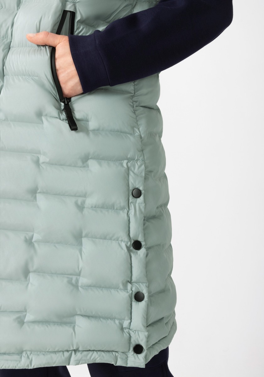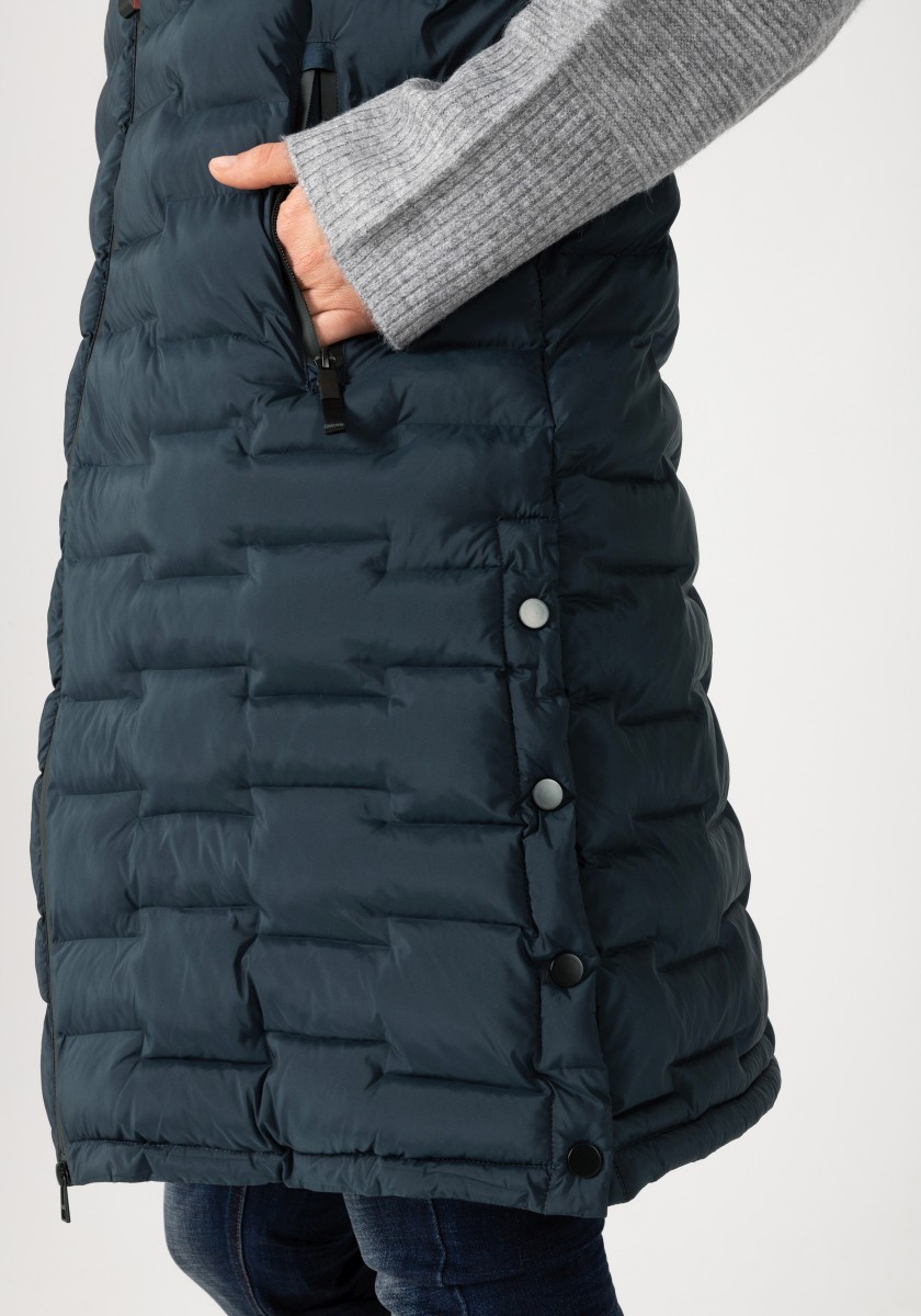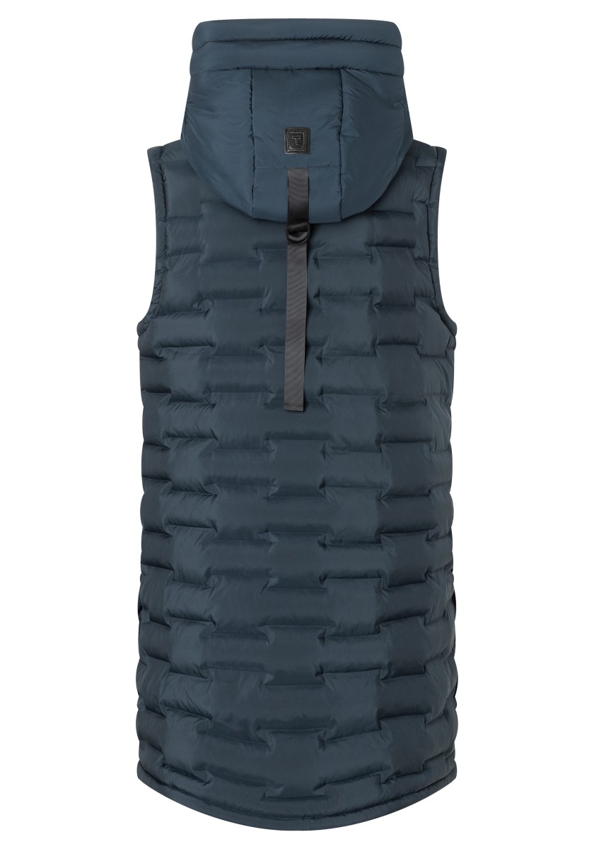 Puffer vest with a water-repellent surface and cleverly bonded chambers in a staggered look. Model with a large, fixed hood with a drawstring at the edge, a high collar and a waterproof two-way waterproof front zipper that does not allow wind or weather to pass through. With two zippered pockets and side seams that can be opened at the hem with press studs. Sustainable: The recycled padding is breathable, has a high heat retention capacity and is super light.