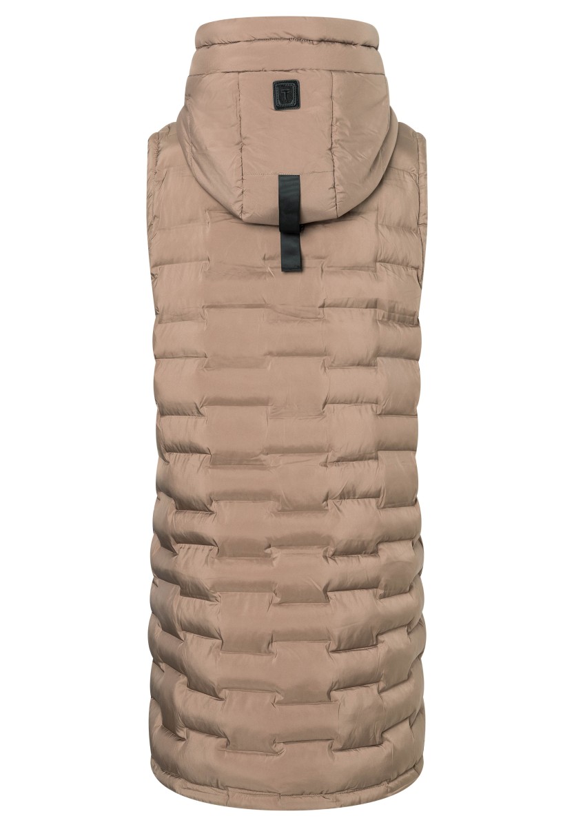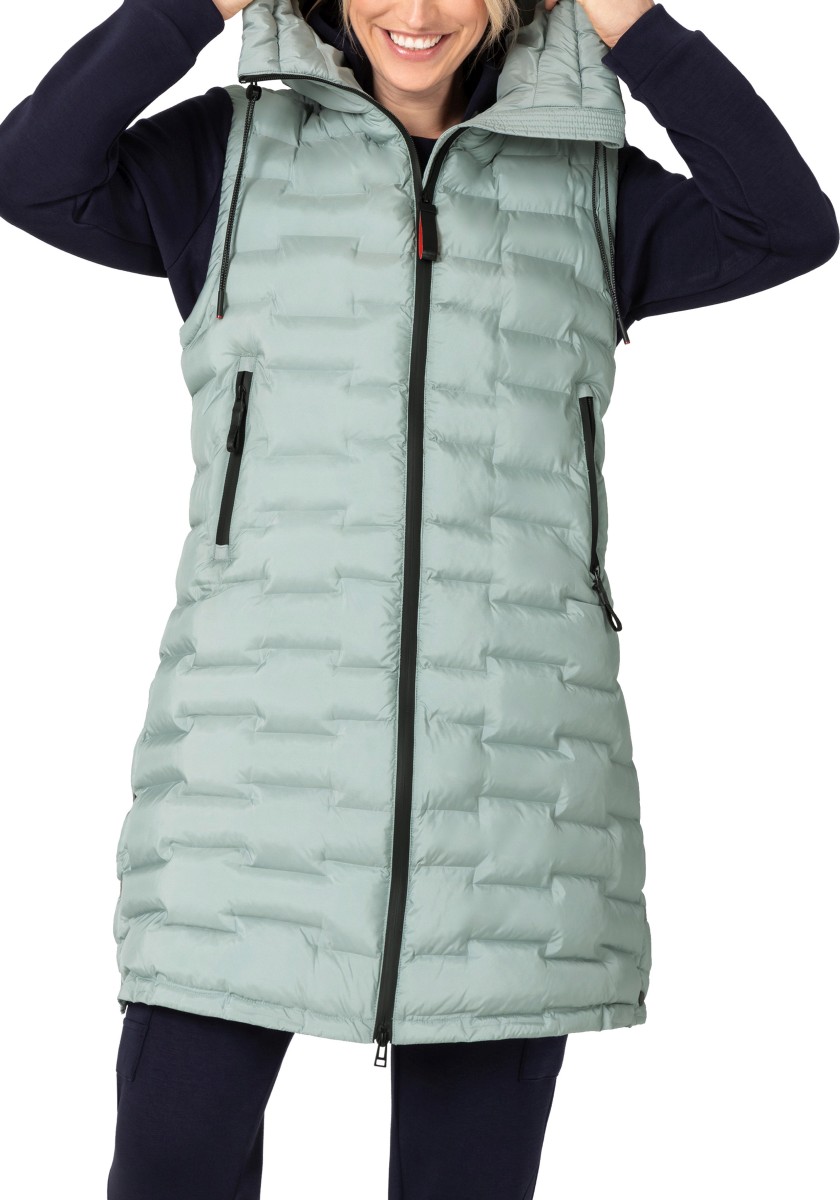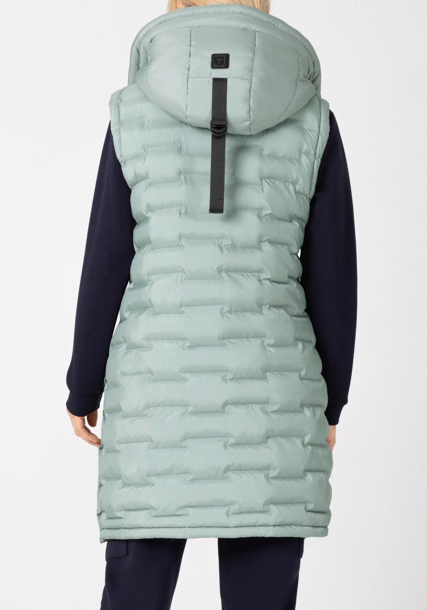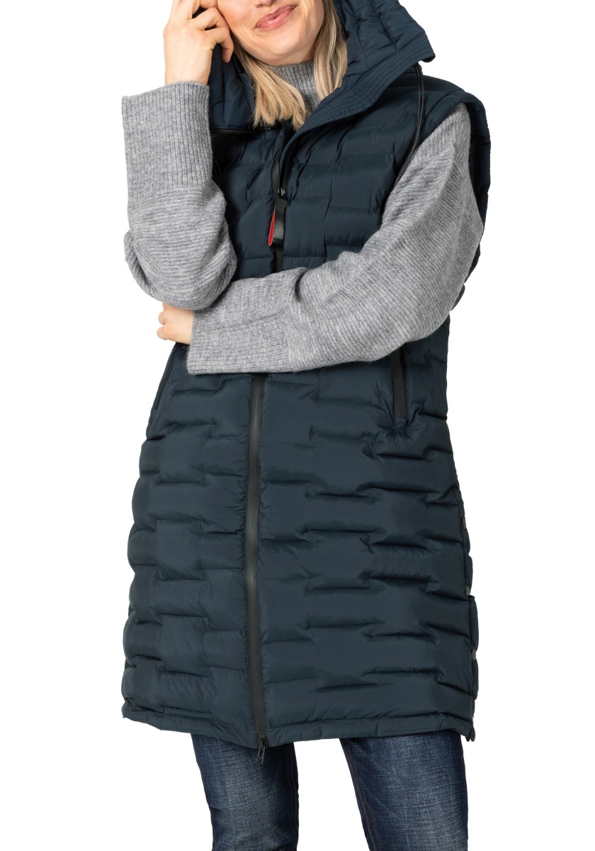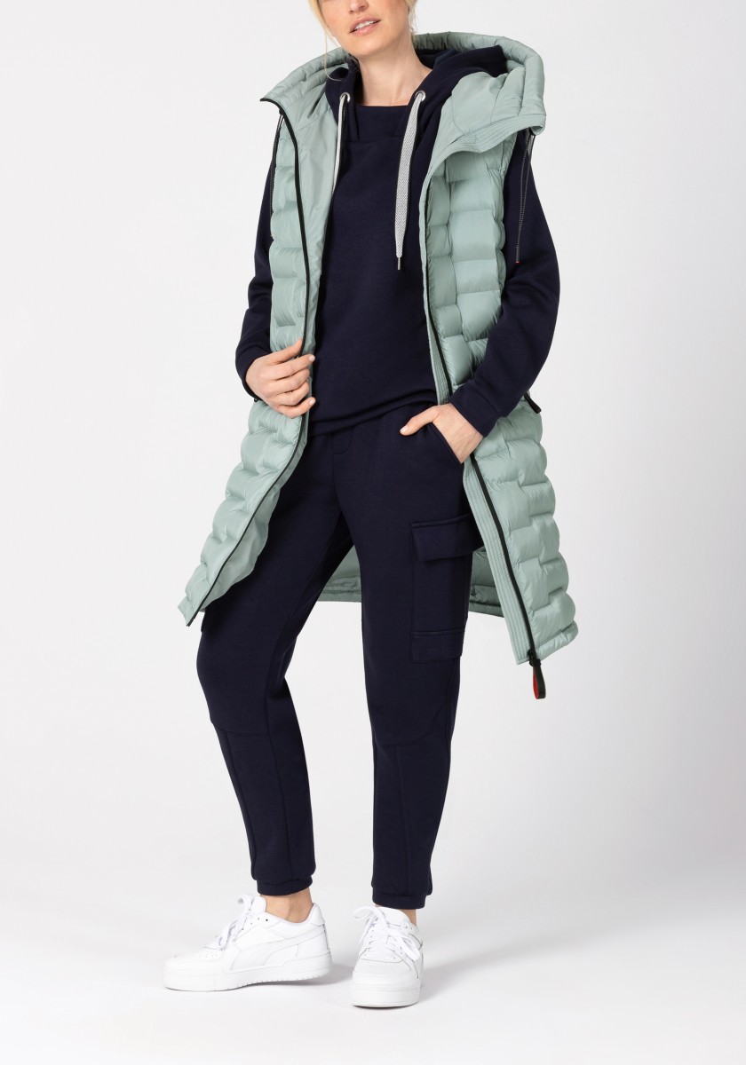 Puffer vest with a water-repellent surface and cleverly bonded chambers in a staggered look. Model with a large, fixed hood with a drawstring at the edge, a high collar and a waterproof two-way waterproof front zipper that does not allow wind or weather to pass through. With two zippered pockets and side seams that can be opened at the hem with press studs. Sustainable: The recycled padding is breathable, has a high heat retention capacity and is super light.