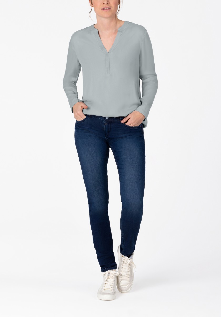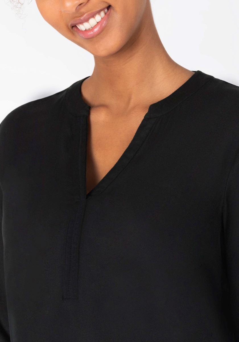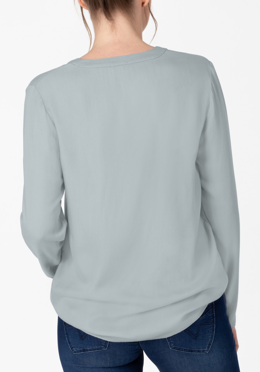 A blouse that doesn't need to hide under a jacket or blazer, but stands confidently on its own: a sporty slip-on model in flowing, soft viscose twill. The long-sleeved blouse has a henley-style V-neck stand-up collar with attached ribbed tape, regular cuffs and a rounded hem with contrast zig-zag stitching on the inside.