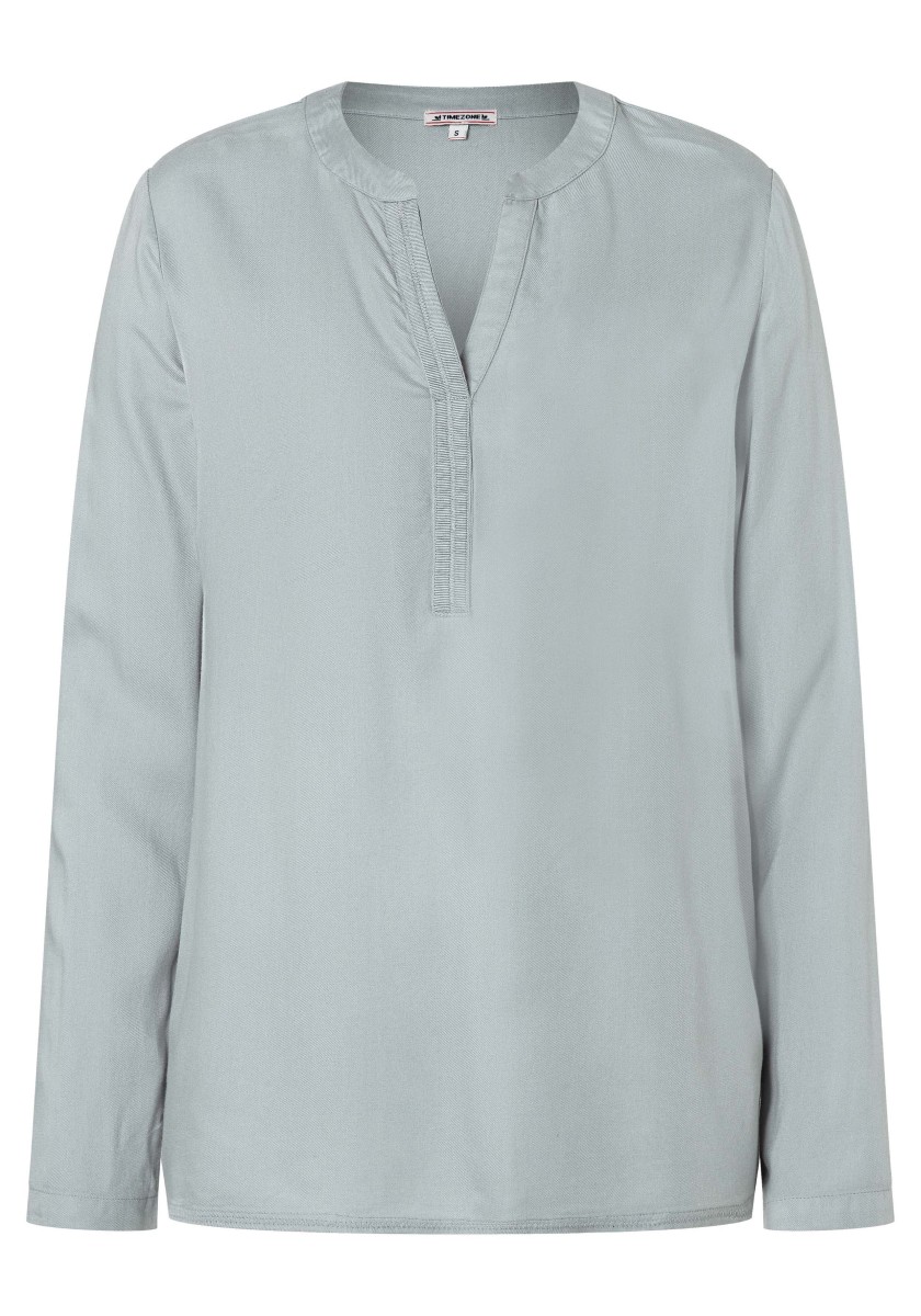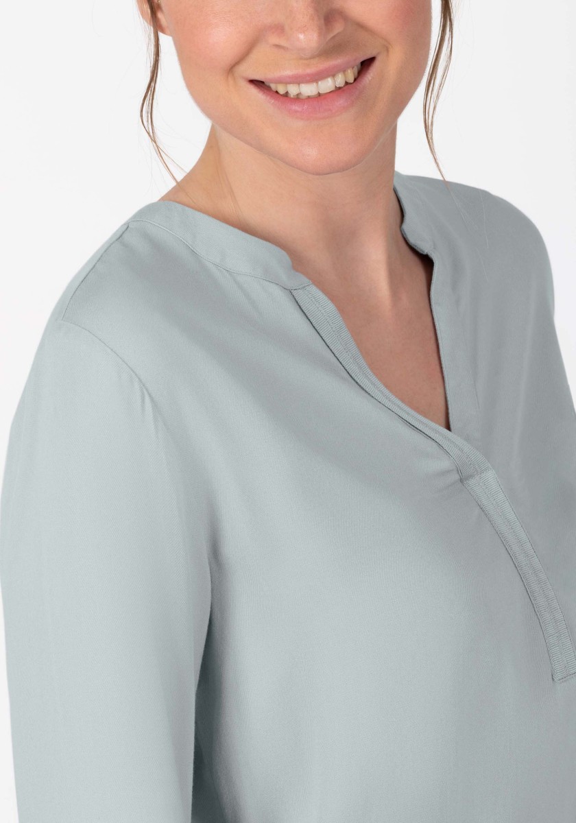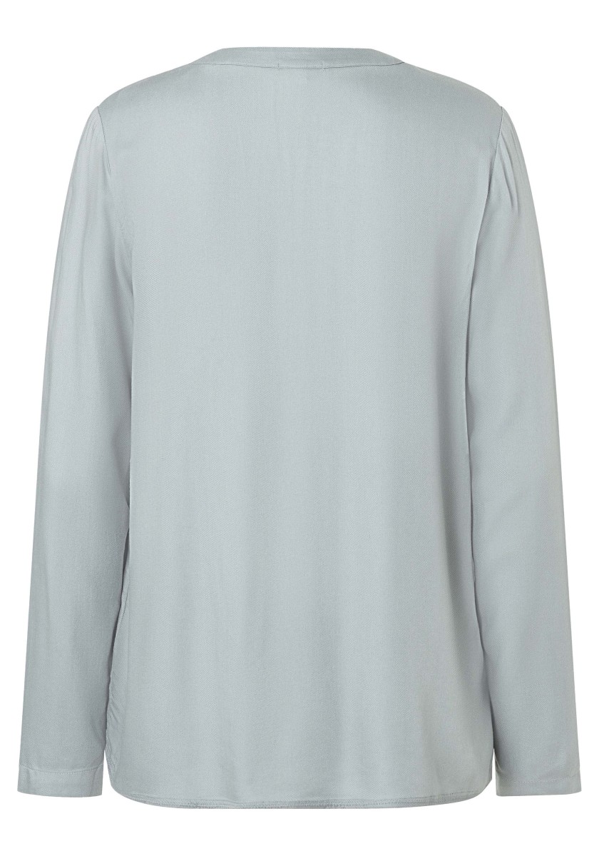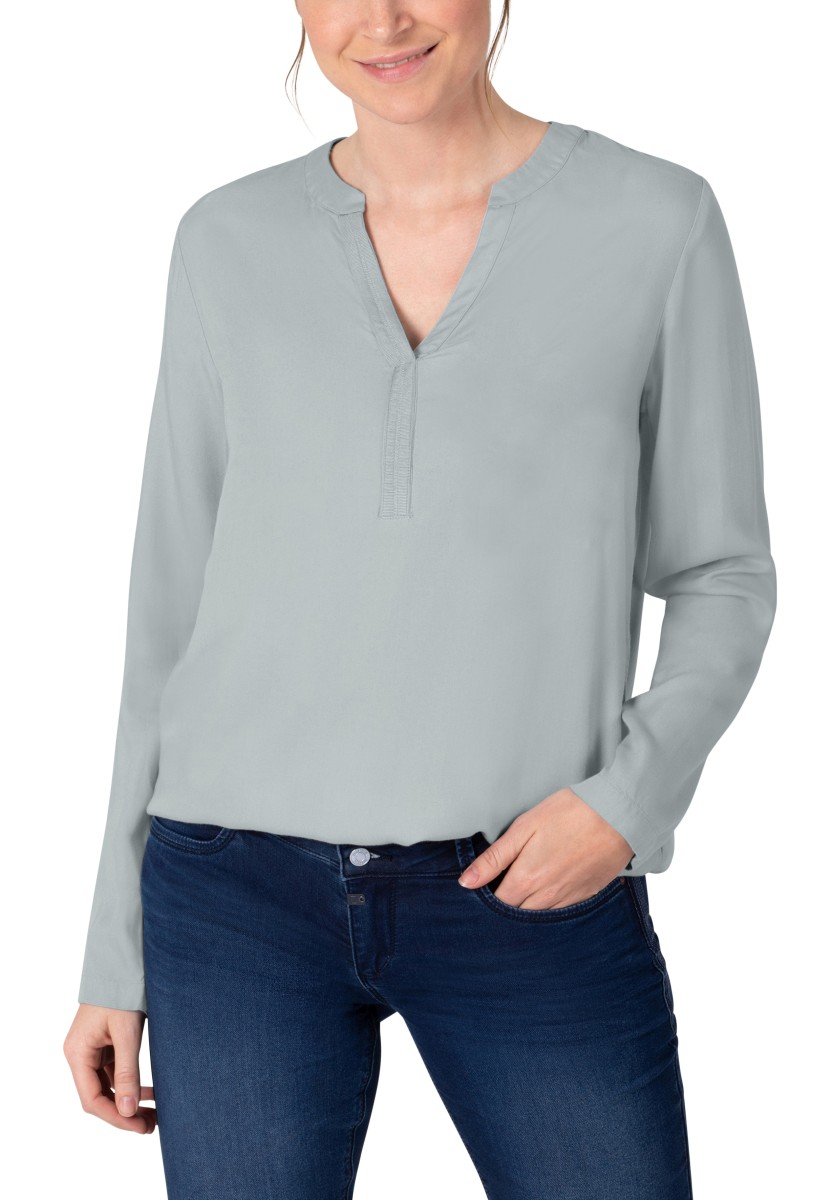 A blouse that doesn't need to hide under a jacket or blazer, but stands confidently on its own: a sporty slip-on model in flowing, soft viscose twill. The long-sleeved blouse has a henley-style V-neck stand-up collar with attached ribbed tape, regular cuffs and a rounded hem with contrast zig-zag stitching on the inside.