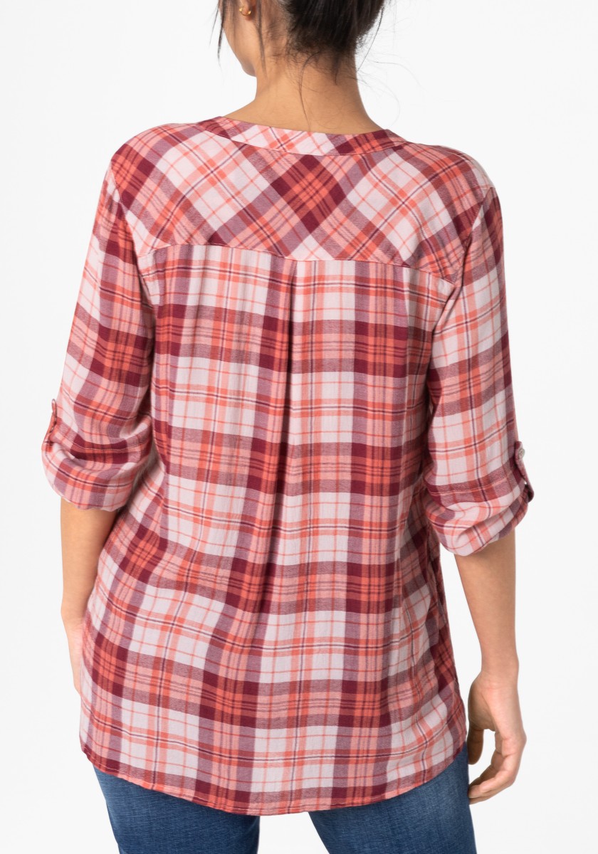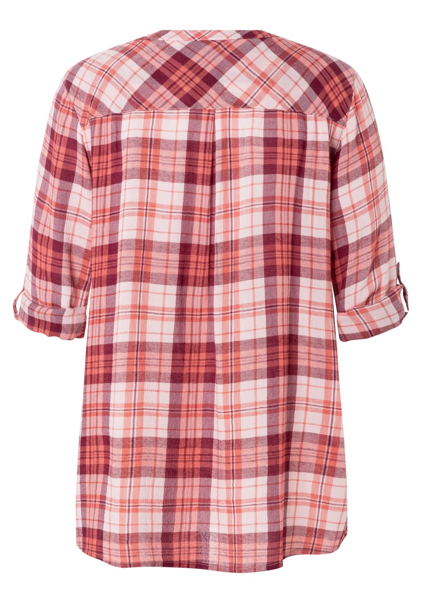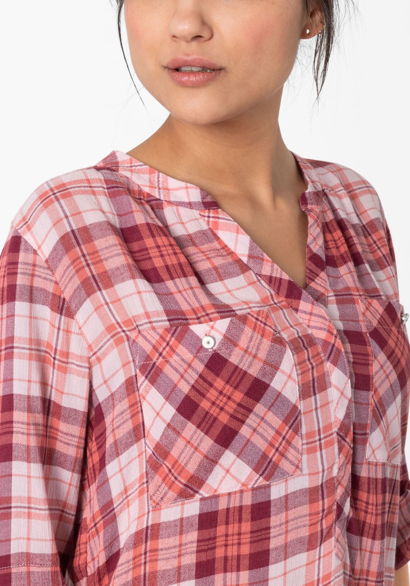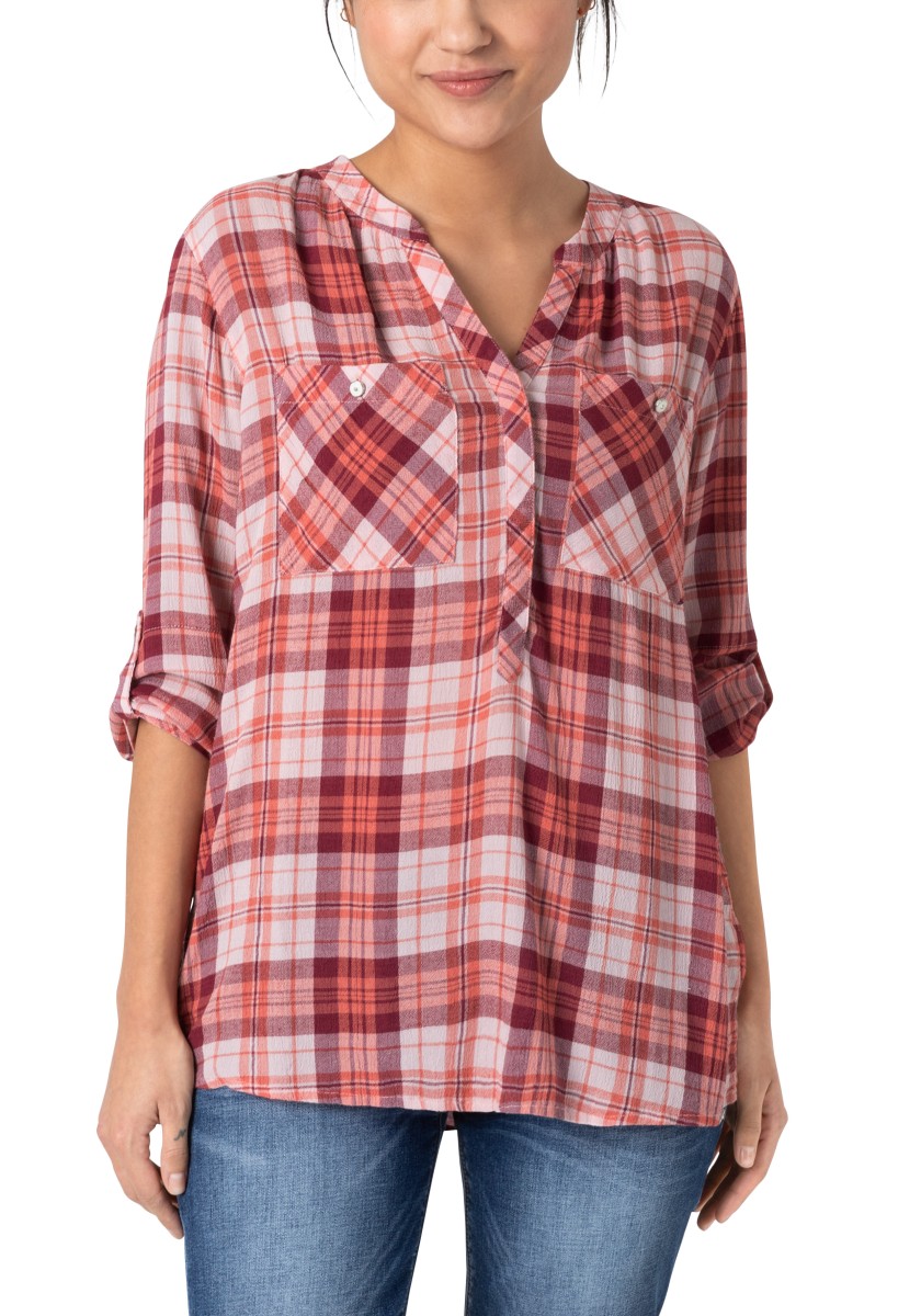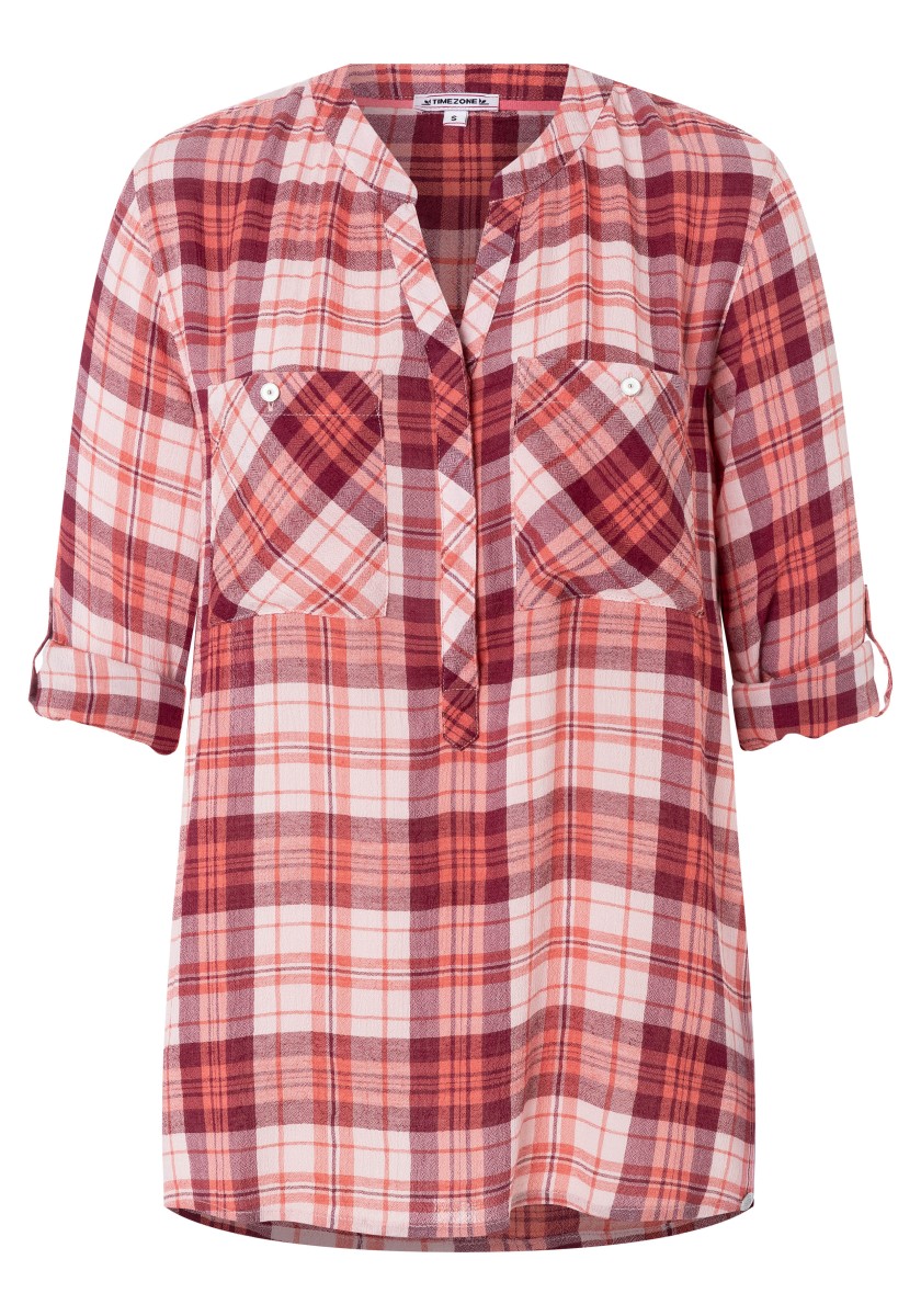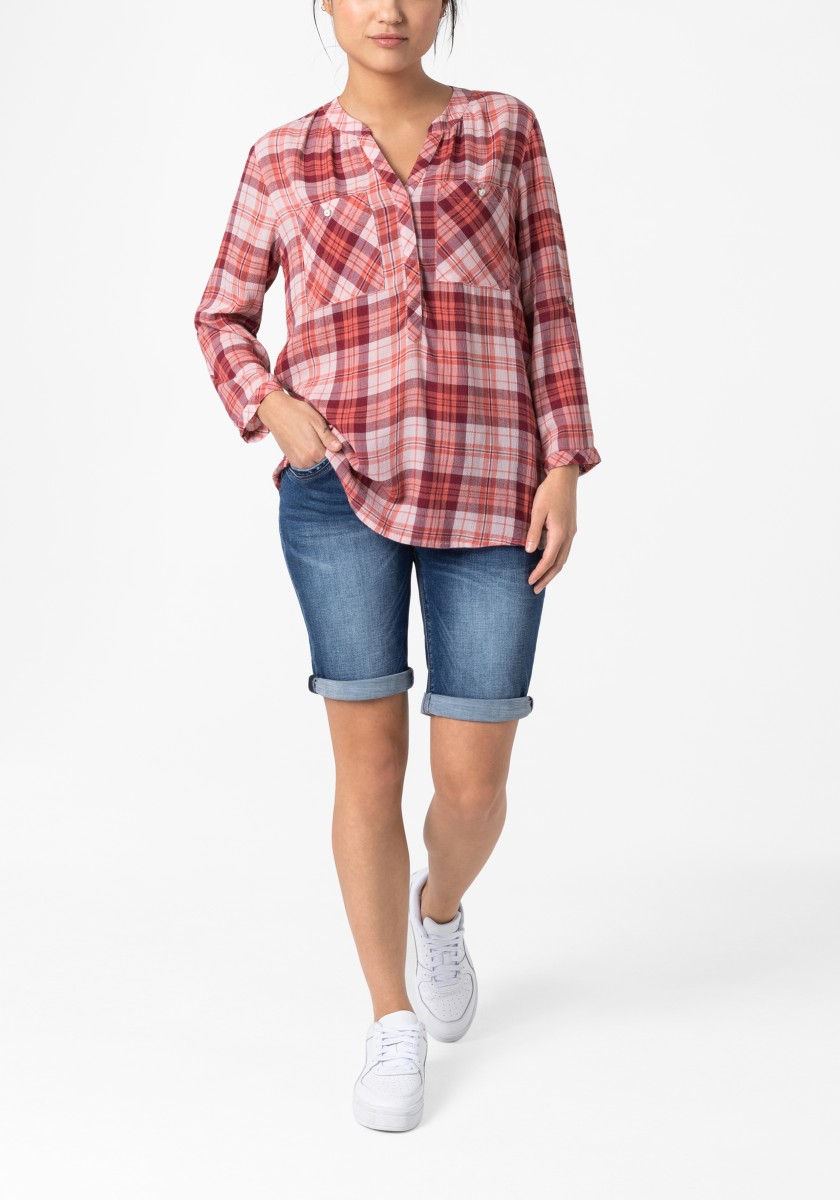 If you think a casual pattern is only in autumn and winter, you are very wrong. Combined with the cool design of the blouse has a summer, light look. Free-cut model made of super soft, squeezed mixtures of modal-chosen with stand and hidden Henley neckline. Ideal for your travel suitcase: No need to iron! 3/4 Sleeves with narrow cuffs and casually rounded lower hem. Rear part with caliper and box fold.