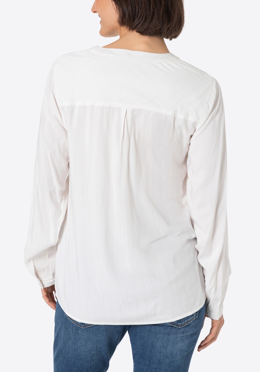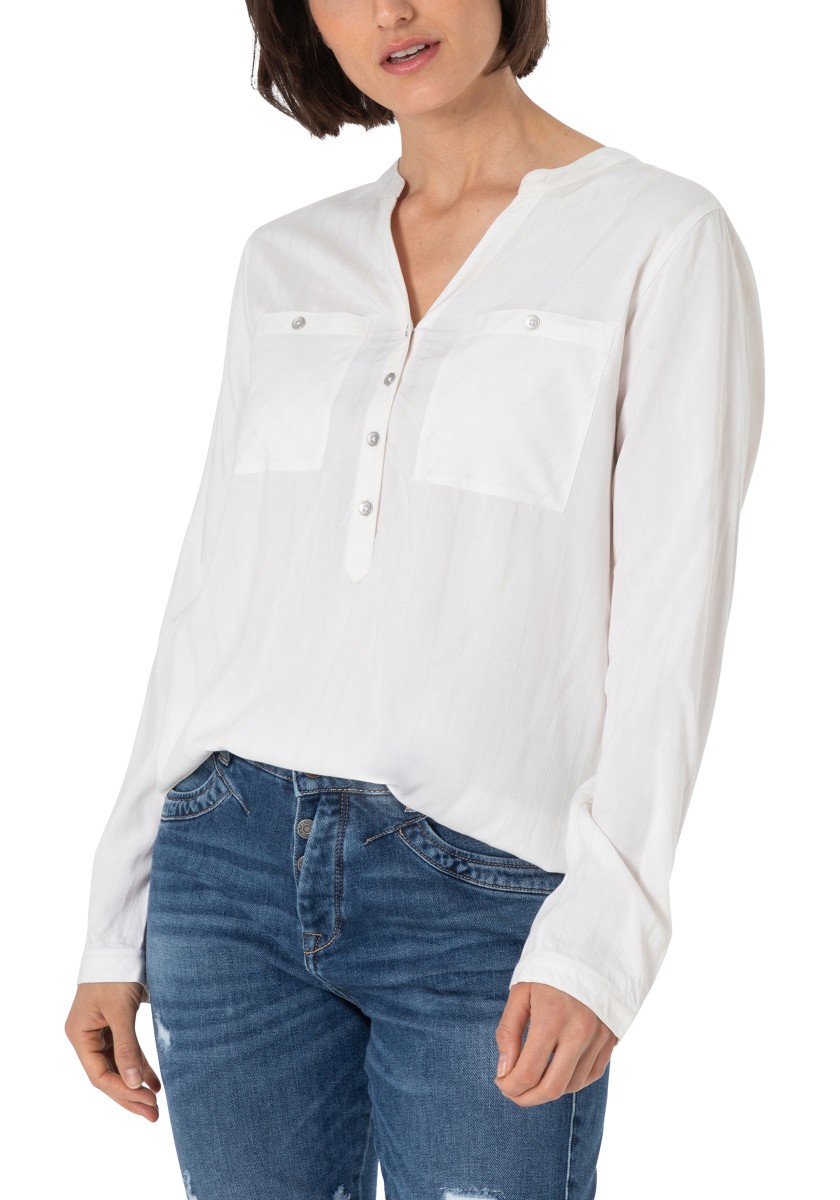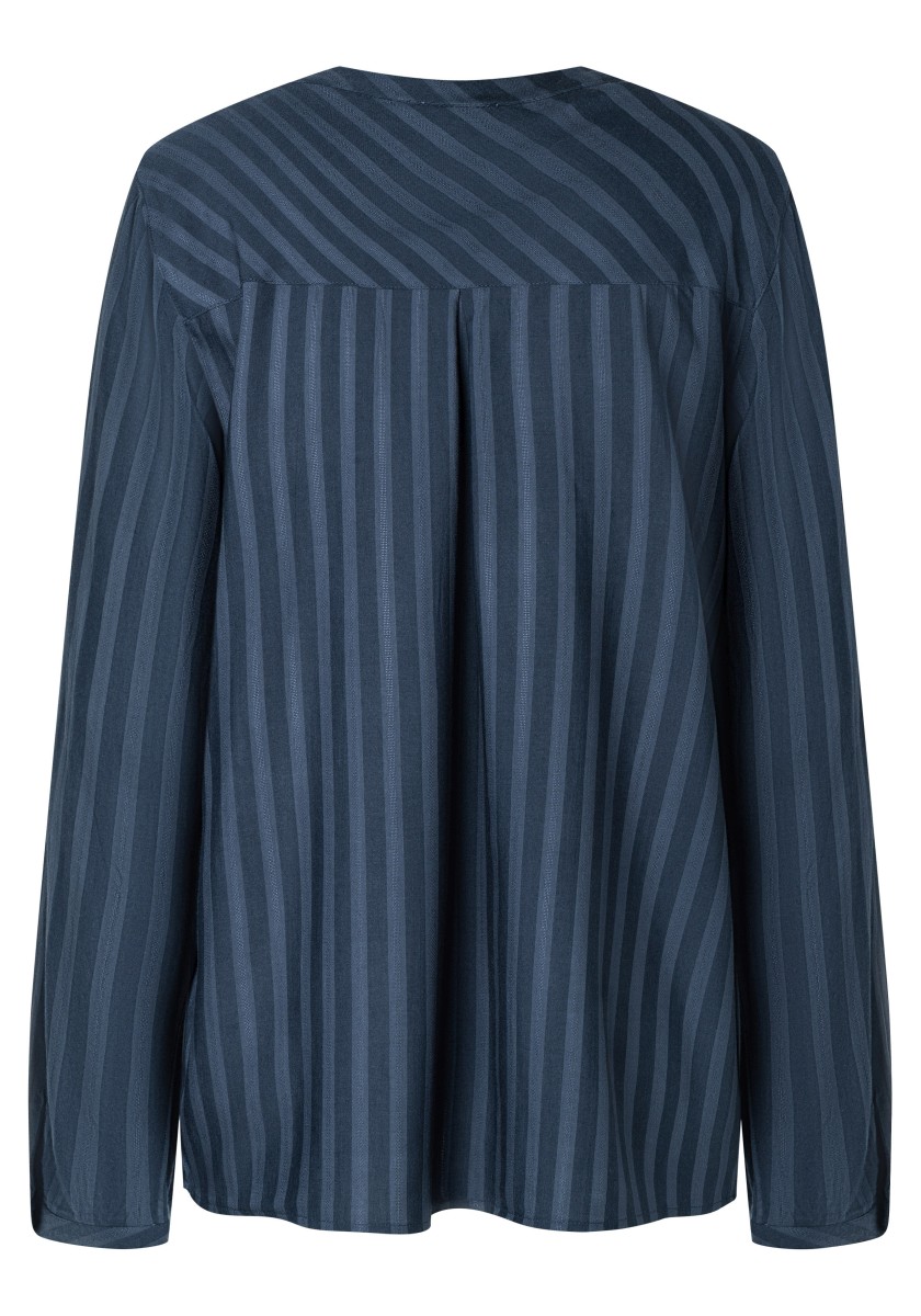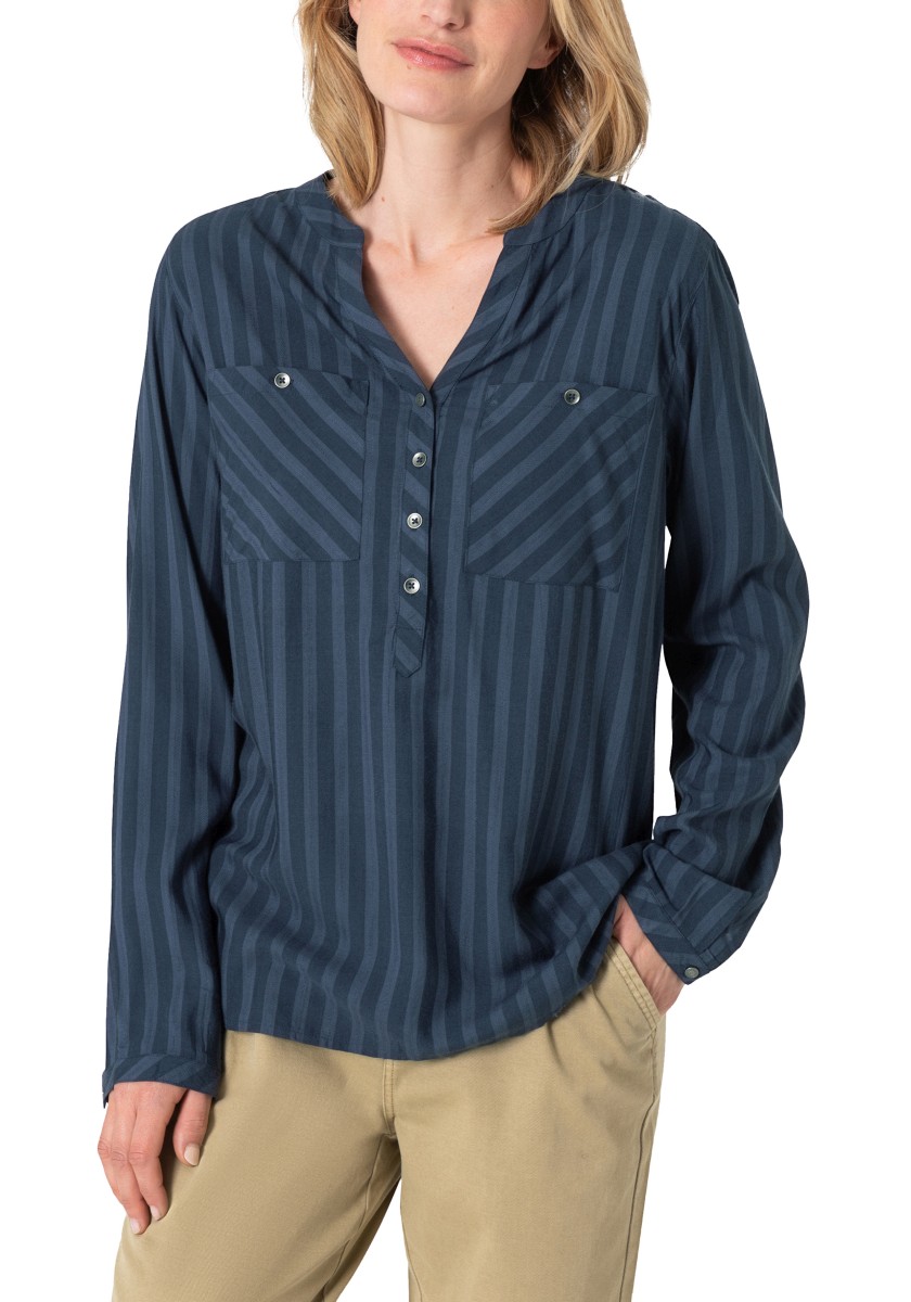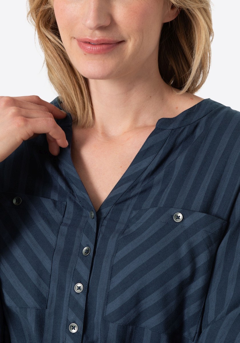 Jsou absolutní klasikou a zároveň nabízejí nepřeberné množství stylingových nápadů: halenky. Sportovní, ležérní slip-on model lze kombinovat v hravém, ženském nebo rockovém a cool stylu. Měkká halenka je vyrobena z čisté, splývavé viskózy a má decentní pruhovaný design barvený přízí s jemným vzorem. Se stojáčkem, výstřihem do V, légou na půl knoflíku, dlouhými rukávy s úzkými manžetami na knoflíky a decentně zaobleným spodním lemem. Zadní díl s ramenním sedlem a krabicovým záhybem.