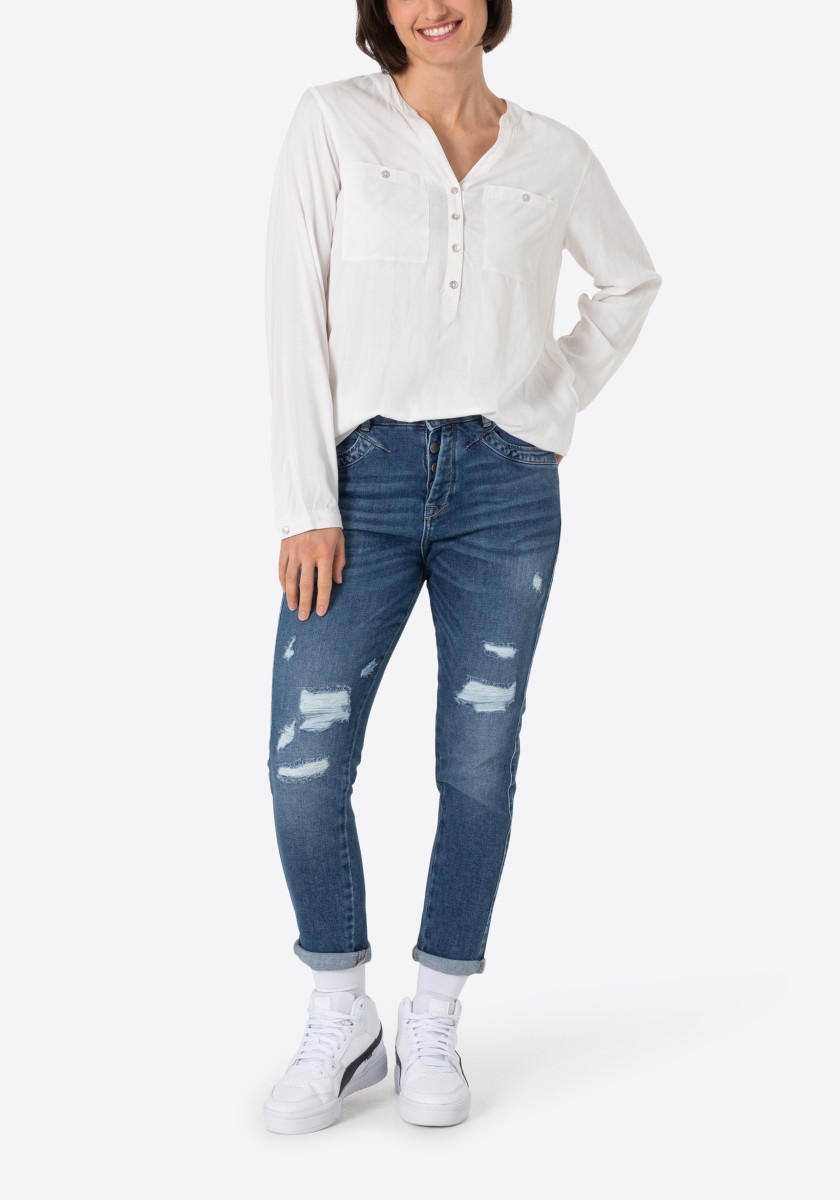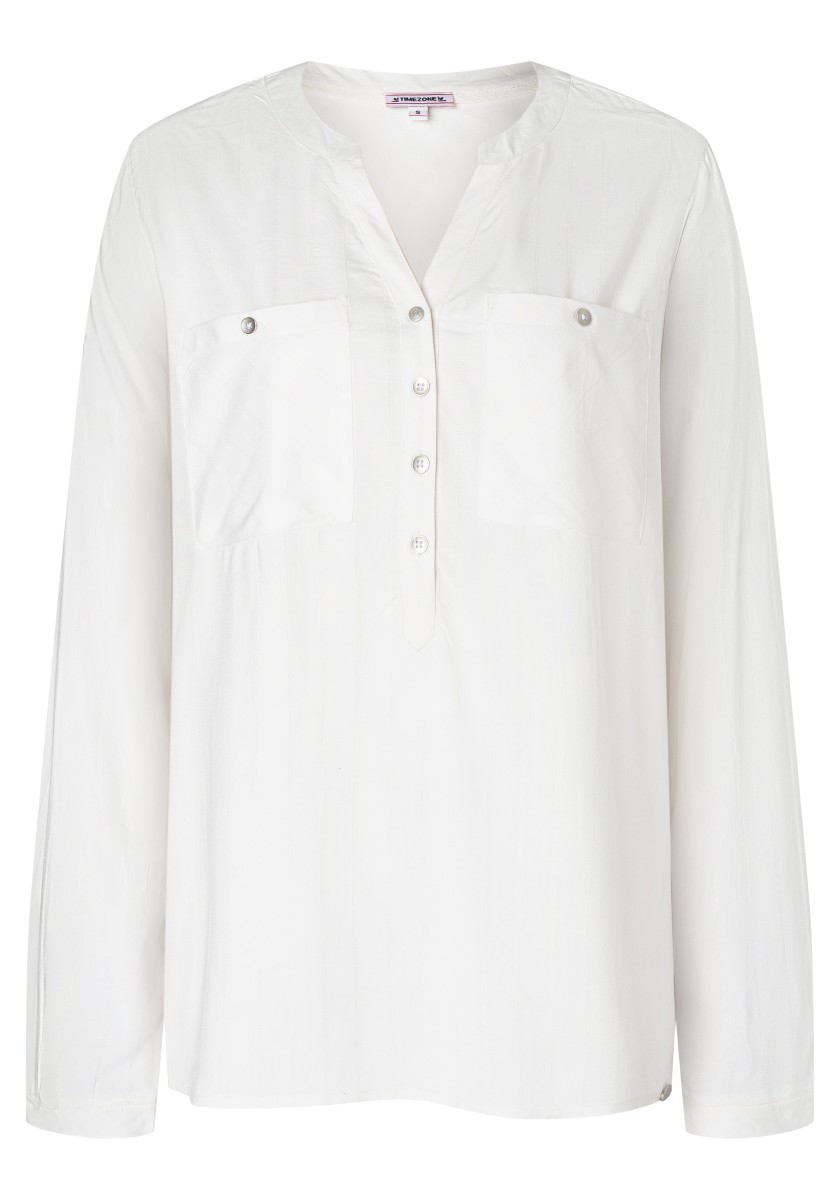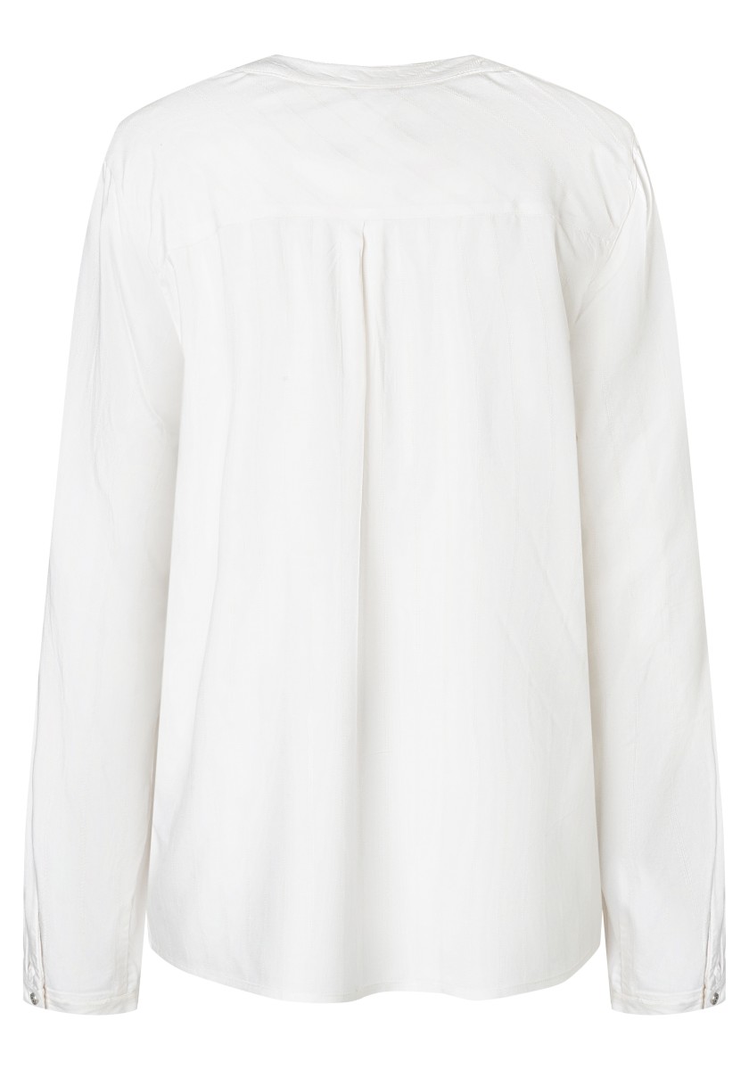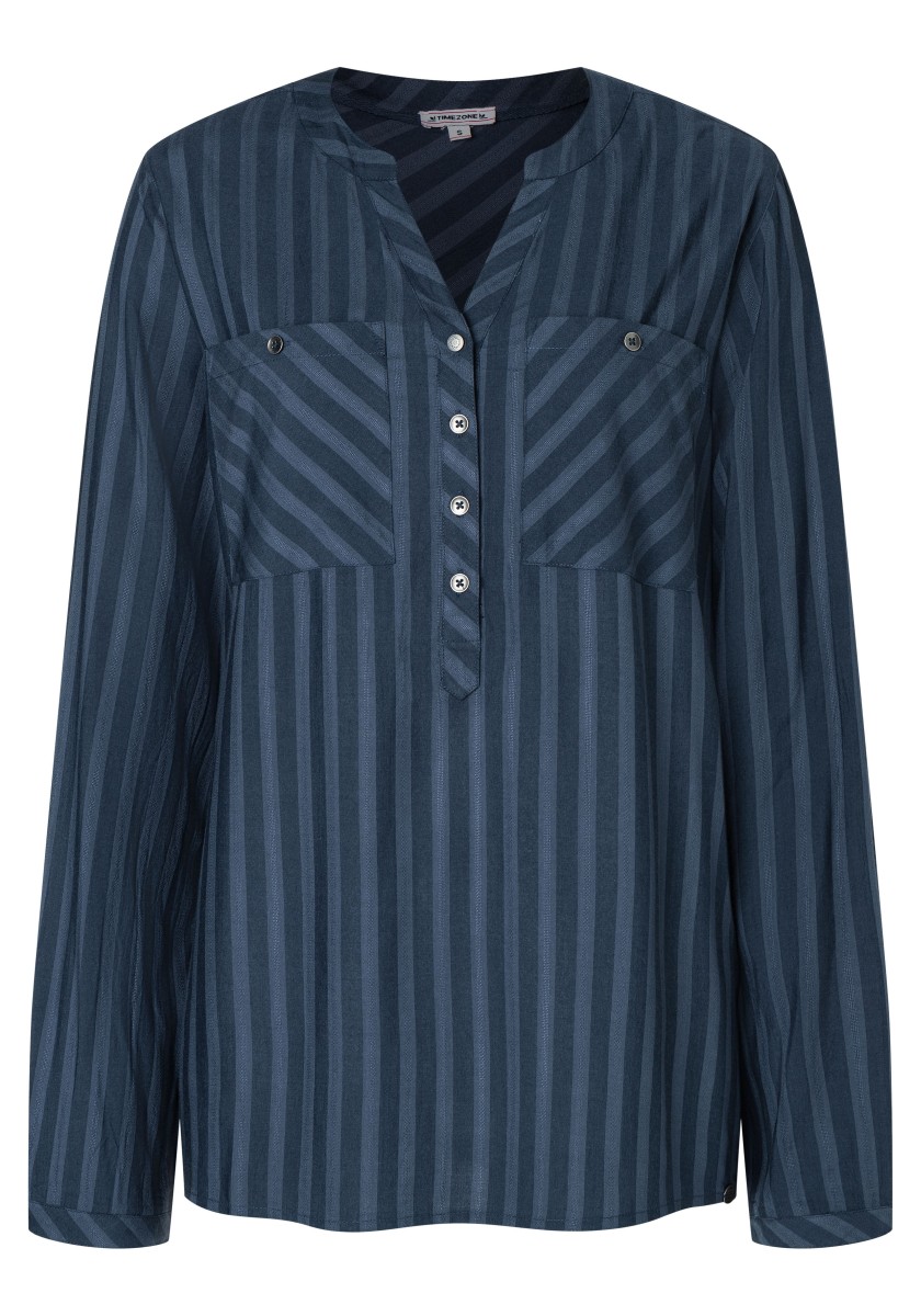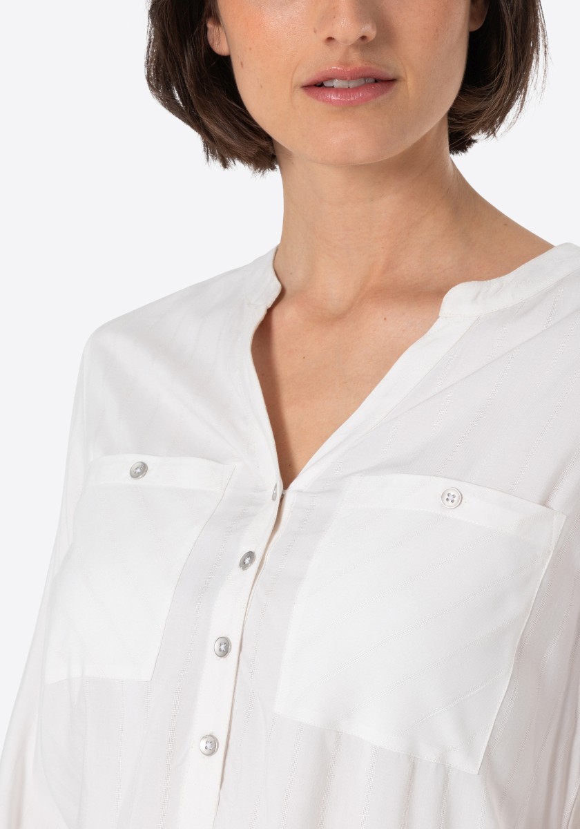 Jsou absolutní klasikou a zároveň nabízejí nepřeberné množství stylingových nápadů: halenky. Sportovní, ležérní slip-on model lze kombinovat v hravém, ženském nebo rockovém a cool stylu. Měkká halenka je vyrobena z čisté, splývavé viskózy a má decentní pruhovaný design barvený přízí s jemným vzorem. Se stojáčkem, výstřihem do V, légou na půl knoflíku, dlouhými rukávy s úzkými manžetami na knoflíky a decentně zaobleným spodním lemem. Zadní díl s ramenním sedlem a krabicovým záhybem.