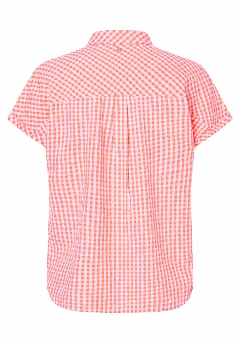 With fine neon details: Blouse Seersucker free cut with a casual checked pattern of Vichy made of high quality mixture of cotton and viscose. The blouse has a modern narrow collar Kent, strongly fallen shoulders with solid cuffs and a significantly rounded lower hem with amplification of the side seams. The blouse is fastened on small metal buttons and has a sewn pocket. Another styling tip: Wear it open in layering over a tank top.