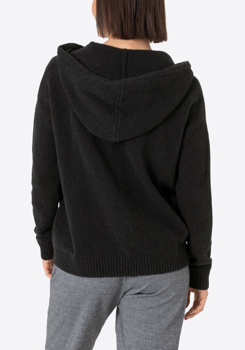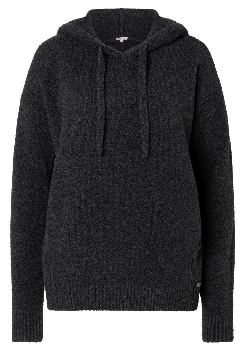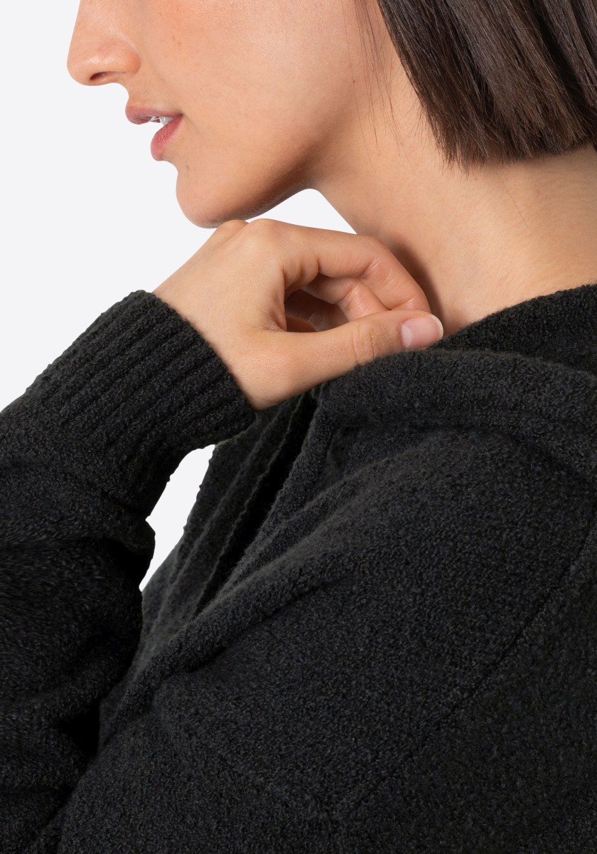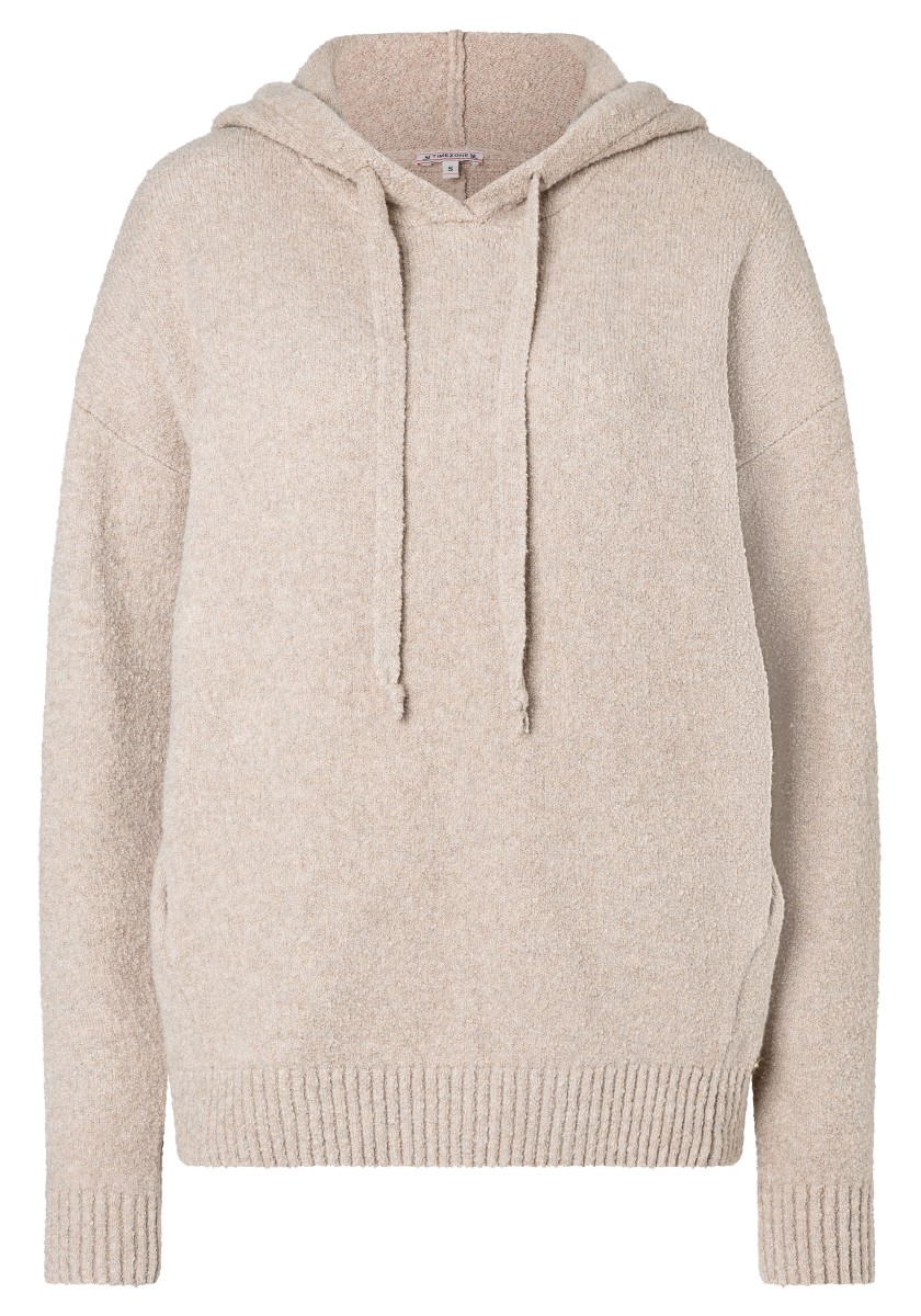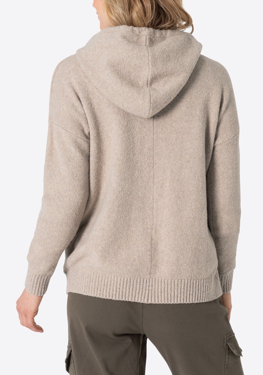 Perfektní alternativa ke klasické mikině: pohodlný pletený svetr se sportovními raglánovými rukávy. Nadýchaný model má klasický žebrovaný výstřih a úzké žebrované manžety a lem. Střih: volný, ženský. Kvalita: nadýchaná, kroucená boucle příze s obsahem elastanu vyrobená z měkké bavlněné směsi. Co je zvláštní: nápadný síťovaný vzor tvořený širokými příčnými žebry ve 3D vzhledu. Lze kombinovat se všemi našimi kalhotami.