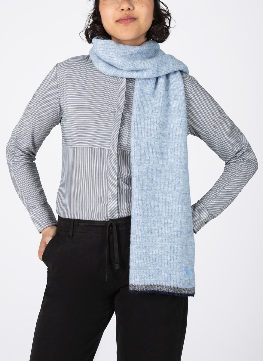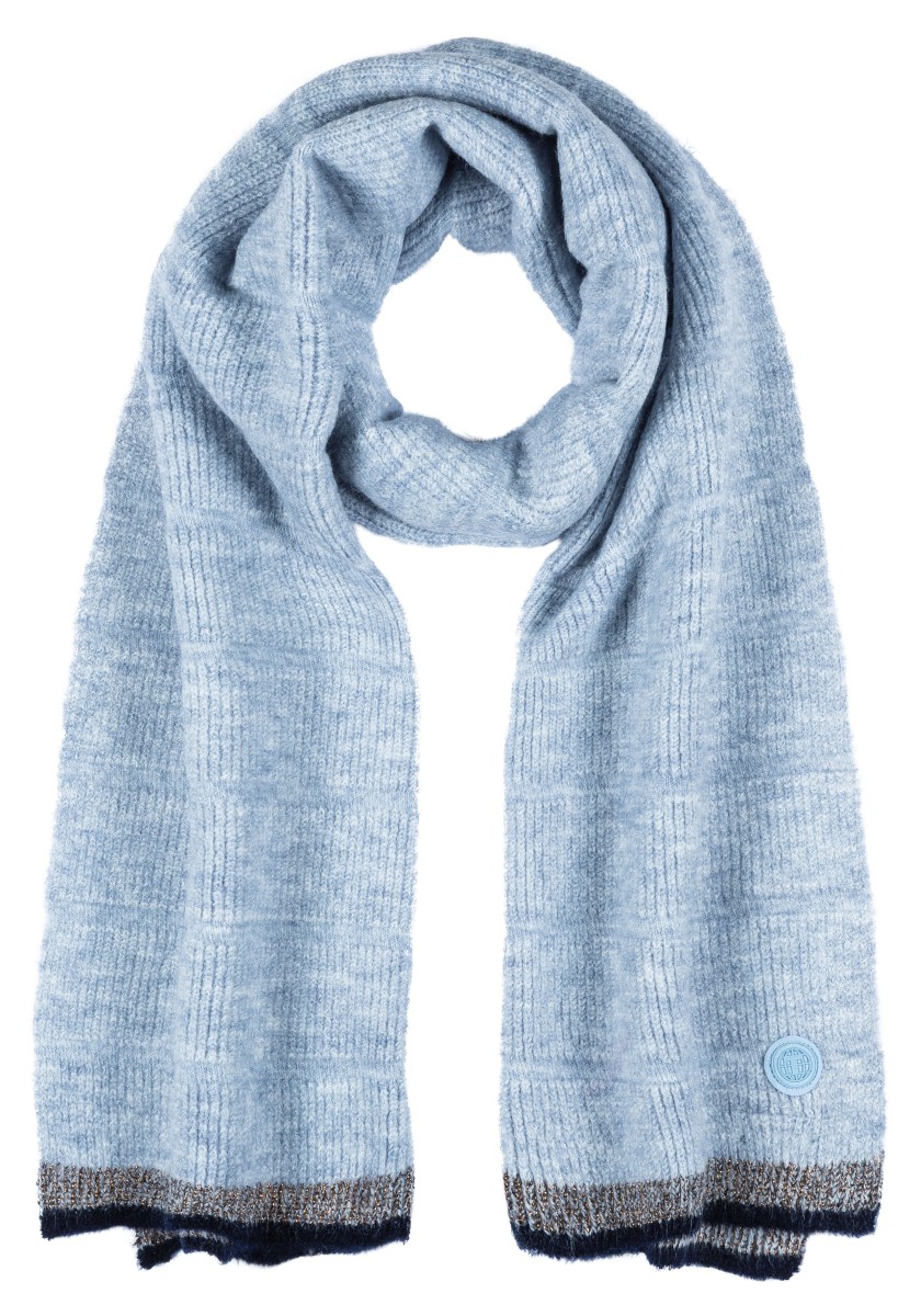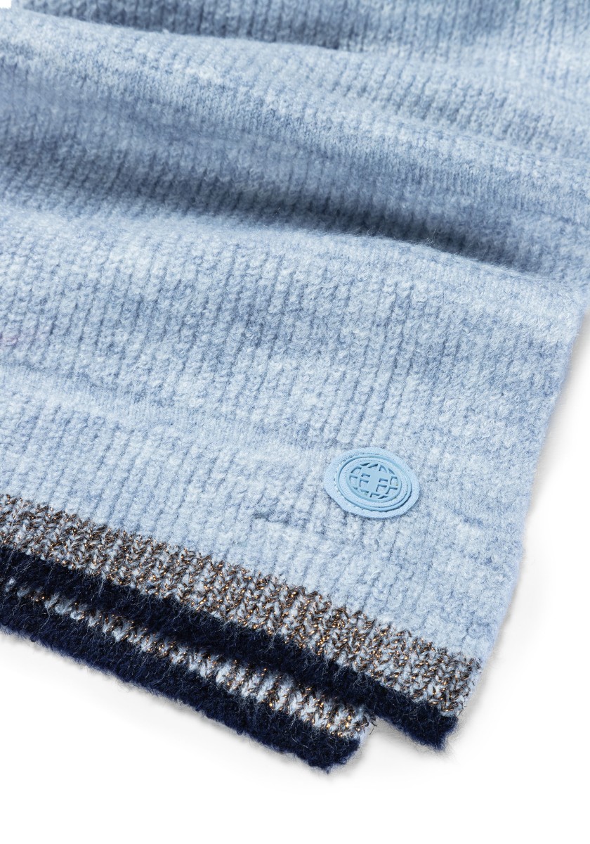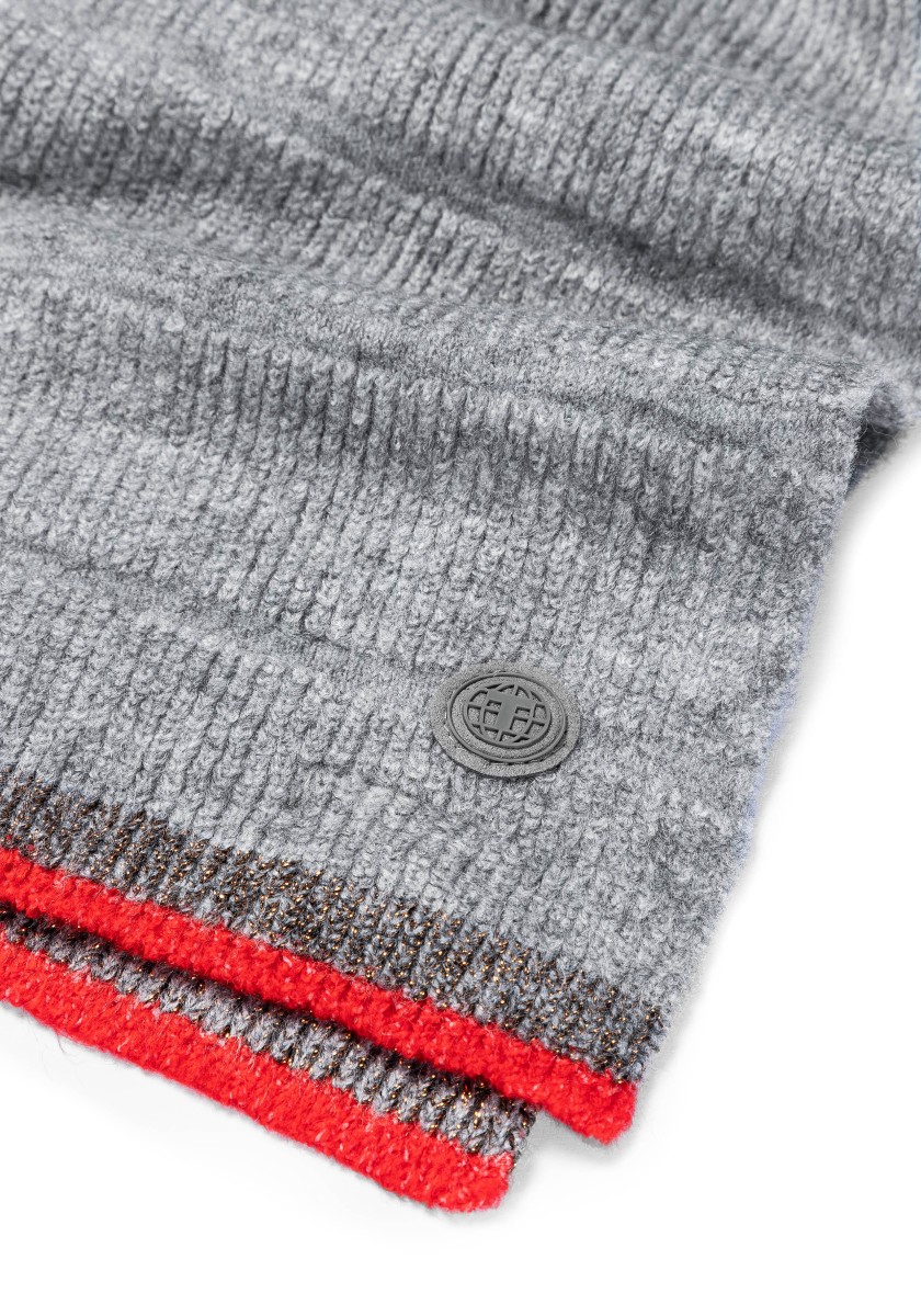 They are stylish and warm, spice up any outfit and always make a cool statement: knitted scarves. This modernly designed model is made from a cozy, super soft yarn mix with a tonal, structured striped pattern and has a perfect styling format. Ideal for placing the casual piece over your shoulders, draping it, knotting it or simply wrapping it loosely around your neck. At the ends: narrow contrasting stripes with glittering lamé yarn.