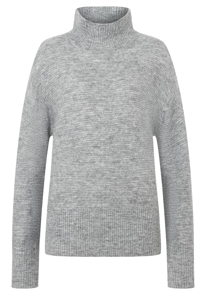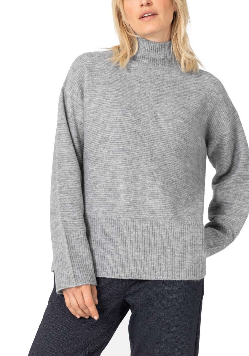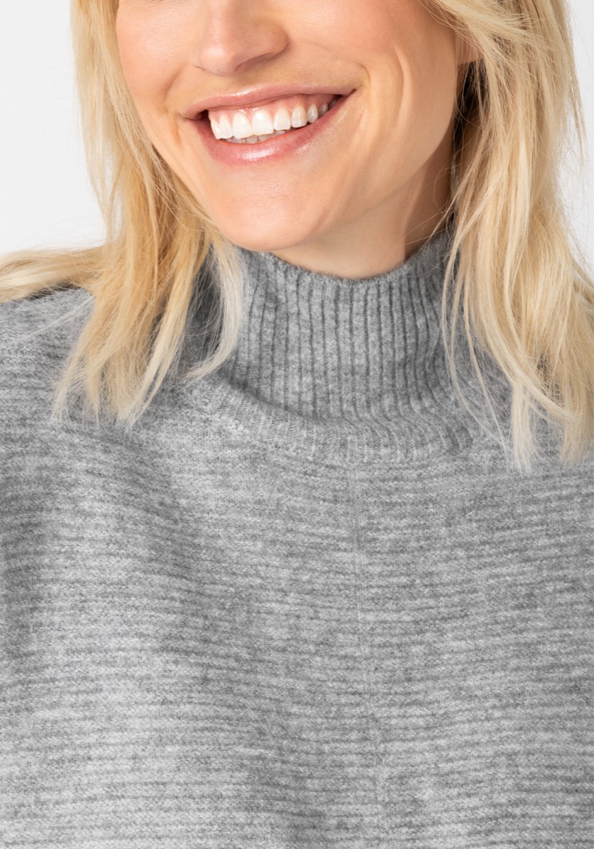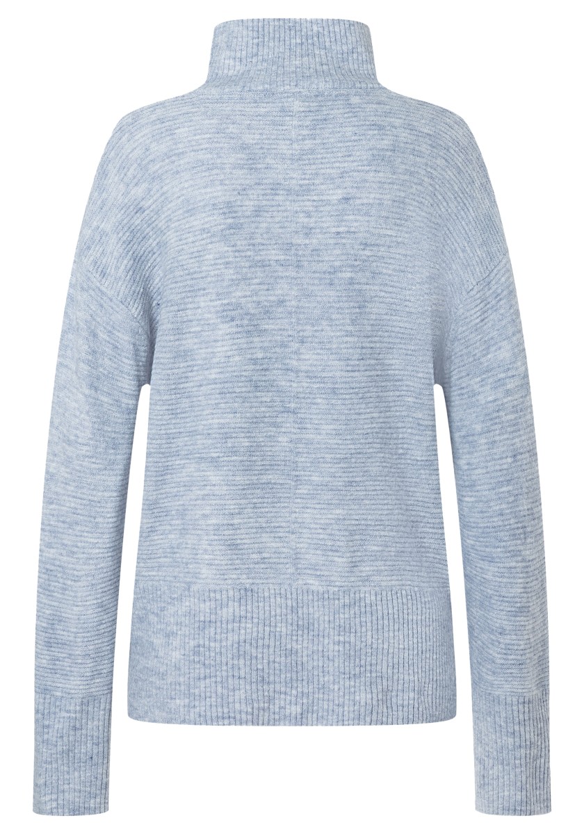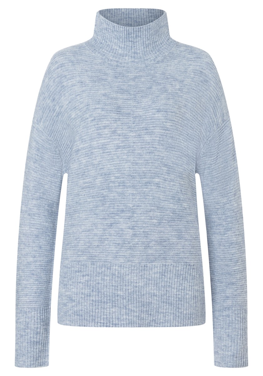 Part of your everyday outfit in the cold season: the knitted sweater. It is as versatile as necessary. For a cool day look, we simply choose our favorite jeans. The casual piece has a straight fit with a ribbed turtle neck, slightly dropped shoulders and wide ribbed cuffs on the sleeves and hem. The quality: A fluffy melange yarn mix with stretchy elastane in a cool purl-ribbed stitch pattern.