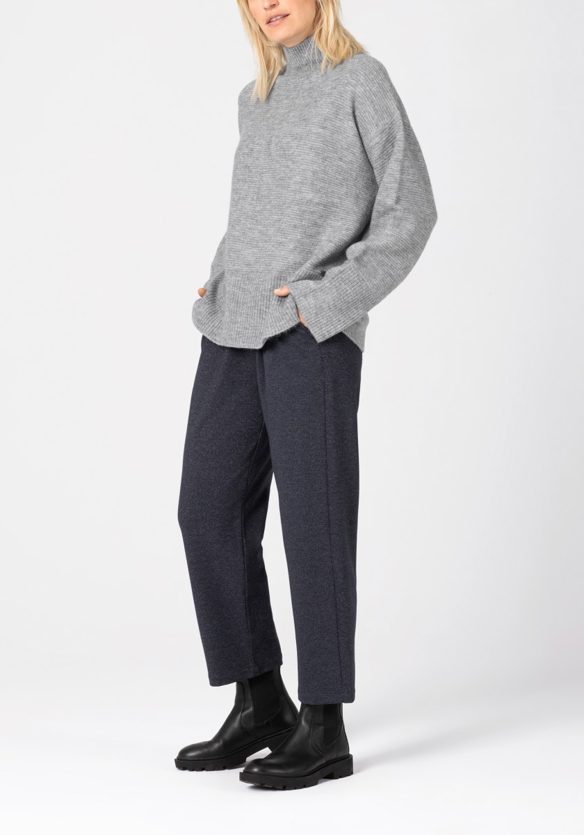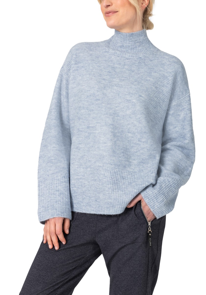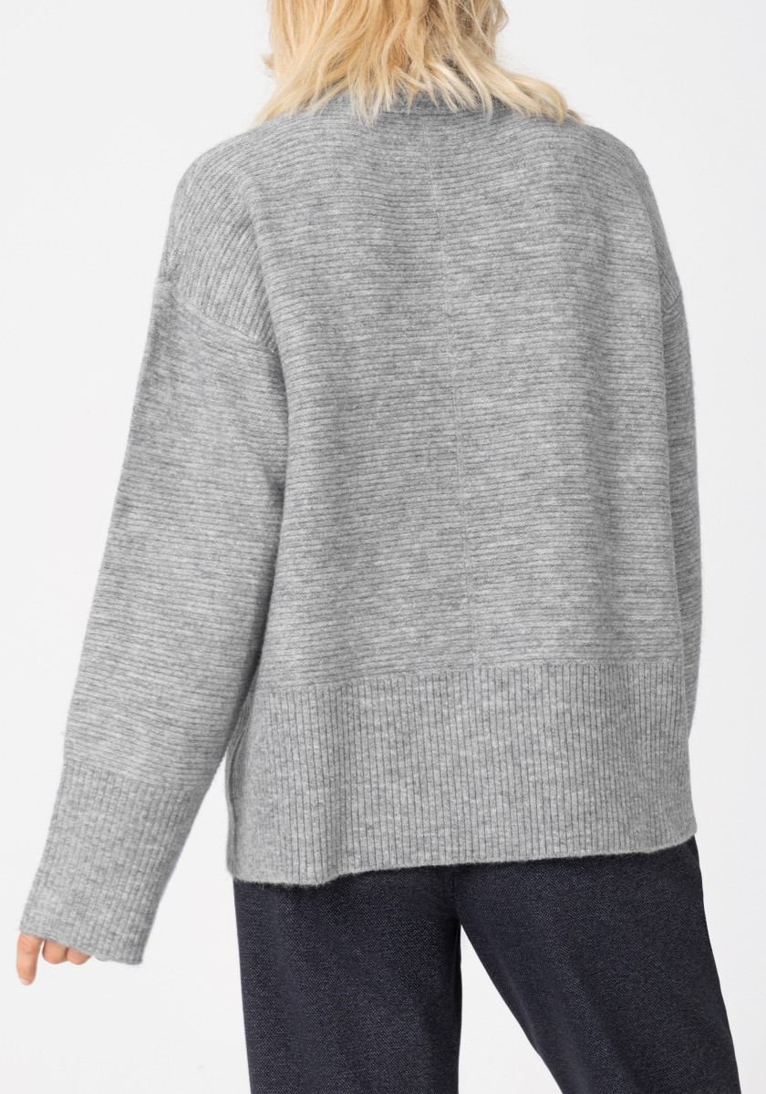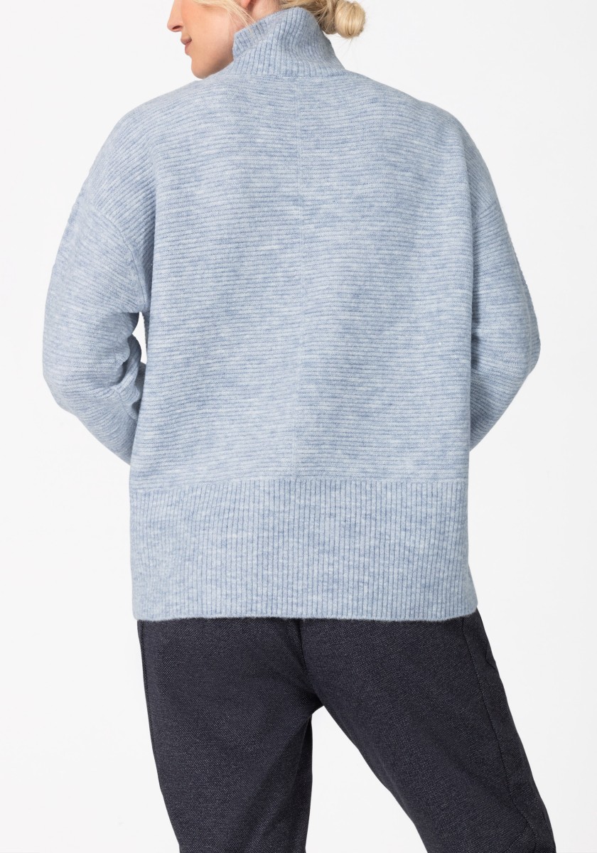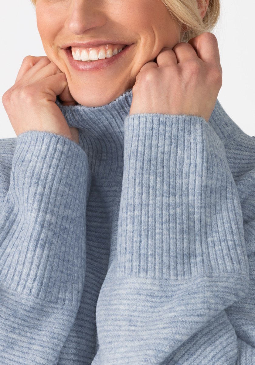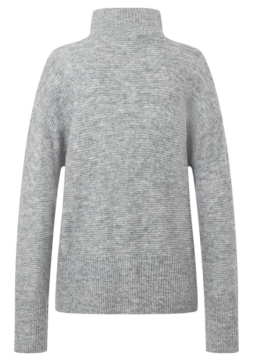 Part of your everyday outfit in the cold season: the knitted sweater. It is as versatile as necessary. For a cool day look, we simply choose our favorite jeans. The casual piece has a straight fit with a ribbed turtle neck, slightly dropped shoulders and wide ribbed cuffs on the sleeves and hem. The quality: A fluffy melange yarn mix with stretchy elastane in a cool purl-ribbed stitch pattern.