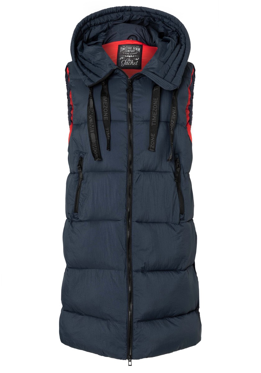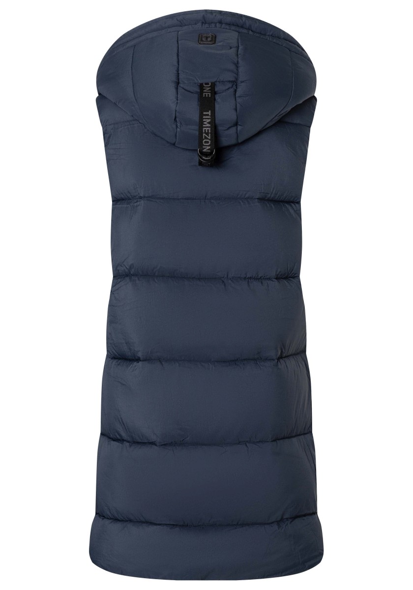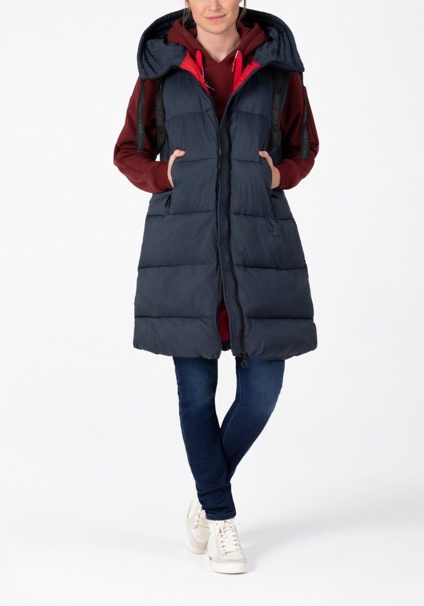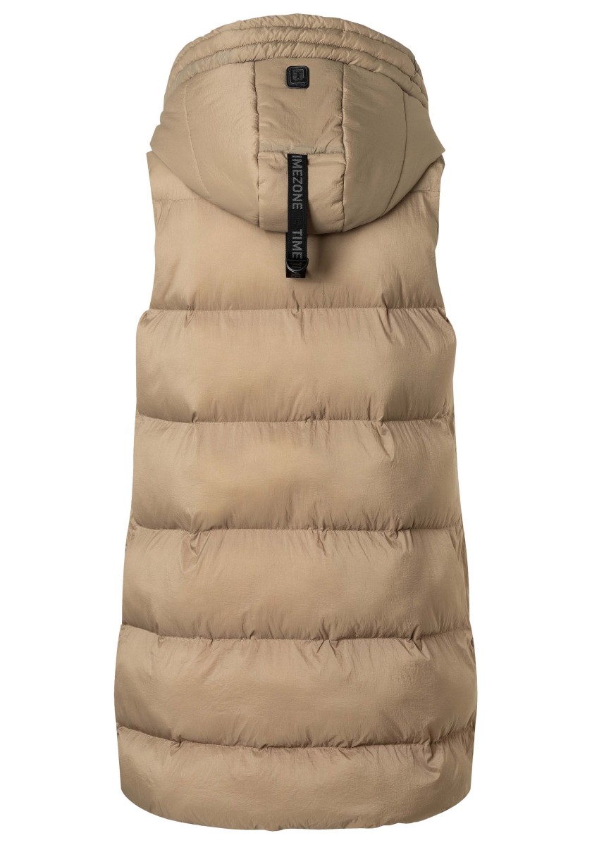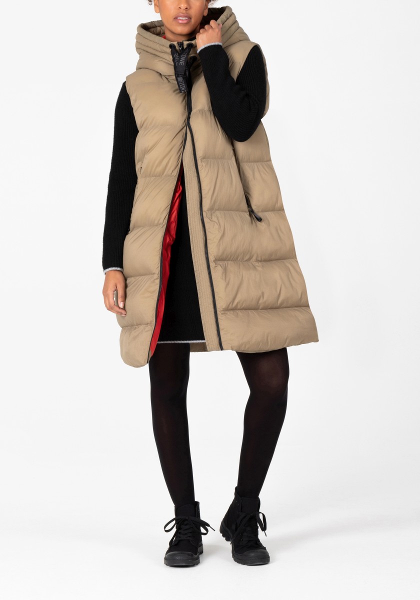 Nejchladnější a nejteplejší trend, který zima nabízí: dlouhá péřová vesta s vodoodpudivým povrchem. Ležérní objemný kousek má velkou pevnou kapuci s širokým prošívaným měkkým okrajem, vysoký límec a podšitý přední zip, který nepropouští vítr ani počasí. Praktické: dvě vnější kapsy na zip. Vysoká kvalita: výplň Sorona® je prodyšná, má vysokou schopnost zadržovat teplo a je velmi lehká. Tip: oblékněte si je k úzkým kalhotám.