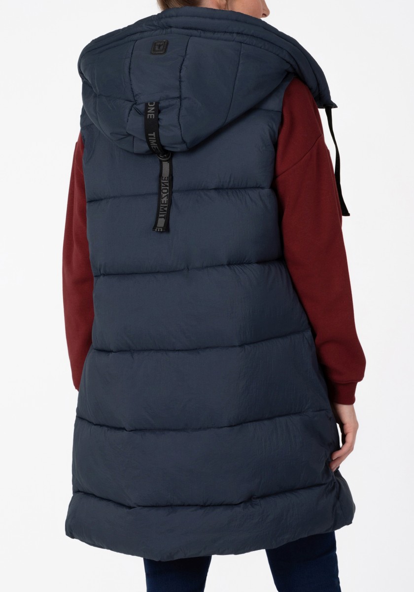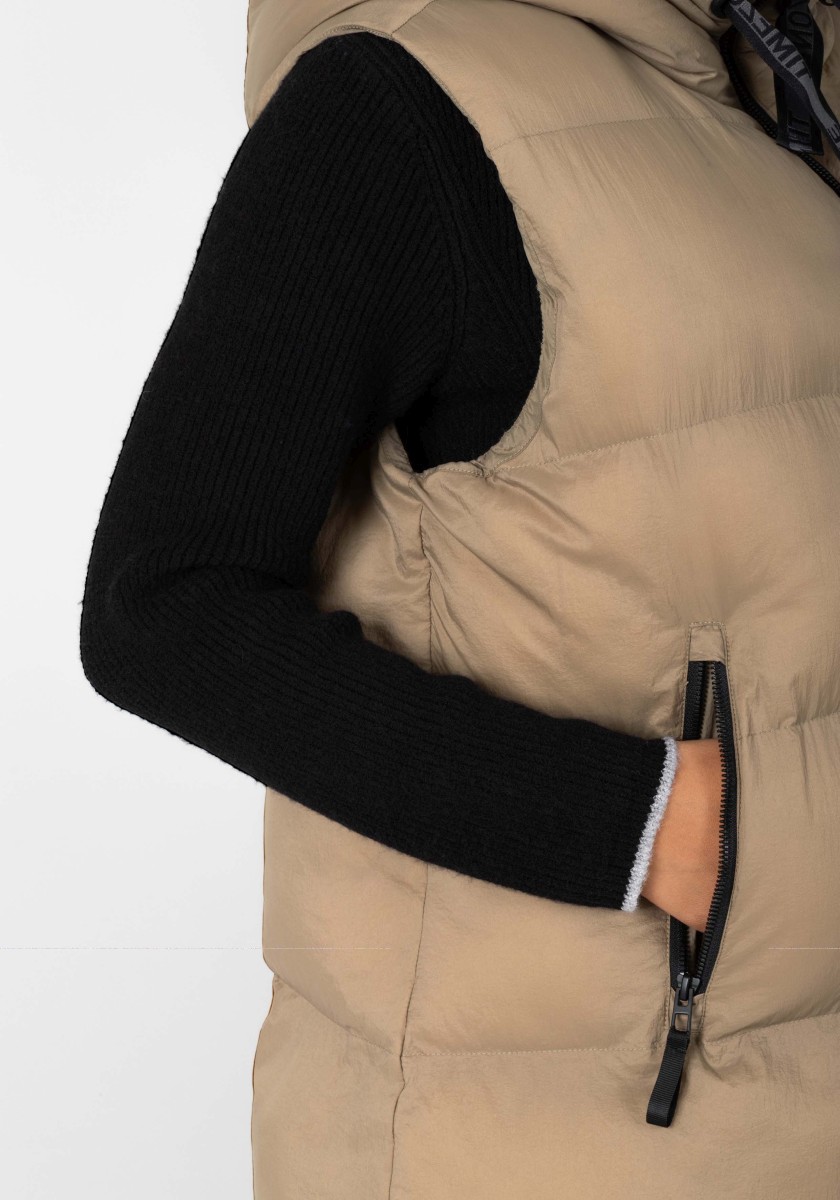 The coldest and warmest trend that winter has to offer: the long down vest with a water-repellent coating. The casual voluminous piece has a large fixed hood with a wide quilted soft edge, a high collar and a lined front zipper that doesn't let the wind or weather through. Practical: two external zipped pockets. High quality: the Sorona® filling is breathable, has a high heat retention capacity and is very lightweight. Tip: wear them with skinny trousers.