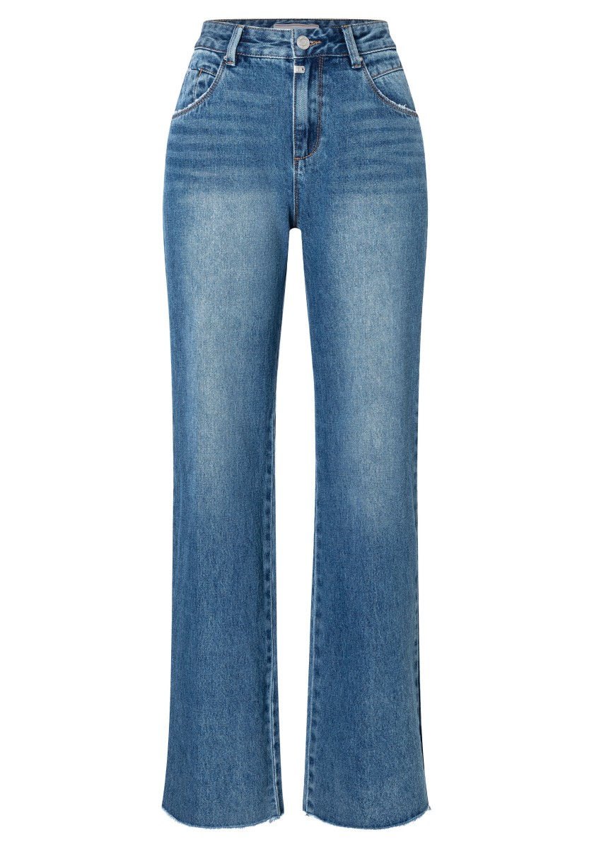 It fits perfectly, with an extremely casual cut and high waist, they are ultra comfortable and fit for every look. Modern five -piece cut in high -quality color Denim color from a mixture of cotton with a little elastane. In places with a destroyed effect, different color yarn, which are woven into the reverse of the fabric, shine through. Slapped jeans with wide legs have a casual fringed hem.