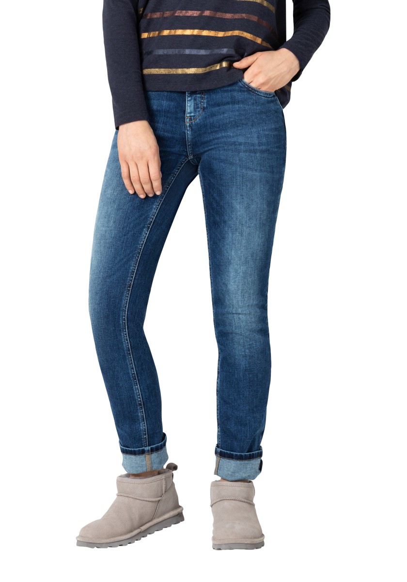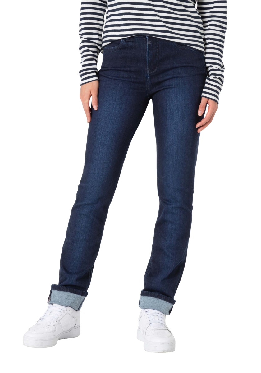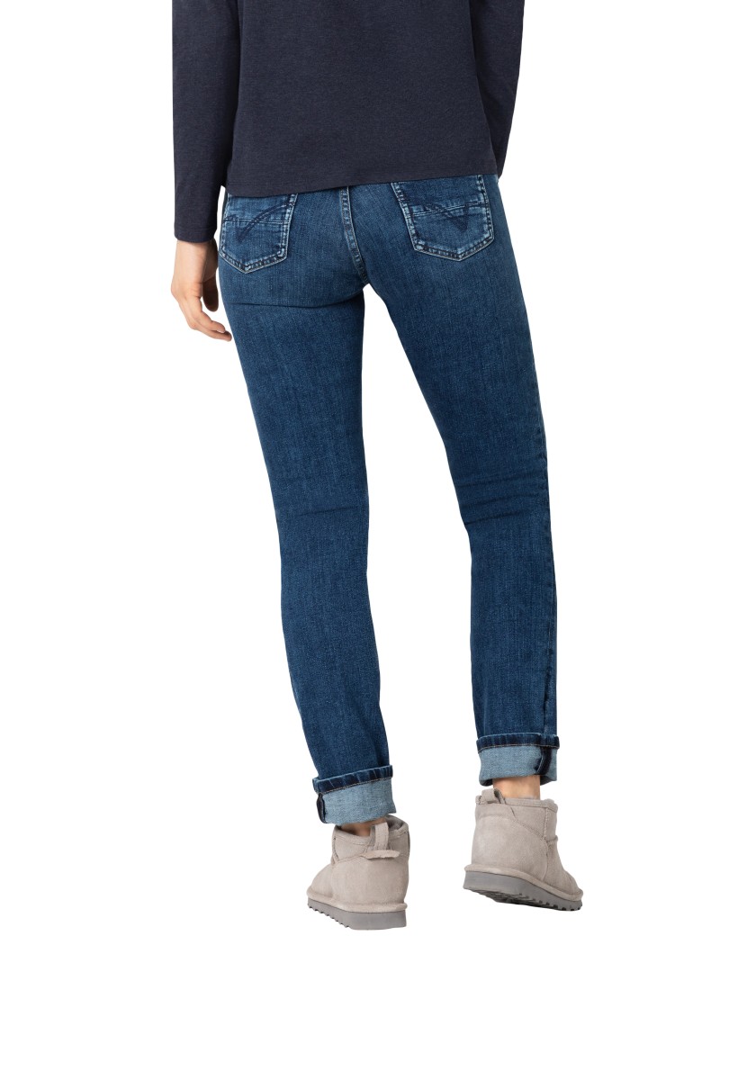 Perfect basic jeans: This high waist slim model is equipped with a mixture of polyester and elastane in a fabric that expands pants and achieves perfect falling. A model with a straight leg in an extra length, which can be rolled in different ways and give it an individual touch. Sophisticated rear pockets are optimally placed and ensure flattering silhouette. We like the denim version in the dark slimming washing with tone seams.