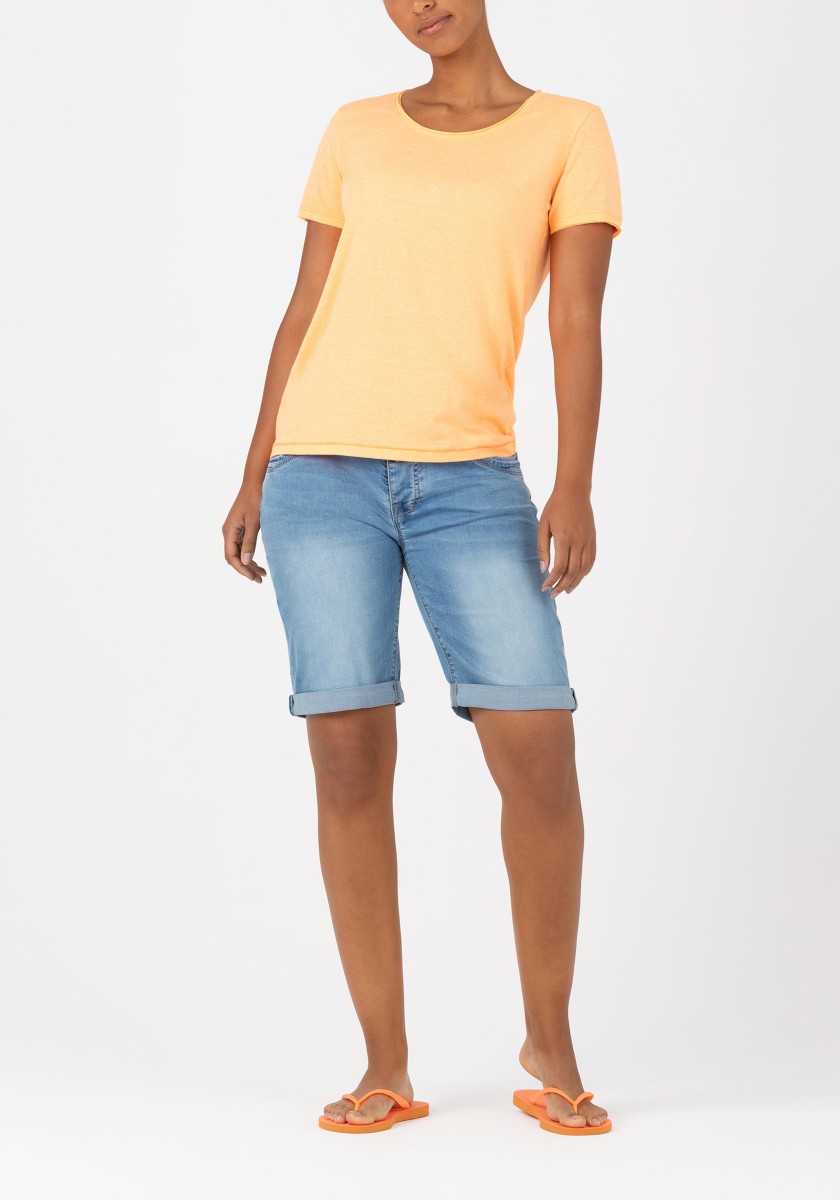 They've long since gained cult status, and every summer they return to the top of the must-have list: denim shorts. The slim fit model with a medium blue "fresh indigo" wash, incorporated seat pleats and lighter parts has been given a fashionable twist: with a modern design and intricate details. High-quality denim meets the highest demands. It is light, comfortable, very soft and has a high stretch factor. A modern style with five pockets and buttons on the front.