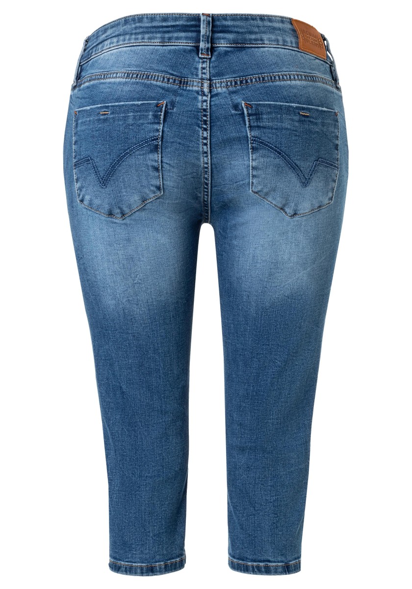 Perfect fit, feminine fit and timeless design: the Capri jeans in soft cotton blend in high quality Bright Stretch Denim. A style with five pockets, small decorative rivets, pitreuse stitching and short slits at the hem. With lighter washed sections and permanent pleats at the yoke. Casual cropped trousers can be worn with any look and know no style boundaries. Extra styling tip: team with a linen blouse, chunky sandals and your favourite bastard basket.