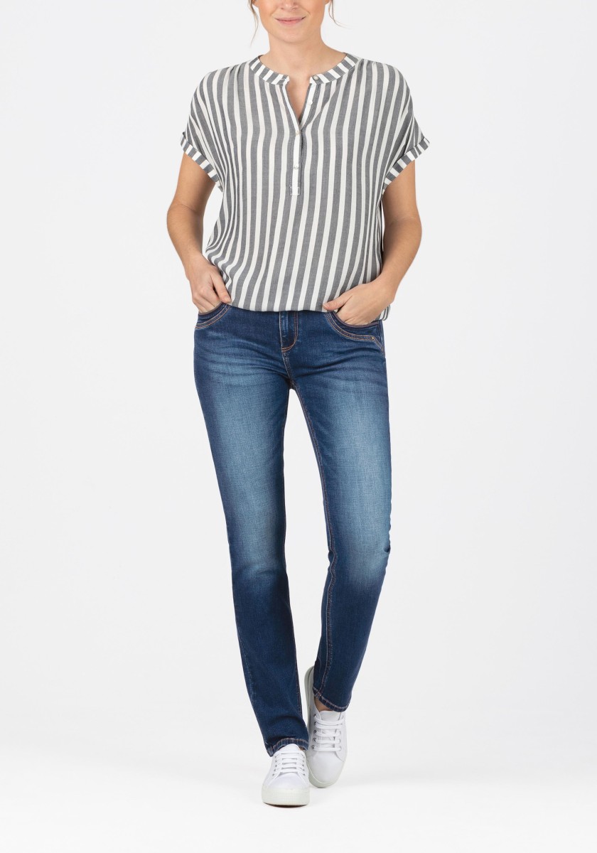 Mladý, moderní design džínů z vysoce kvalitní džínoviny v robustní bavlněné směsi. Ležérní úzký střih s rovnými nohavicemi, moderní varianta střihu zajišťuje dokonalou ženskou siluetu, elastan se natahuje a hraje významnou roli v dobrém padnutí. Velké zadní kapsy s nášivkami dělají spodní část menší a plnější. Detailní rozpětí s lemováním z pravé kůže.