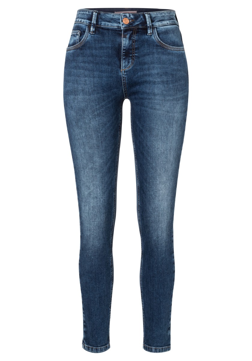 Přiléhavý střih překlenuje mezeru mezi úzkým a úzkým střihem. Je všestranný, vypadá dobře a díky zeštíhlujícímu efektu lichotí každé postavě bez výjimky. Nejdůležitější role: Přiléhavá silueta a perfektní střih. Tento strečový džínový styl má dobře vyvážený základní styl s pěti kapsami, vysoký vzestup a středně výrazné modré sepraní s kontrastním prošíváním a lehkými oděrkami. Kvalita: Elegantní směs bavlny a polyesteru s elastanem.