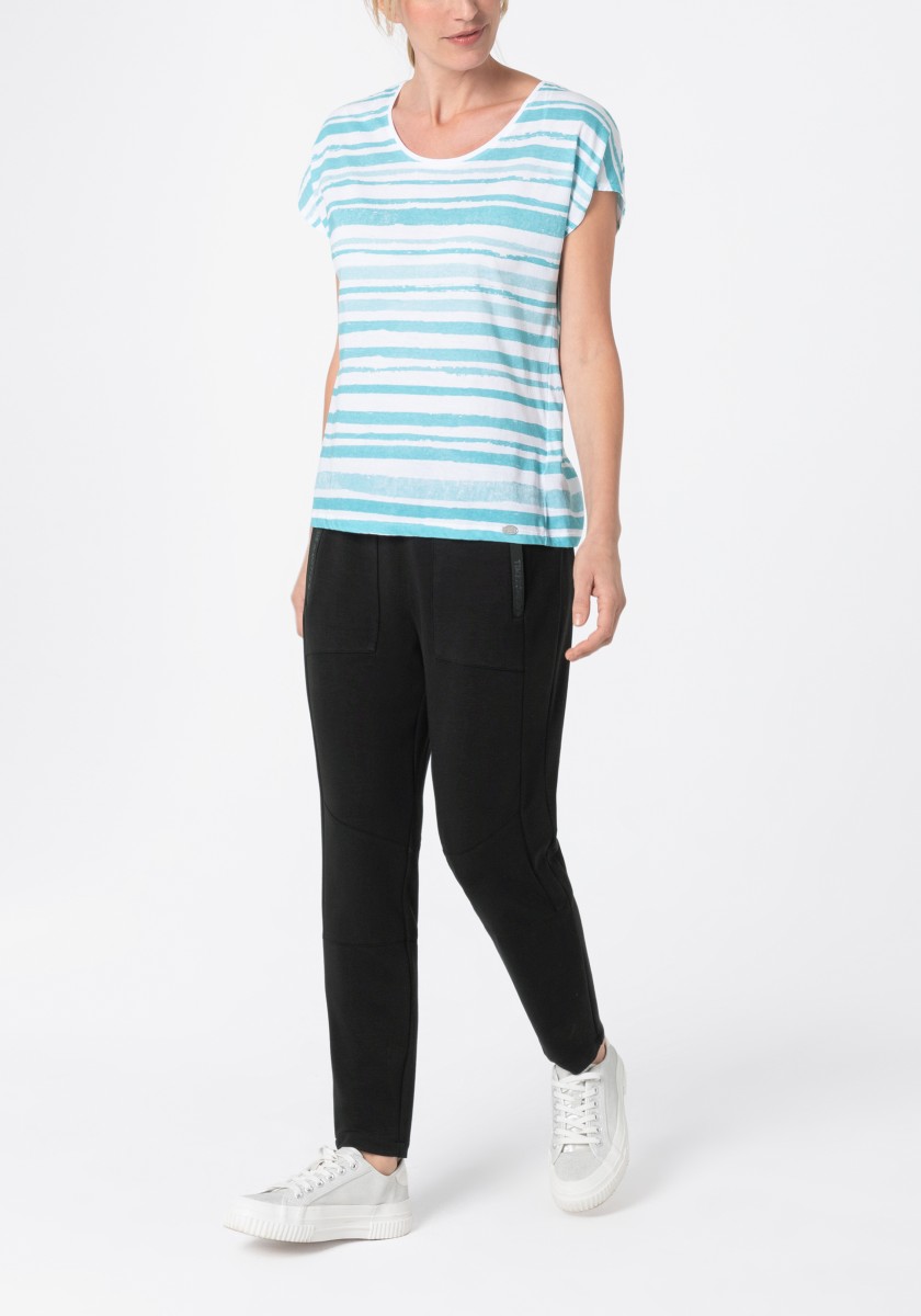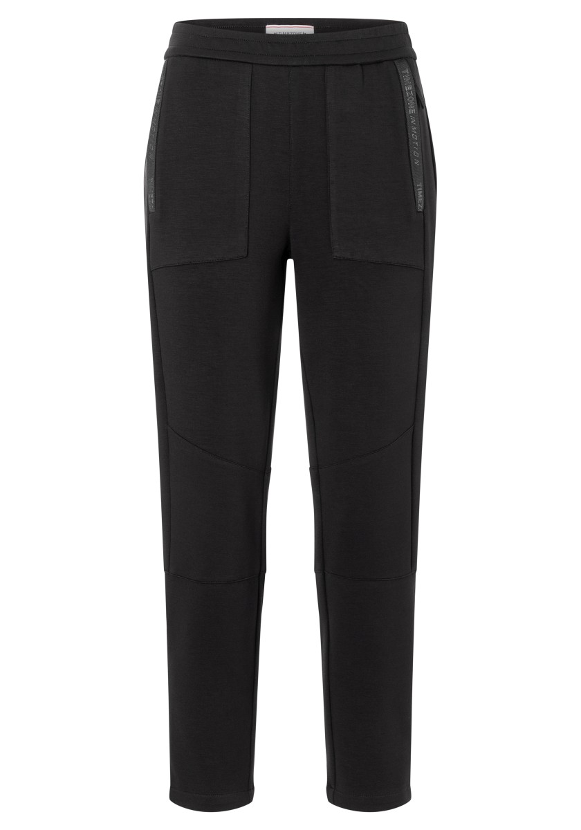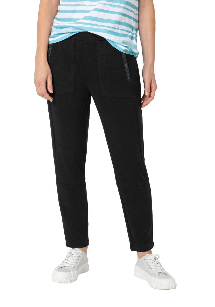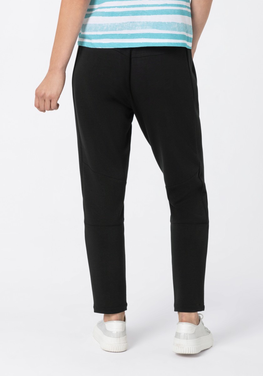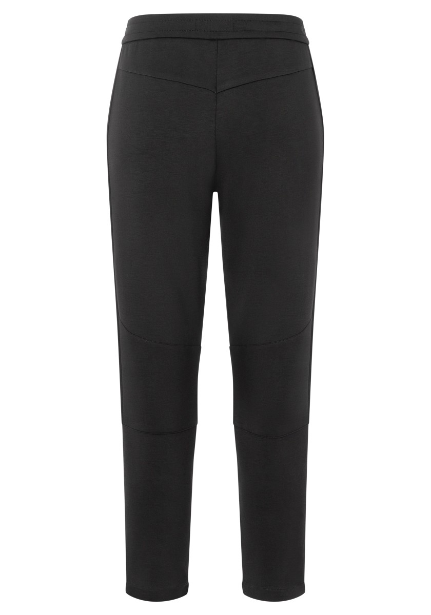 Informal, sports pants in athletic appearance. The combination of everyday and sportswear has long since become a fashionable necessity. This functional slide model does not require any fastening and has a comfortable elastic waist and a fashionable leg length. With two inserted zippered pockets, decorative seams and highlighted knee areas. Super soft stretch jersey in interlock quality made of high quality mixture of viscose and polyamide with elegant matte gloss.