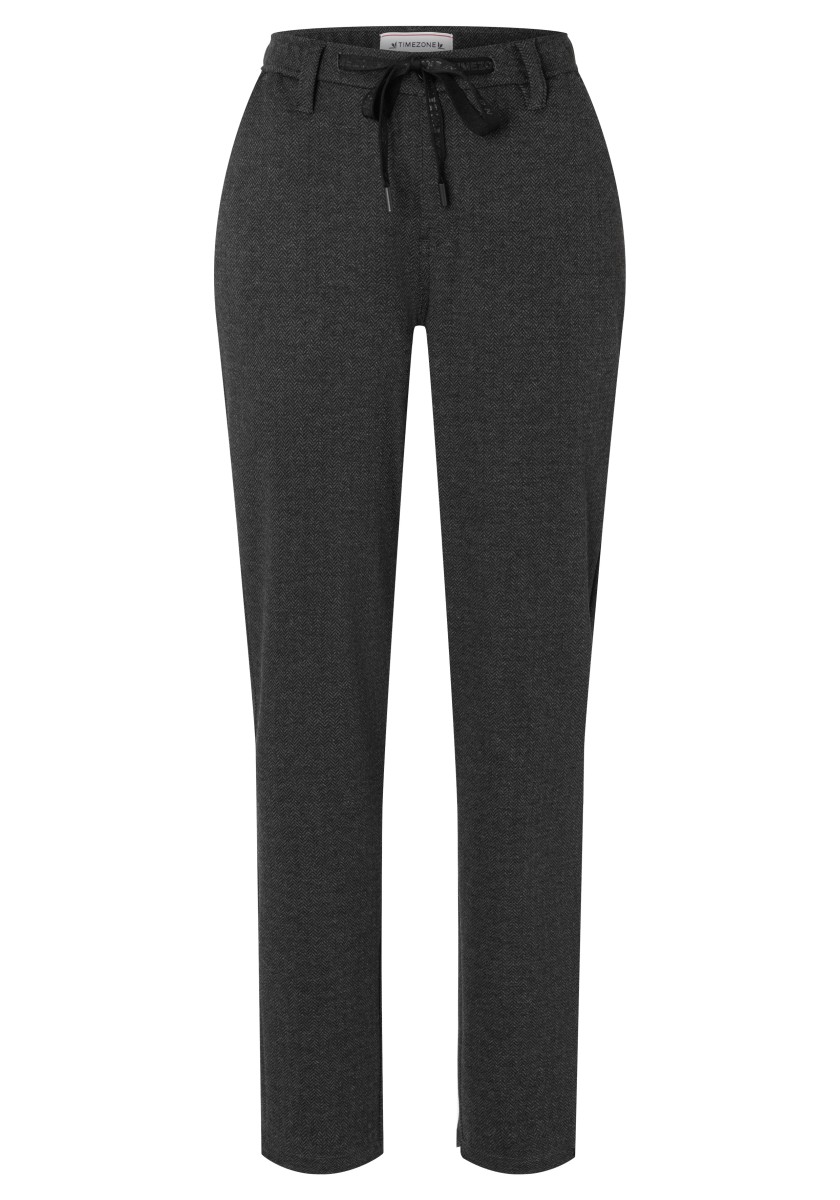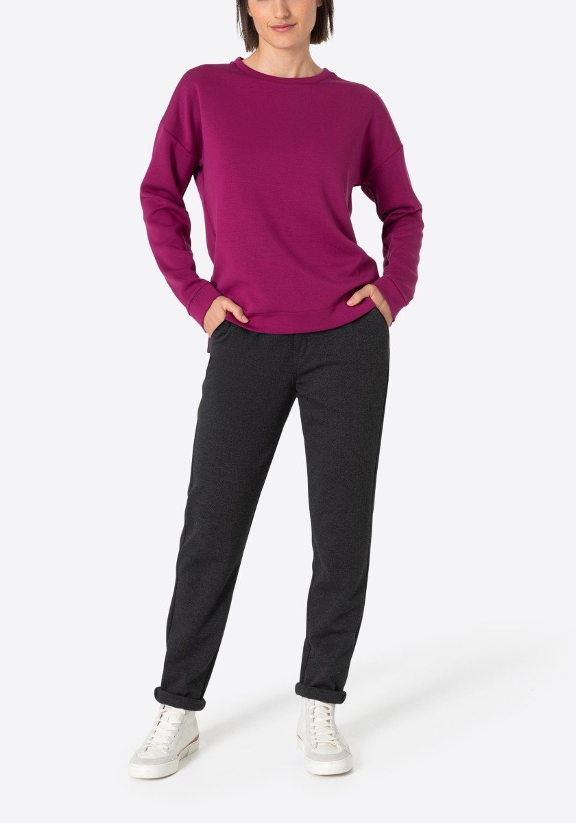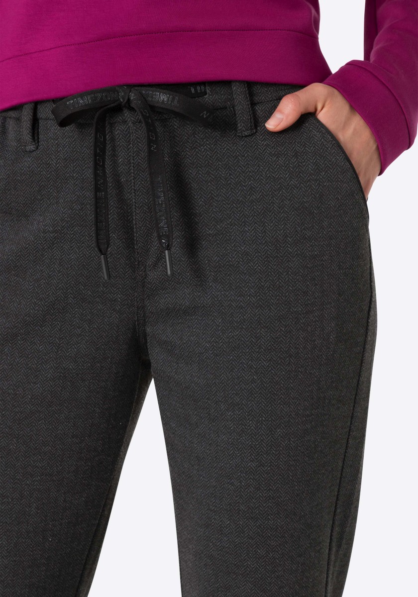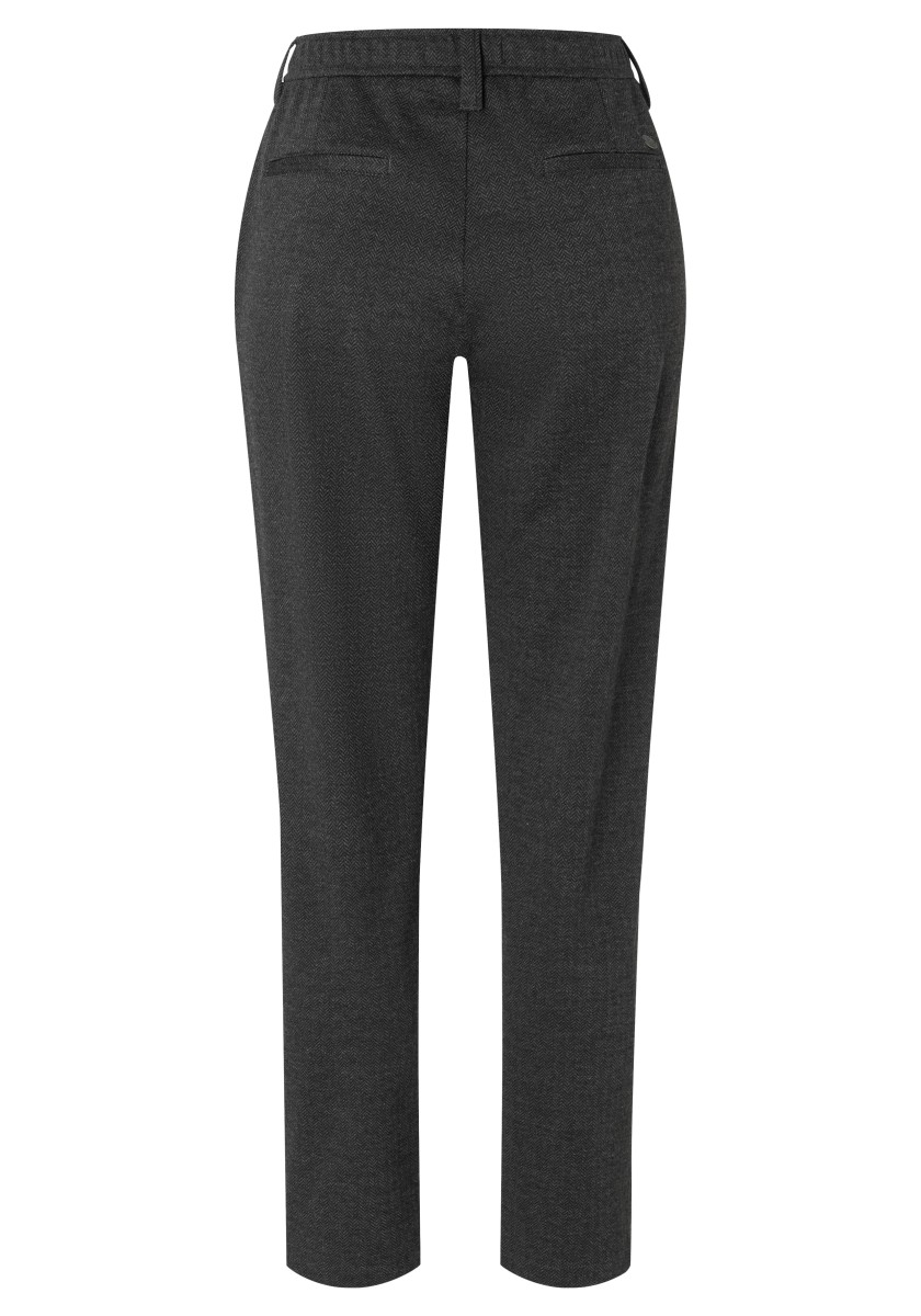 The new pants model took our hearts by attacking: casual jersey pants with the character of jogging pants and an elegant look. It is made of stretch polyester mix with wool appearance and has a timeless classic pattern of fish bone. Comfortable regular cut with normal waist height and shortened legs. The pants have an elastic waist with a drawstring and a string area with a logo. Oblique front pockets and fake quilted pockets on the back. Fastening: Classic zipper.