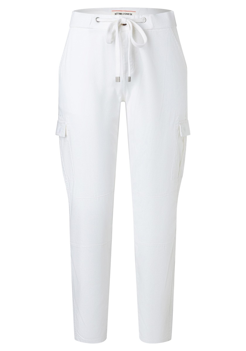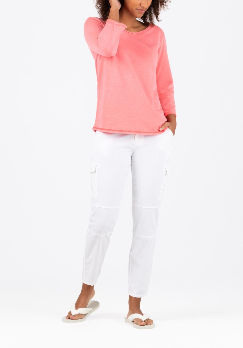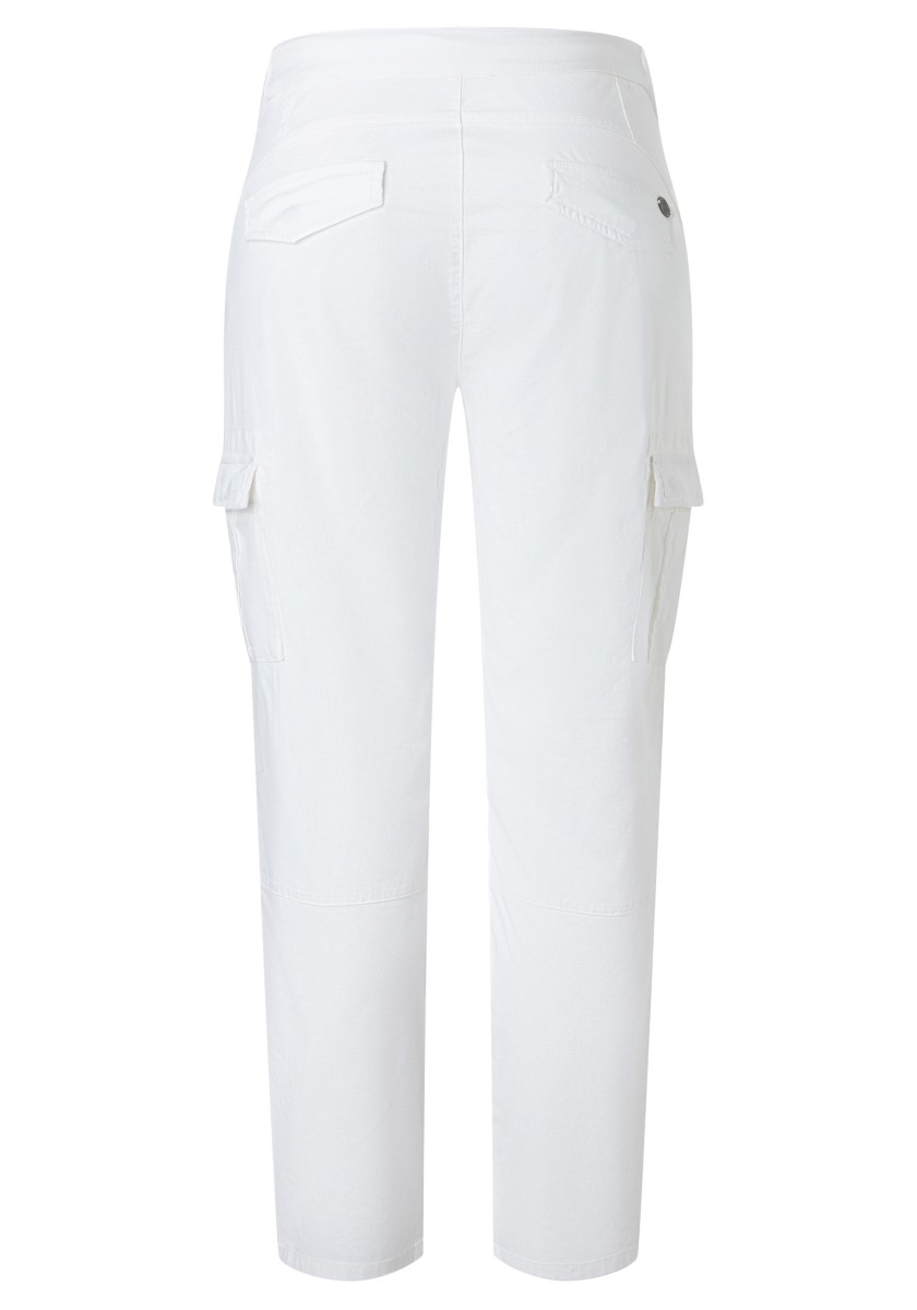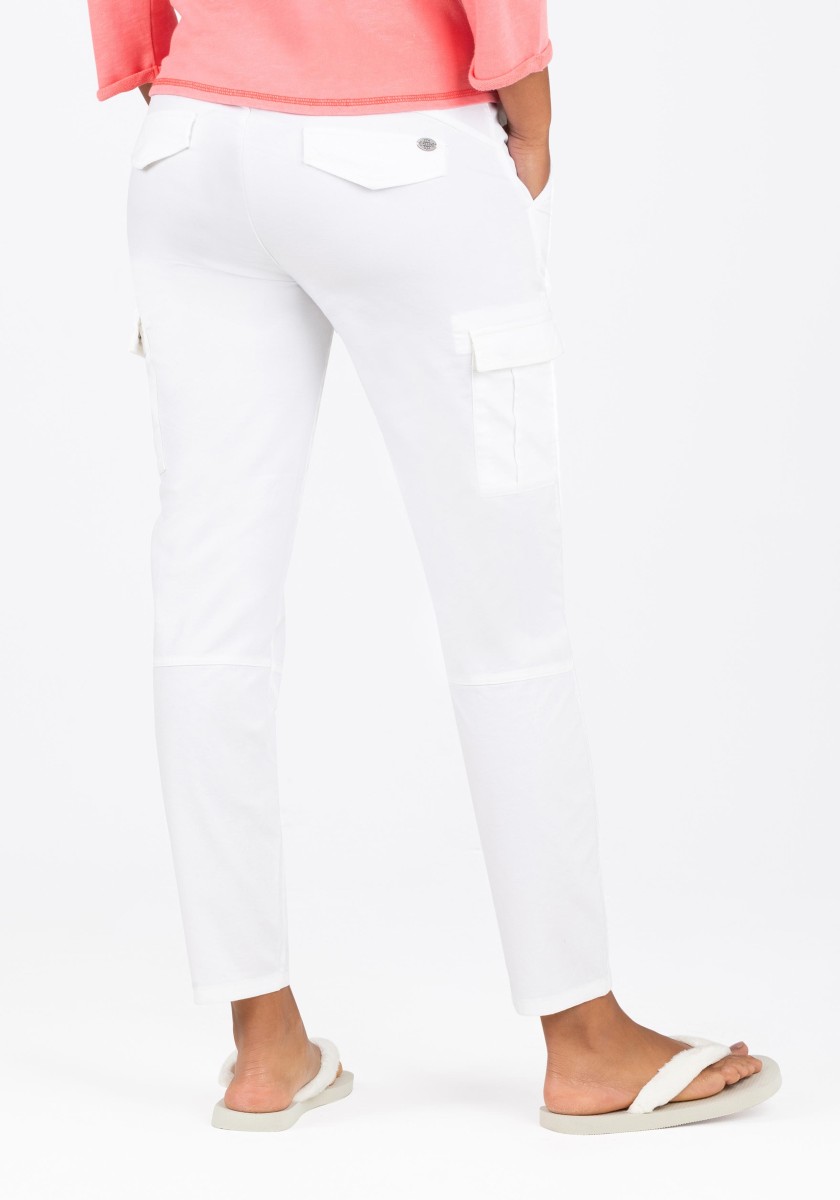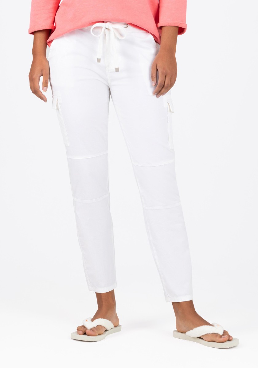 Cargo jog pants are once again the sportiest trend of the season! New for these trousers: a feminine, cropped slim fit and a sophisticated waistband with drawstring, tie belt and ribbed knit details on the sides. The garment's dyeing process ensures a casual colour scheme. Here, the finished sewn pieces are dyed, which can lead to deliberate irregularities in the appearance of the colours. Quality: high quality, stretchy Fresco material made from a structured cotton blend.
