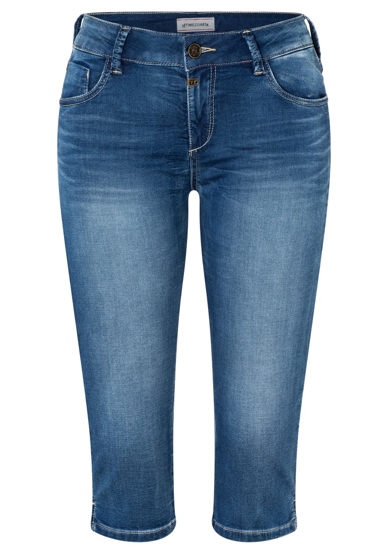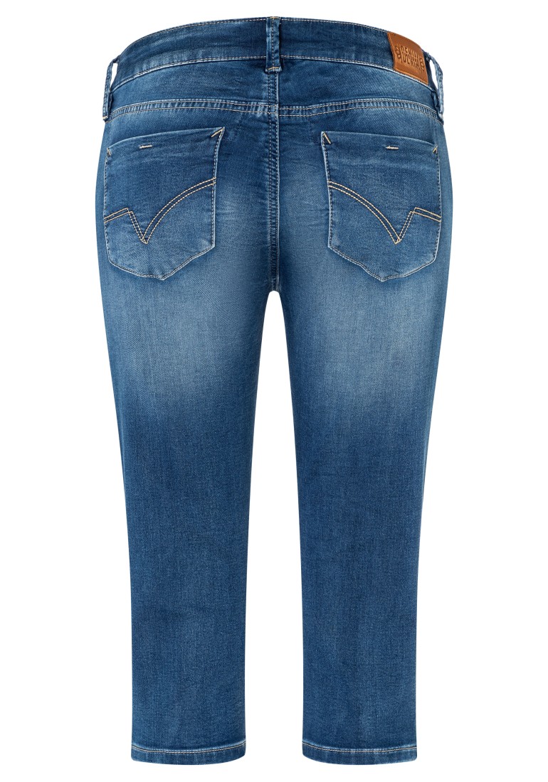 The summer capri version of the Tight Aleena - a versatile model that always looks good and flatters every figure without exception. Due to the narrow silhouette, the cut plays the most important role here. This 3/4 length jeans model has a modern style with five pockets, a regular waist and a medium blue colour with creased effects and lighter parts on the thighs. Capri jeans are timeless and also always a strong trend.