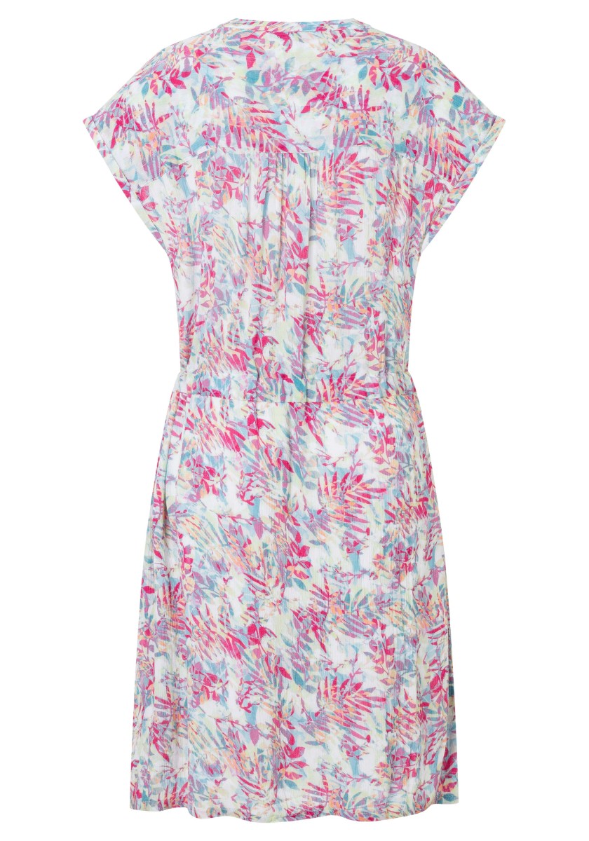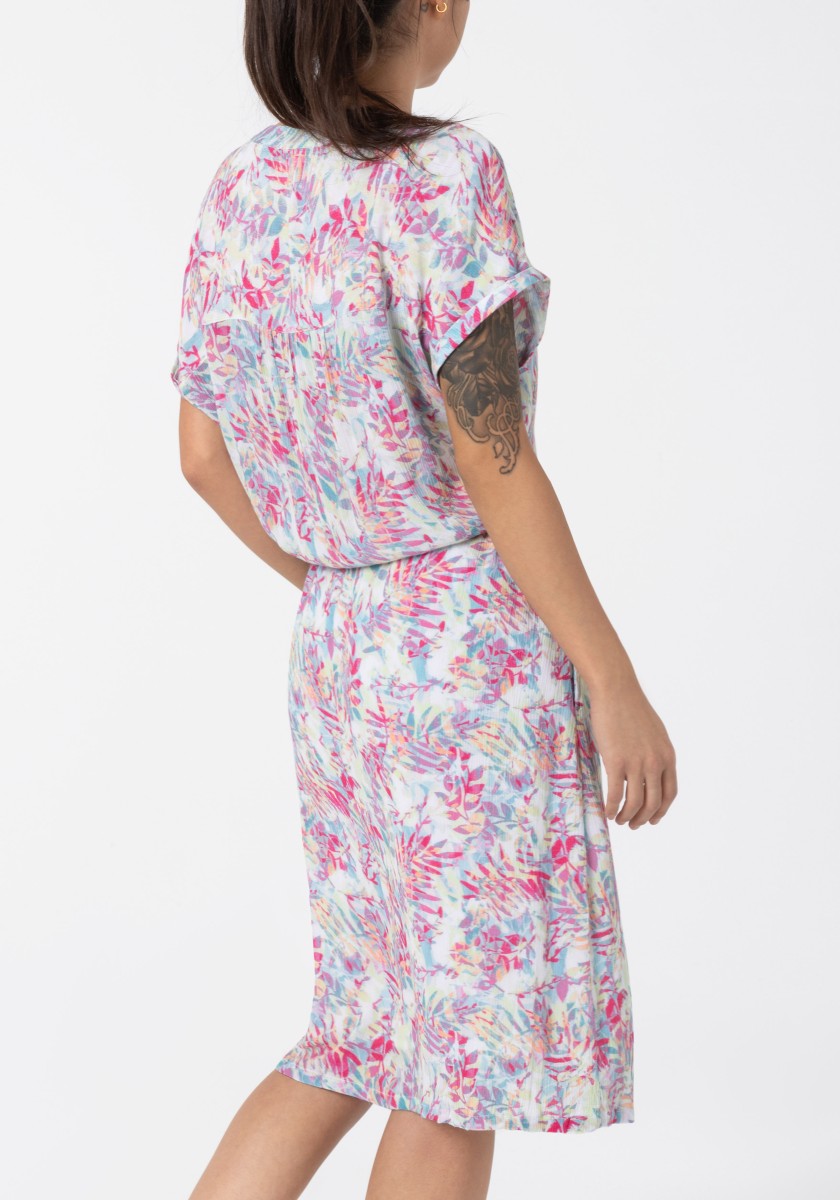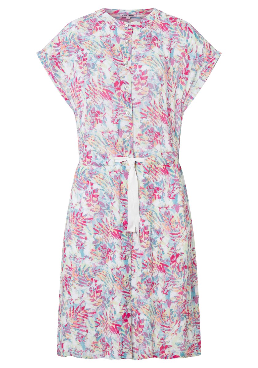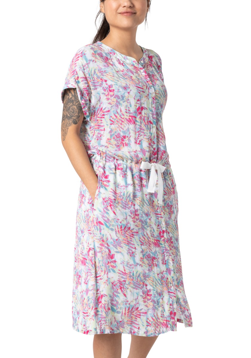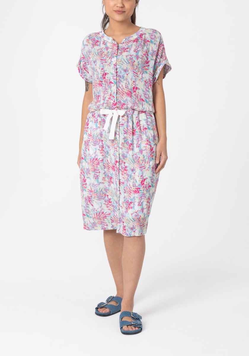 Přesně tak vypadá náš oblíbený trend letních šatů: vzdušný střih, kvalitní viskózový materiál, mírná délka a cool celoplošný vzor. A díky stahovací šňůrce v pase lze šířku libovolně měnit. Košilové šaty mají stojáček, přední knoflíky a praktické boční kapsy ve švech. Přestřižená oblast ramen je žensky nařasená a zakončená pevnými manžetami. Milujeme!