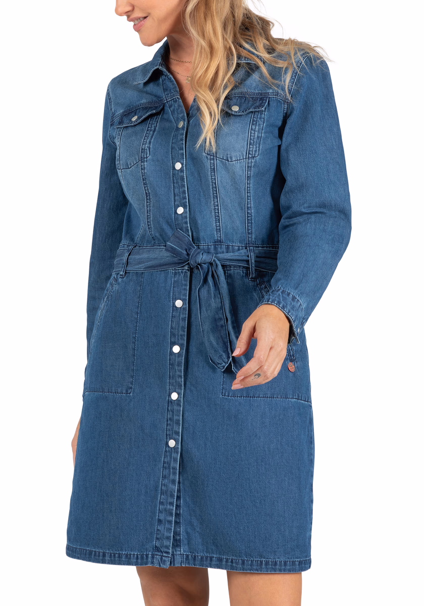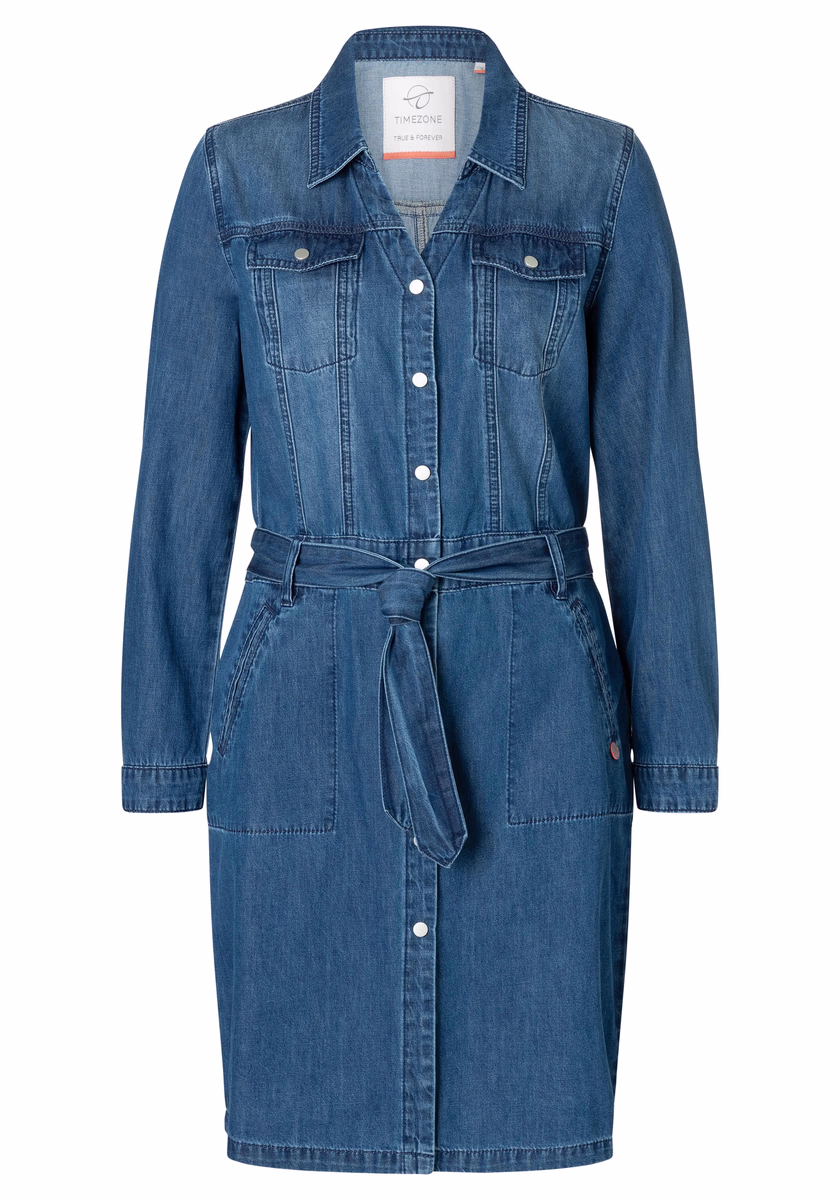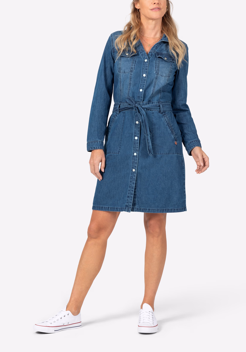 Džínové šaty! Vzhledem k tomu, že tyto šaty mluví samy za sebe jako módní trend, nevyžadují mnoho stylingu a jen pár doplňků. Je inspirovaná džínovou bundou a je vyrobena z čisté, seprané, tmavě modré barvené bavlny a má stahovací límec, výstřih do V, náprsní kapsy s klopami, dělící švy, pas s poutky na opasek a pásek, kapsy na druky, zapínání na knoflík vepředu uprostřed a klasické dlouhé rukávy s manžetami. S malým přívěskem srdce.