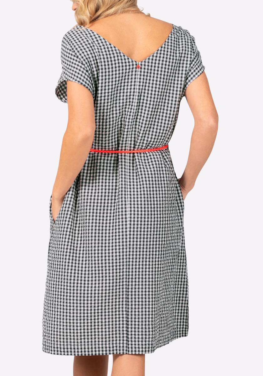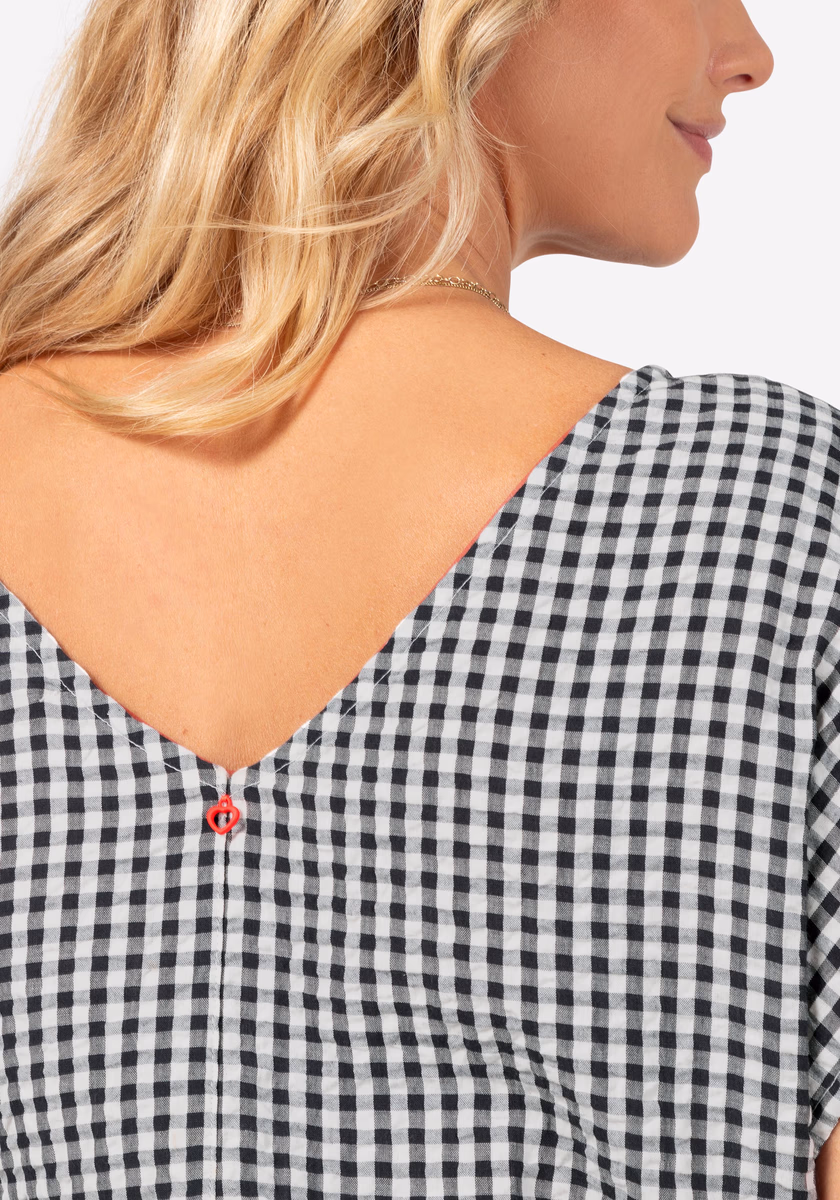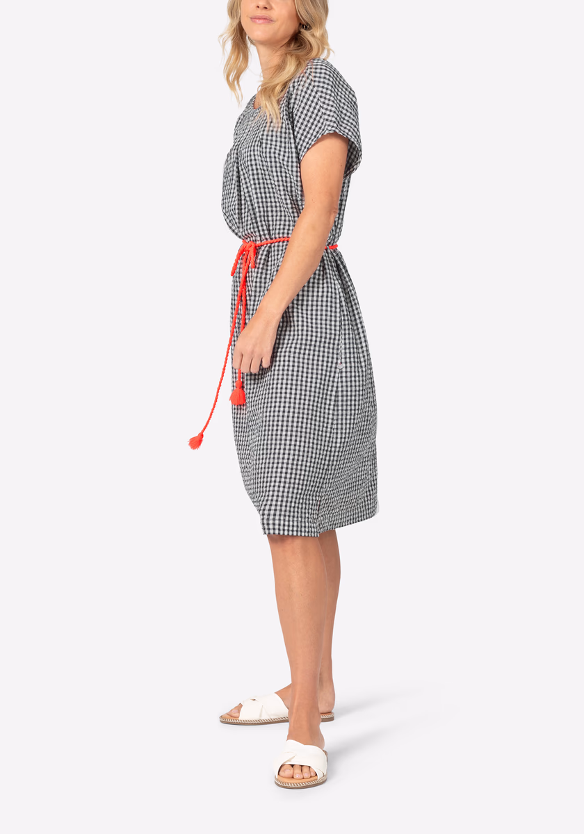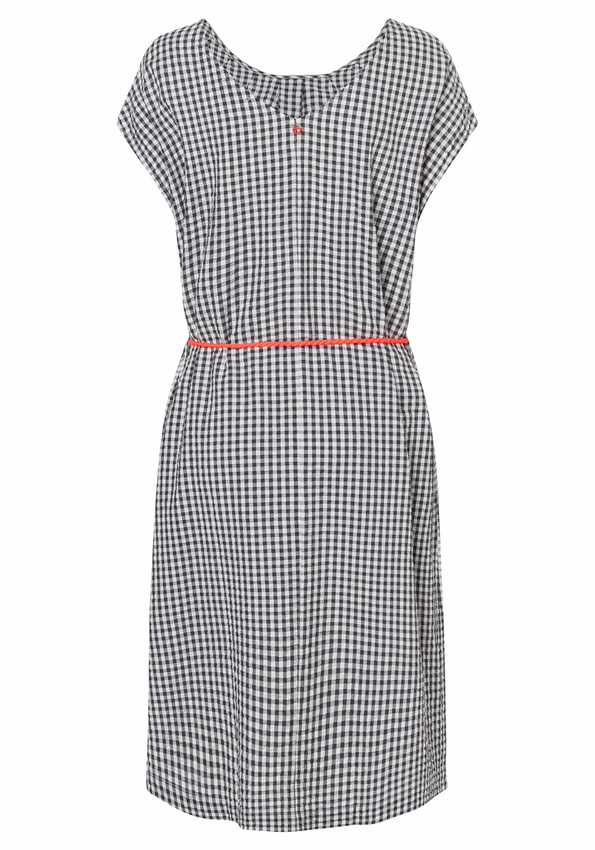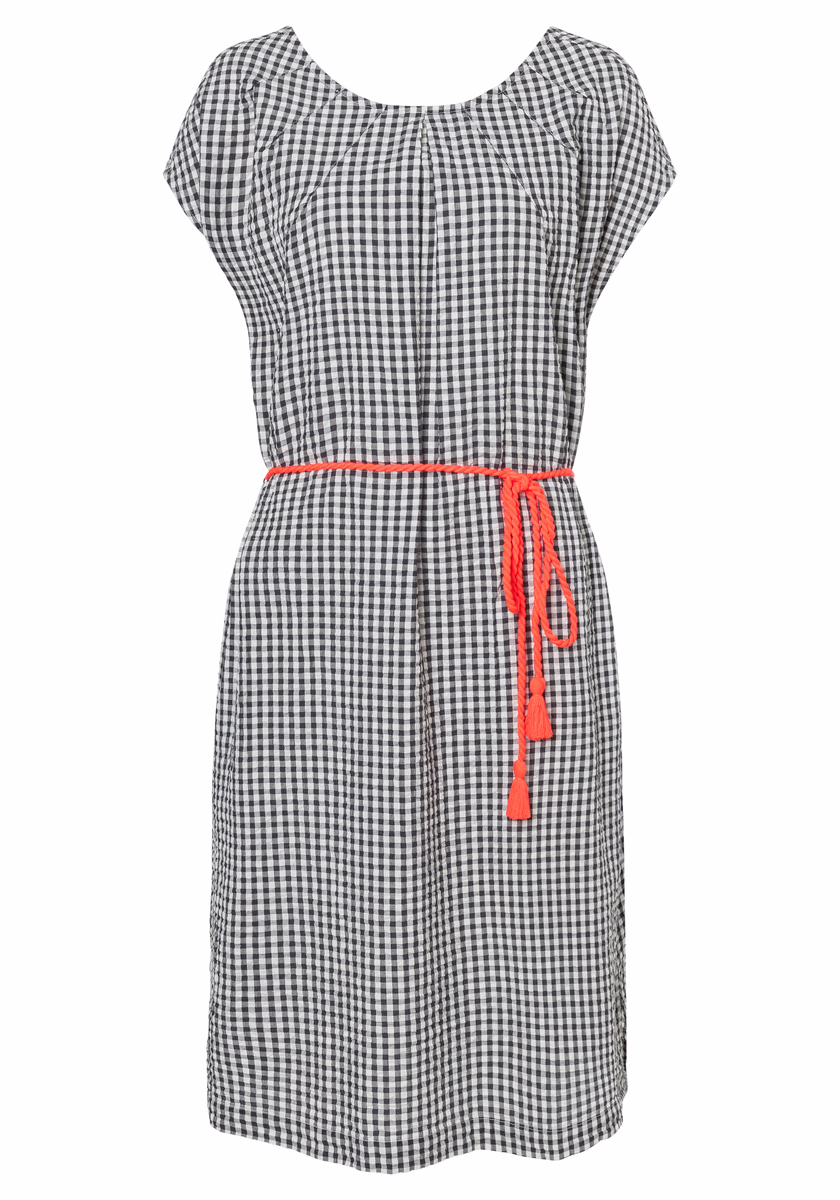 Šaty bez rukávů jsou perfektní kombinací na léto. Vyznačuje se volným střihem, módním slip-on designem a superlehkou, károvanou saersucker kvalitou. Ten slibuje vzdušný pocit díky své krepovité struktuře. Přední kulatý výstřih je řasený, zadní výstřih má výstřih do V s přívěskem srdce. Šňůrový pásek se střapci lze použít ke zvýraznění pasu dle přání. S krátkými bočními rozparky.