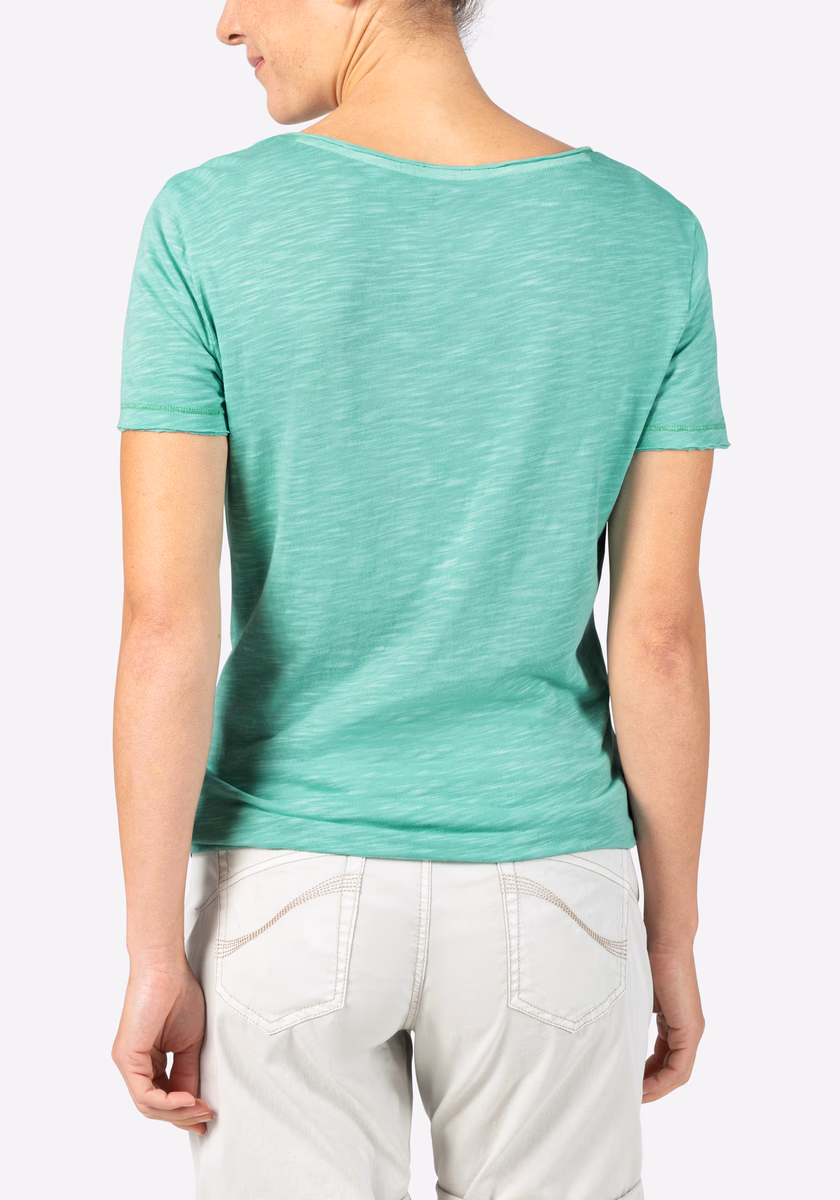 Modern, casual Basic T -shirt with round neckline, short sleeves and distinctive seams in a comfortable female cut. The shirt is made of very light sliding jersey made of mixture of cotton and viscose. All edges and seams are either open, child flat, or naturally cut and rolled up. The model offers many styling options and a wide range of colors. It can be worn throughout the year and adapts to every change in the season.