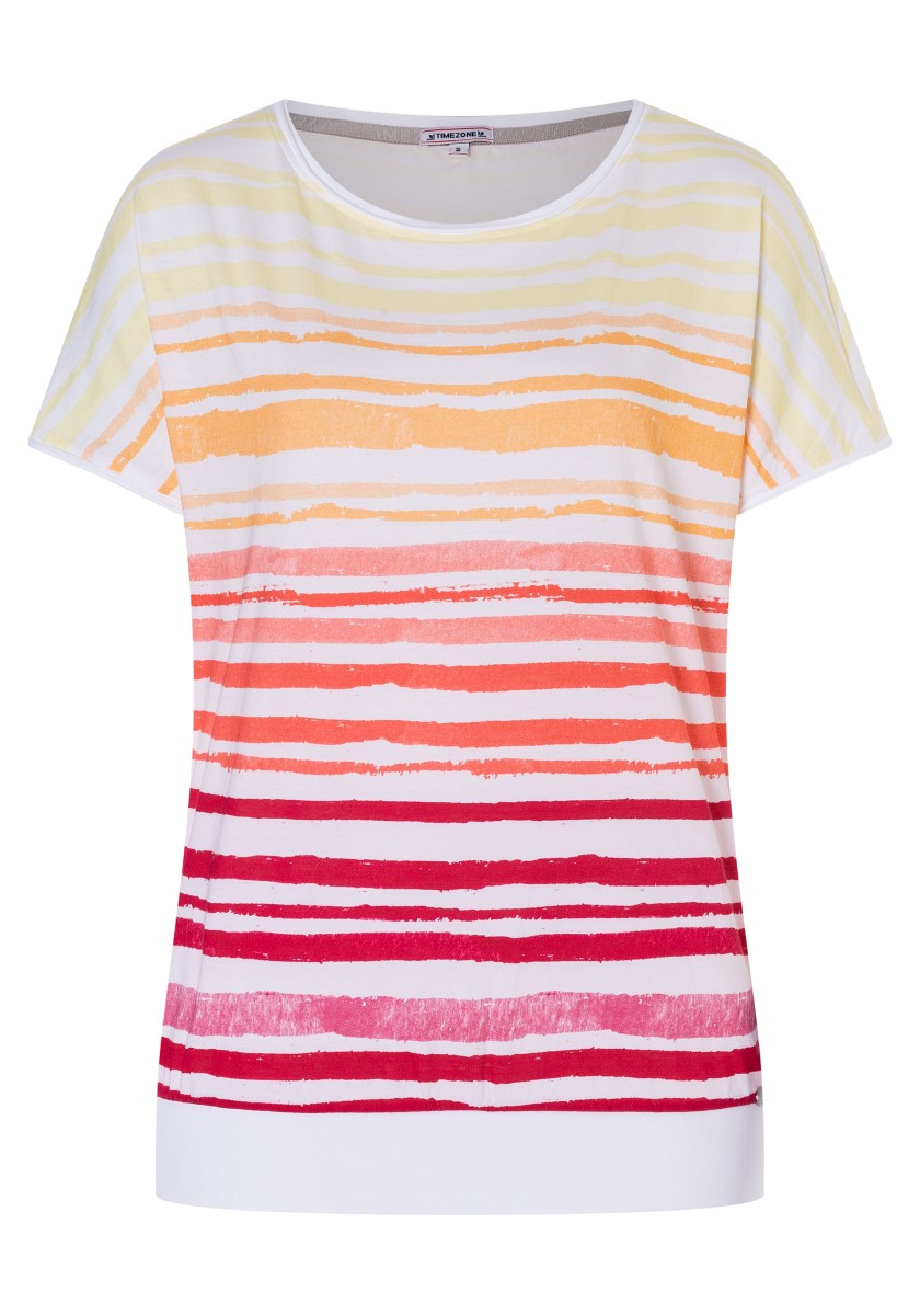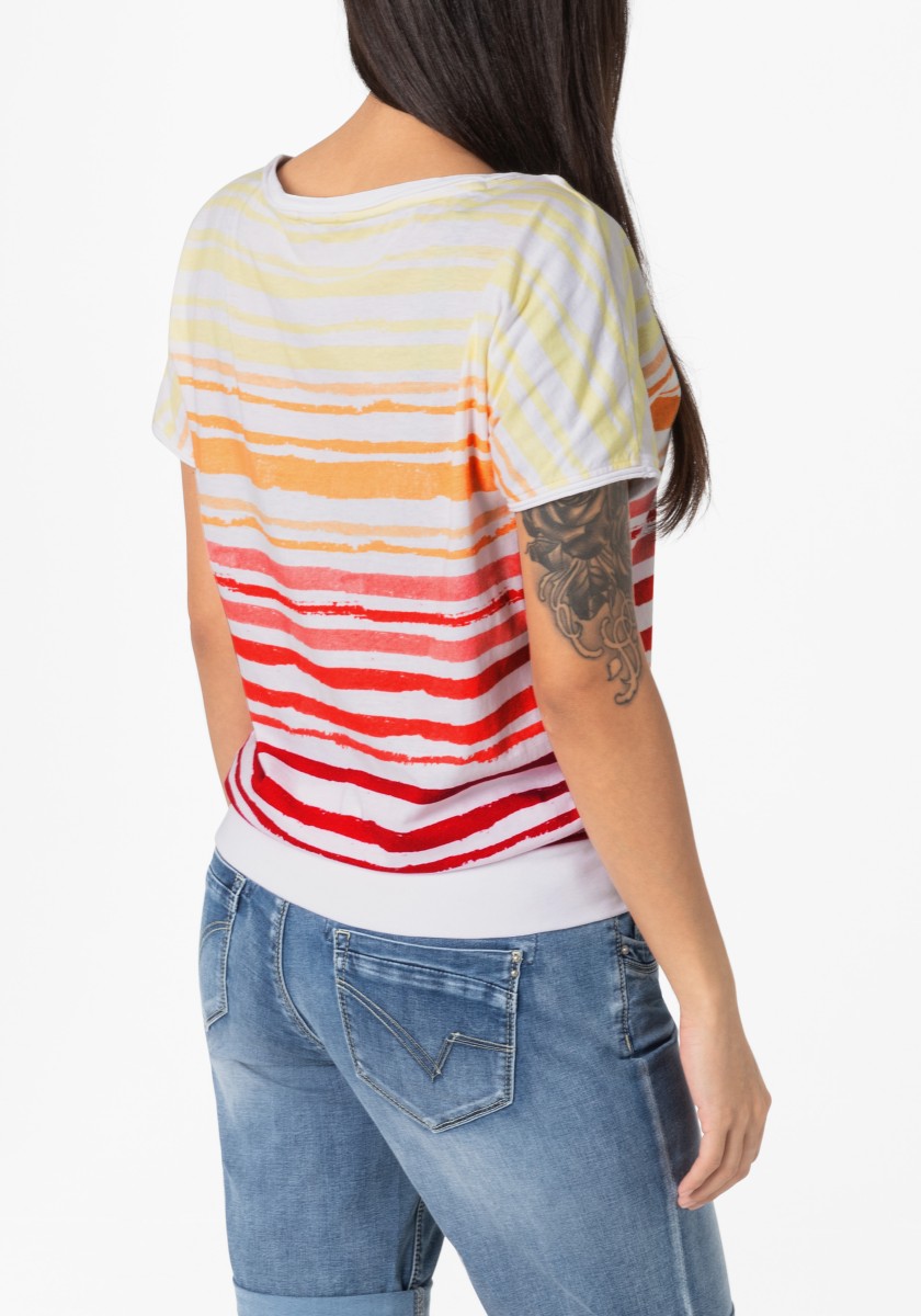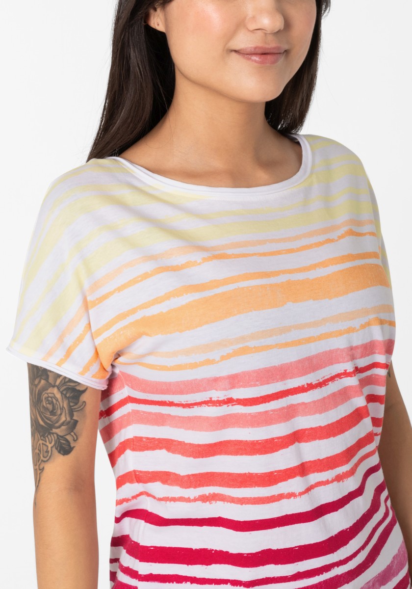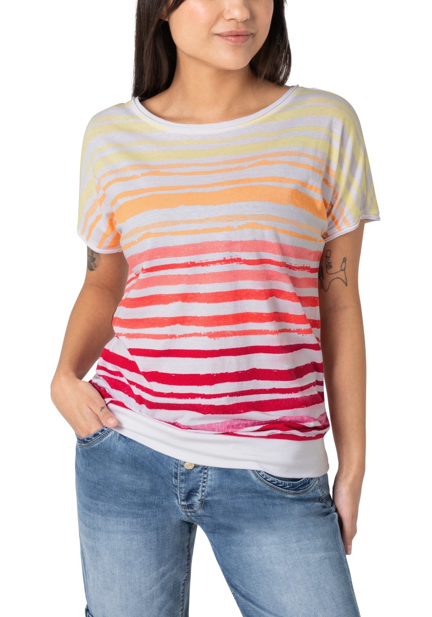 A well -known trend is returning: a striped shirt. The casual piece was newly interpreted by an elastic, fine ribbed hem and a wide cut. Single Jersey: Lightweight, made of very soft cotton with smooth surface. A great model has a sports rolled boat neckline and cut sleeves with casual rolled edges. The striped pattern got a fresh, modern style and is characterized by a cold, artfully irregular destroyed look.