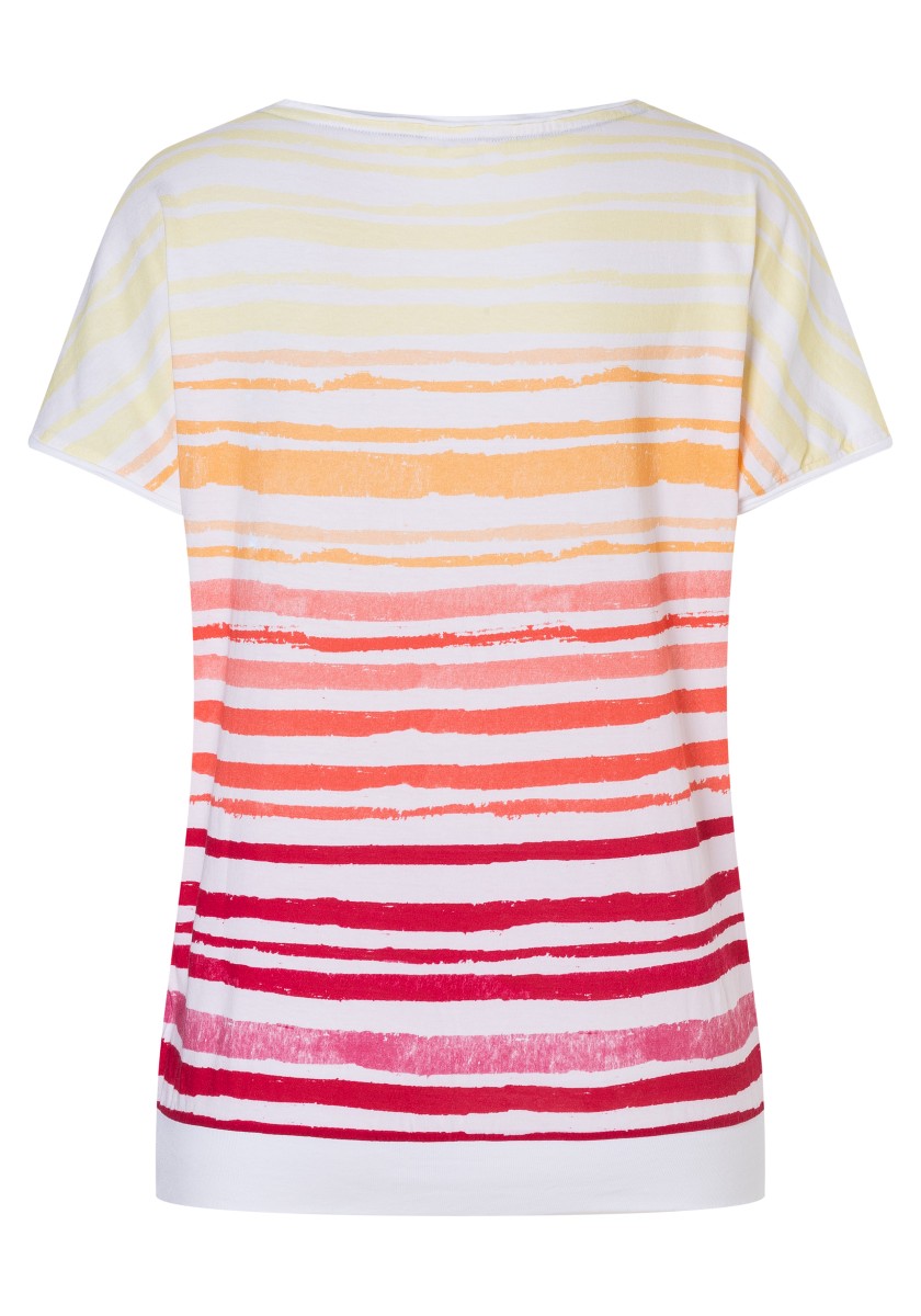 Vrací se známý trend: pruhovaná košile. Ležérní kousek byl nově interpretován elastickým, jemně žebrovaným lemem a širokým střihem. Single Jersey: lehký, vyrobený z velmi měkké bavlny s hladkým povrchem. Skvělý model má sportovní rolovaný lodičkový výstřih a střižené rukávy s ležérním rolovaným zakončením okrajů. Pruhovaný vzor dostal svěží, moderní styl a vyznačuje se chladným, umně nepravidelným zničeným vzhledem.