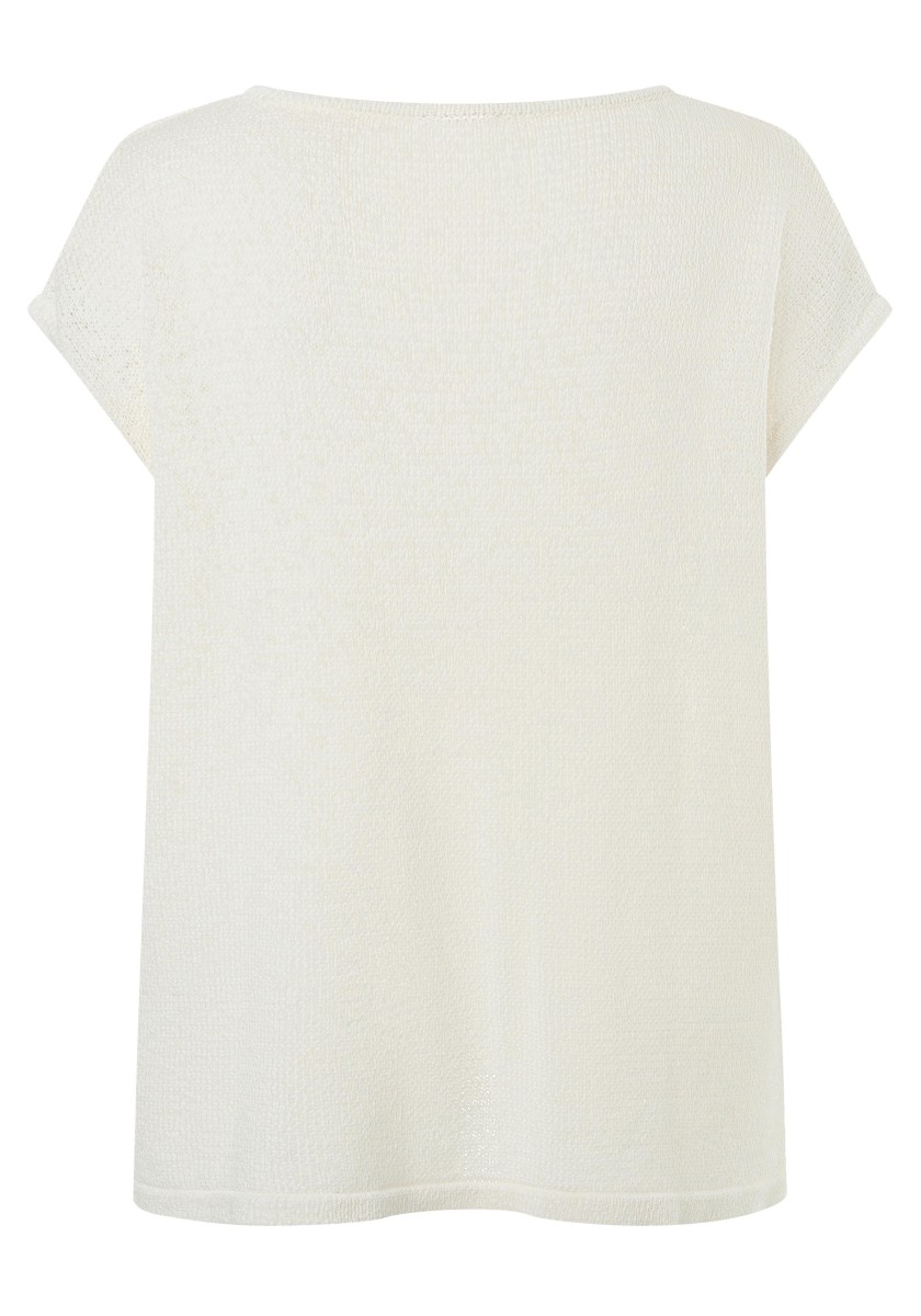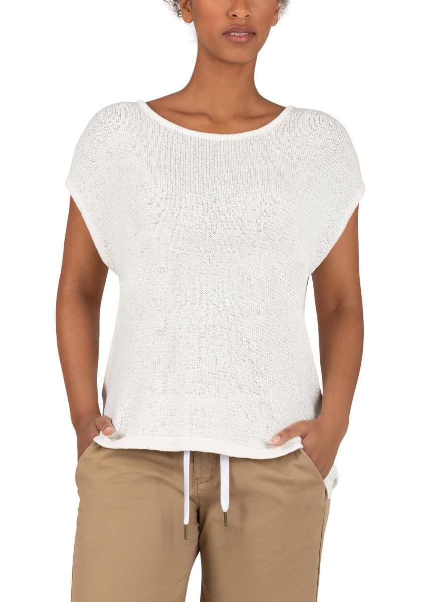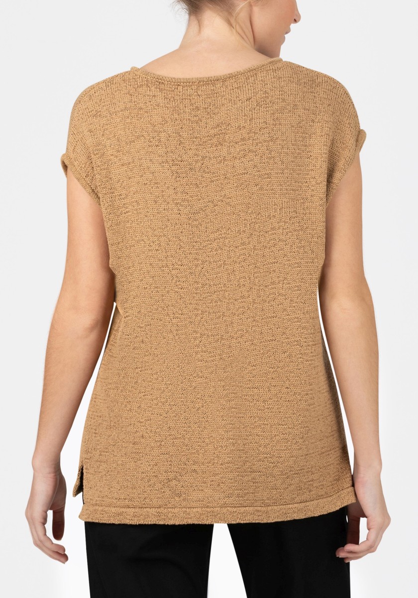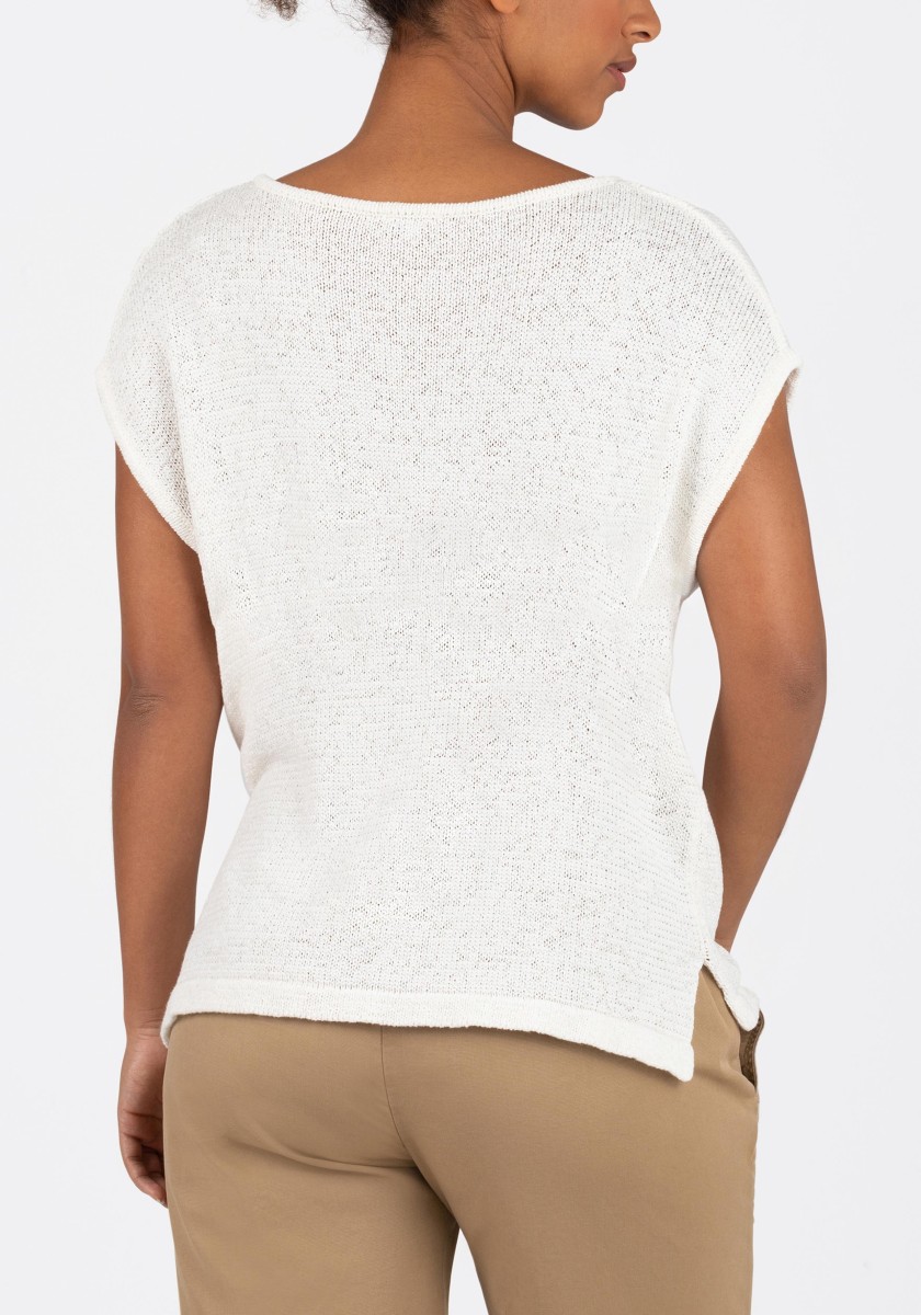 It can be combined in various ways, is ideal for a fashionable layered "more is more" look and is also perfect as a stand-alone piece: a sleeveless sweater. The cool mesh piece has a loose, relaxed fit with a wide neckline, dropped shoulders, deep armholes and a straight, draped hem. The high quality ribbon yarn in a summer cotton blend is ideal for warm days, it is airy and breezy and has a dry, slightly cool feel.