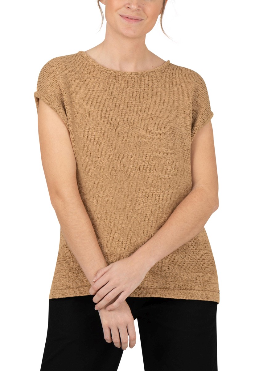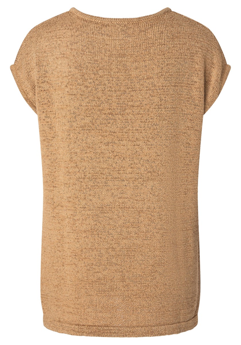 Dá se různě kombinovat, je ideální pro módní vrstvený vzhled "více je více" a skvěle se hodí i jako samostatný kousek: svetr bez rukávů. Chladivý síťovaný kousek má volný, uvolněný střih s širokým výstřihem, spadlými rameny, hlubokými průramky a rovným, projmutým lemem. Kvalitní stuhová příze z letní bavlněné směsi je ideální pro teplé dny, je vzdušná a svěží a působí suchým, lehce chladivým dojmem.