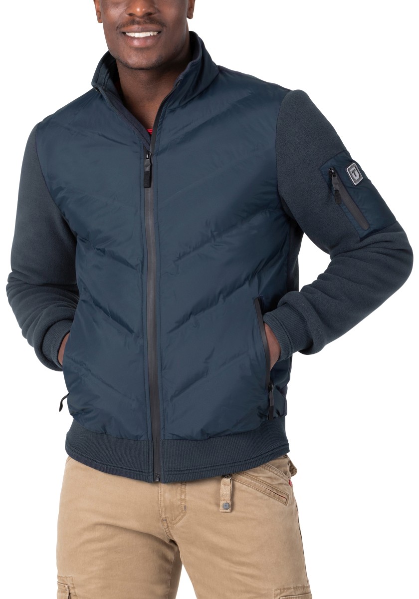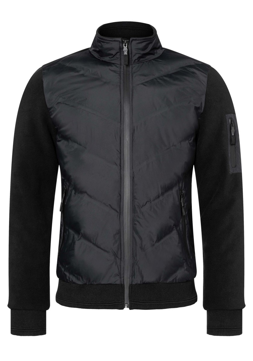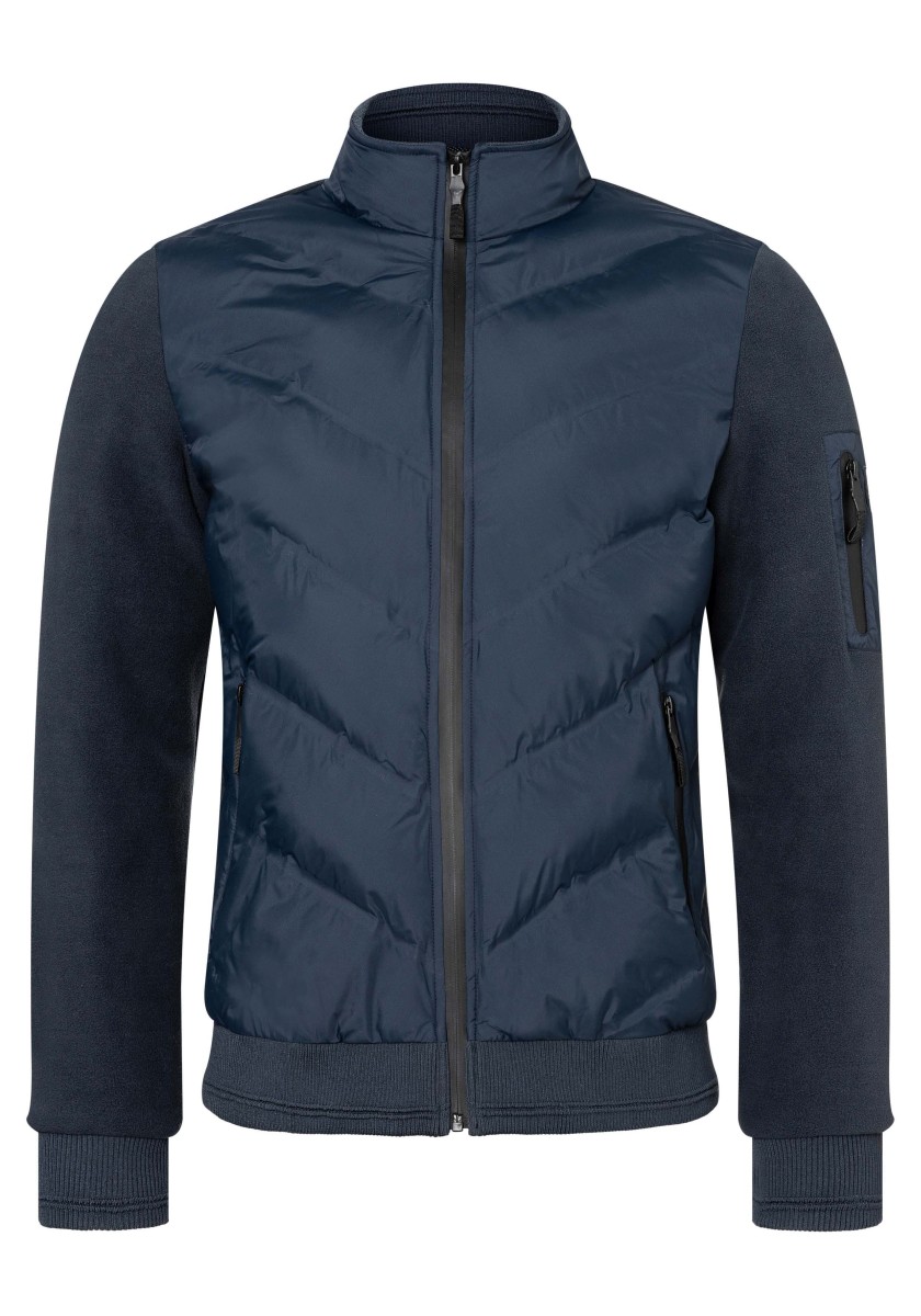 Elegant, sporty look: casual tracksuit-style jacket made of extremely soft, smooth interlock jersey with a subtle melange effect. Classic cut with a high stand-up collar, double lining, lightly padded and quilted shoulders, slanted lined pockets and ribbed cuffs and hem. Attention to detail: contrast neck tape, metal zip with logo tag and quality labelling.