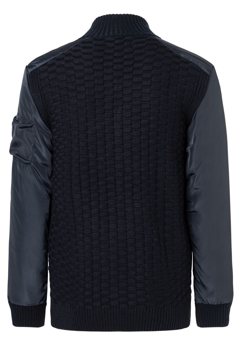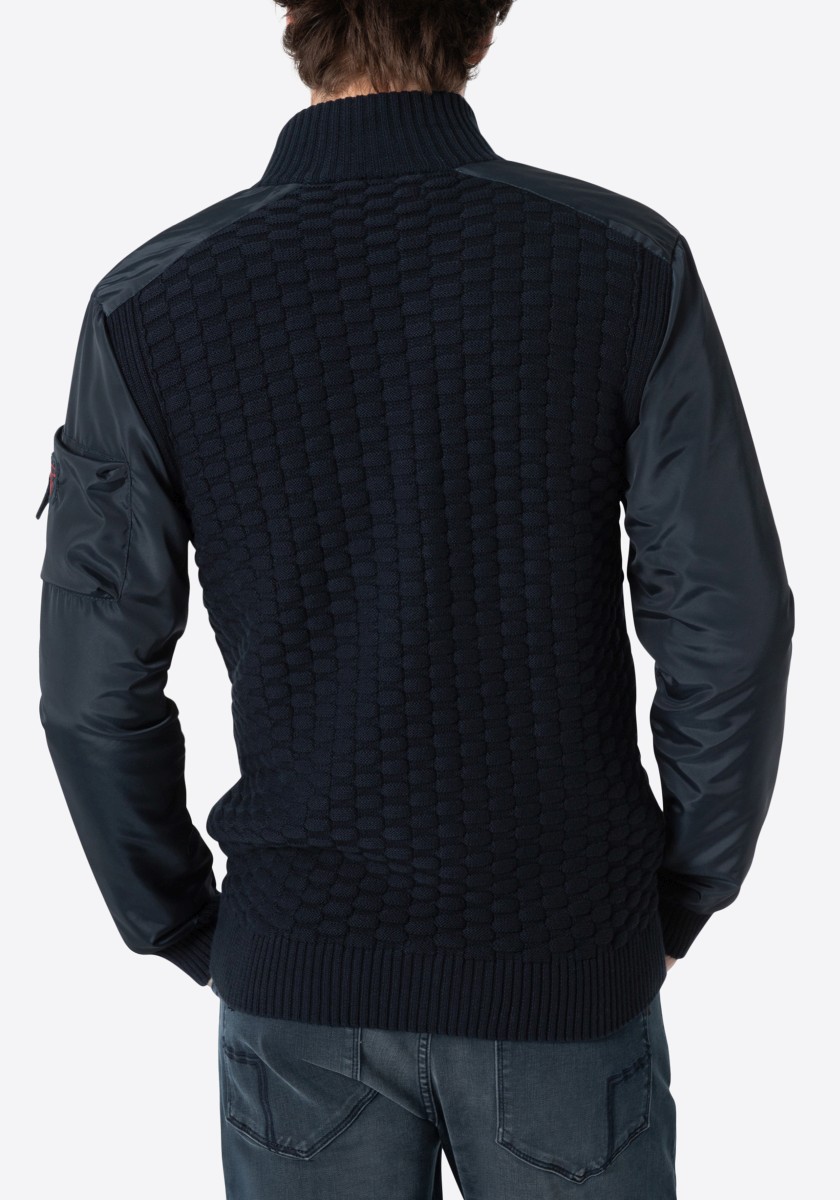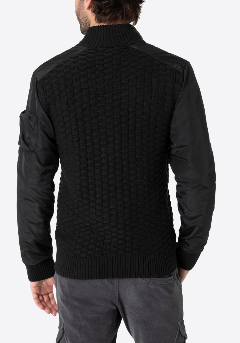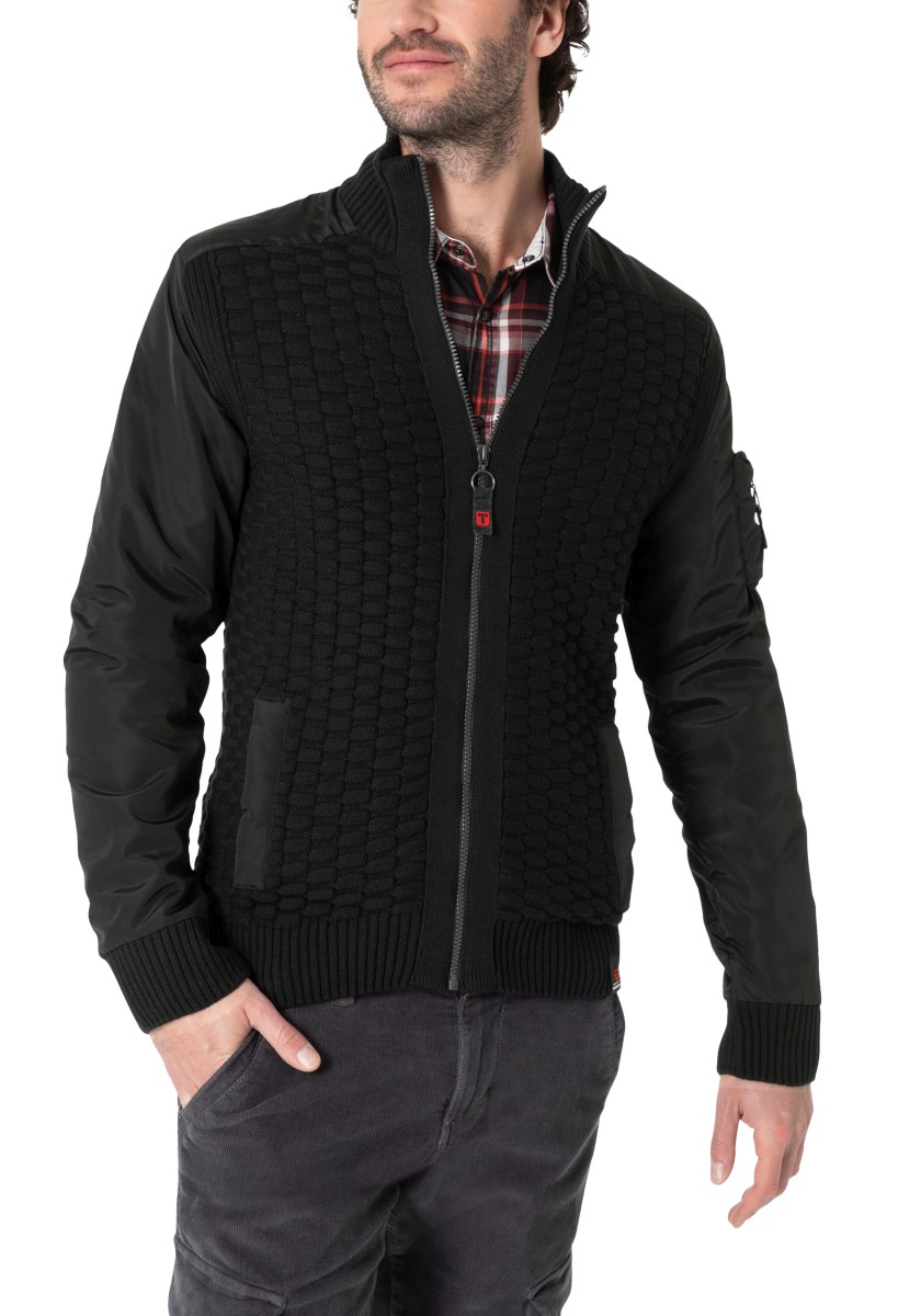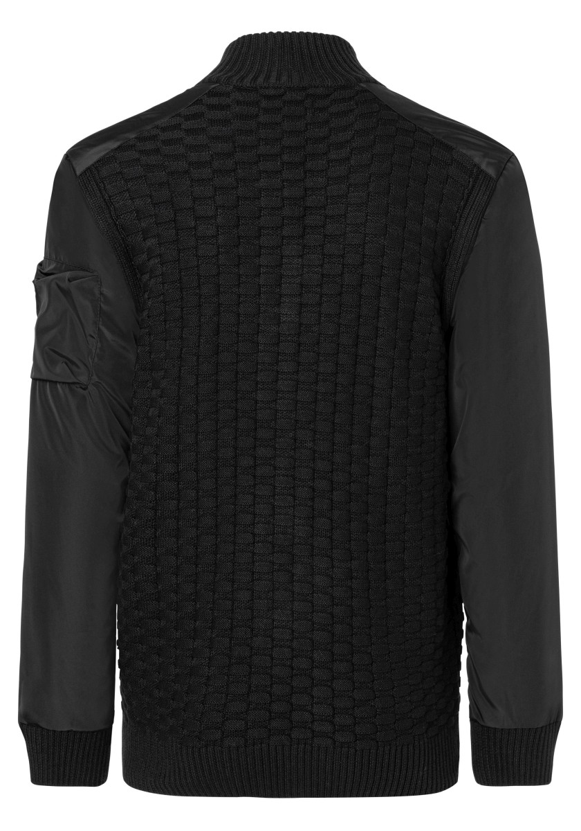 New, innovative and unconventional interpretations of bomber jackets: Super casual hybrid model with robust knit with shoulders and sleeves in nylon look. The jacket has an unusual striking 3D mesh structure, a robust front zipper, a ribbed stand and ribbed cuffs on the sleeves and hem. Practical: two pockets. Cardigan was refined with a zippered pocket on the left sleeve. Editors' note: Combine slim fit with black jeans.