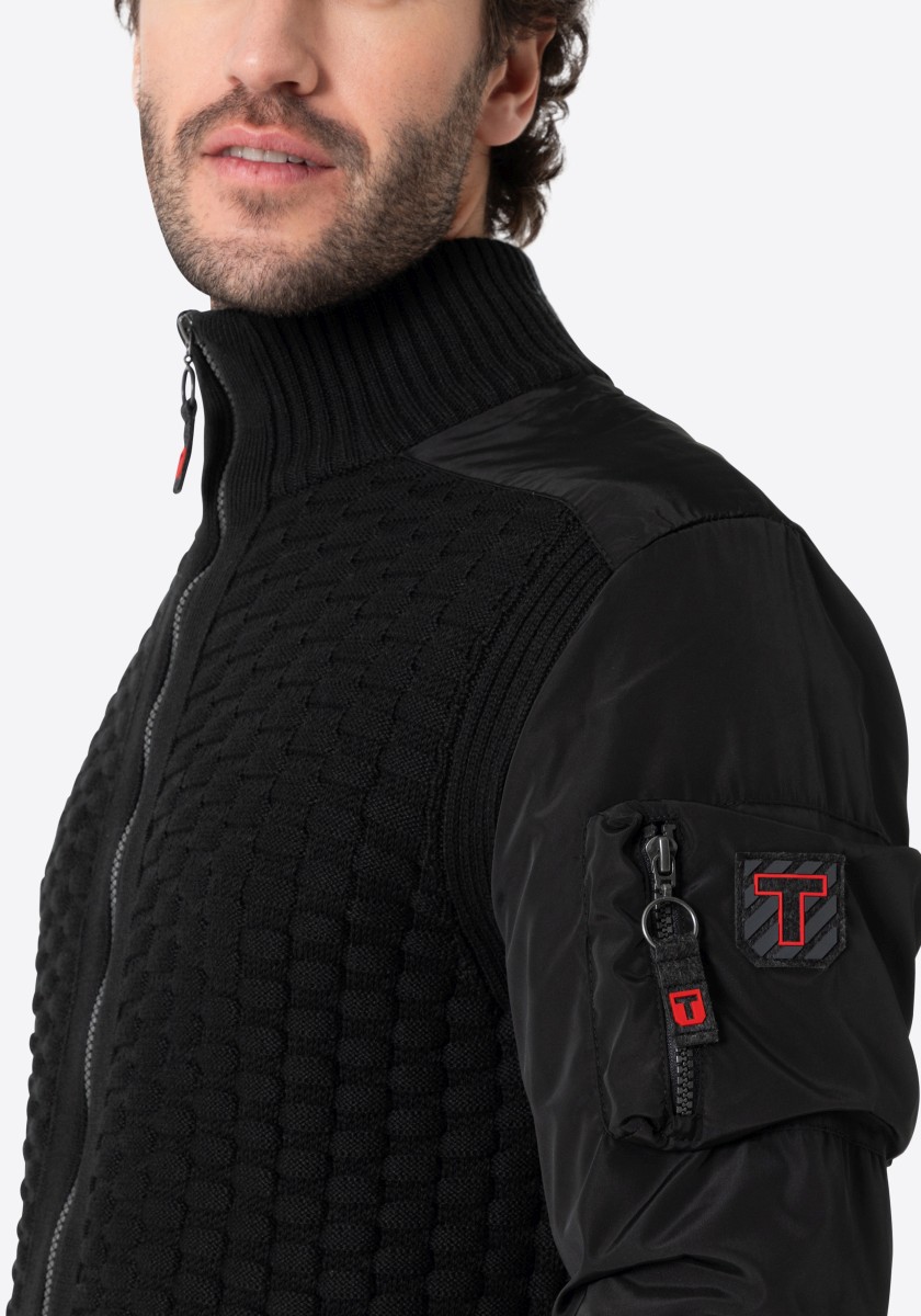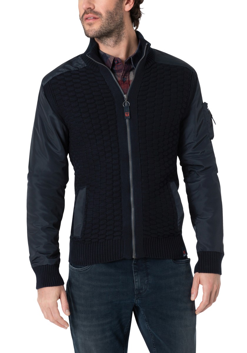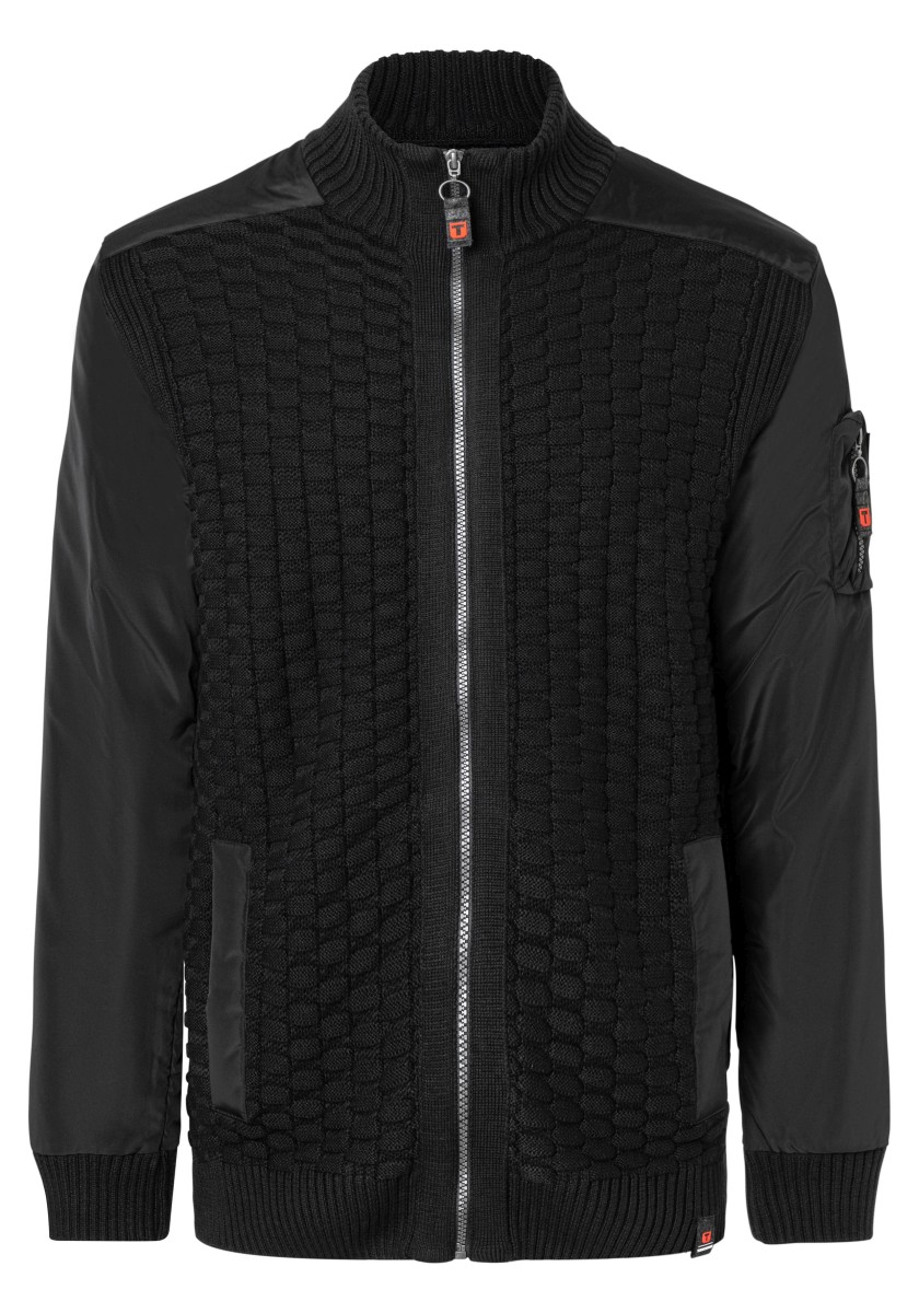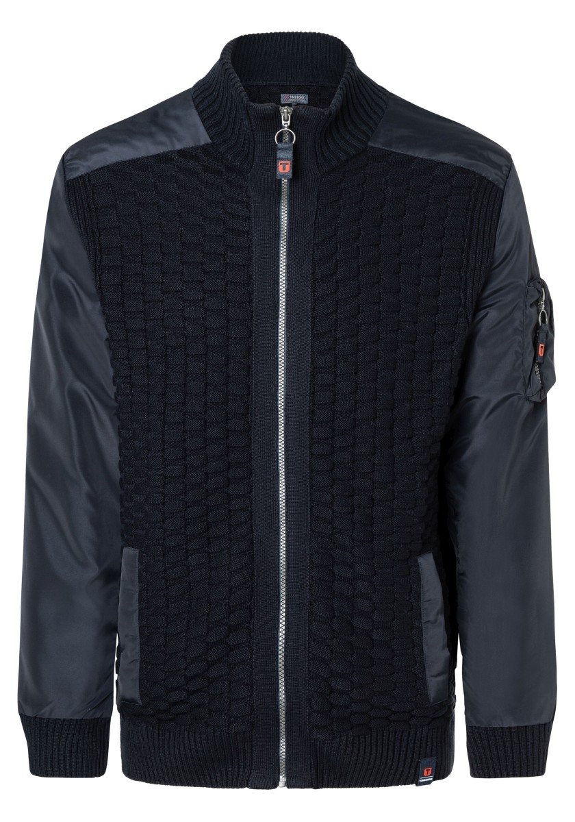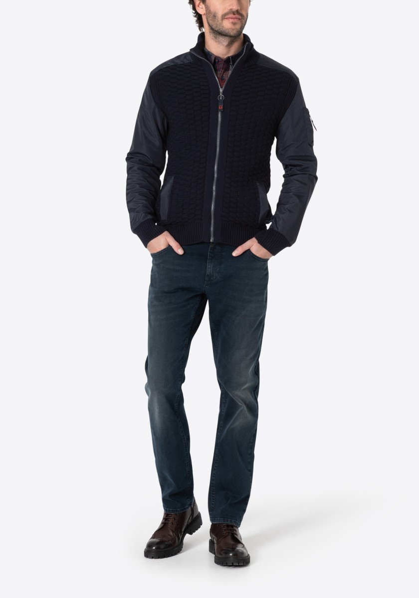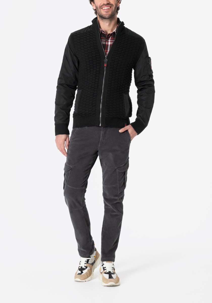 New, innovative and unconventional interpretations of bomber jackets: Super casual hybrid model with robust knit with shoulders and sleeves in nylon look. The jacket has an unusual striking 3D mesh structure, a robust front zipper, a ribbed stand and ribbed cuffs on the sleeves and hem. Practical: two pockets. Cardigan was refined with a zippered pocket on the left sleeve. Editors' note: Combine slim fit with black jeans.